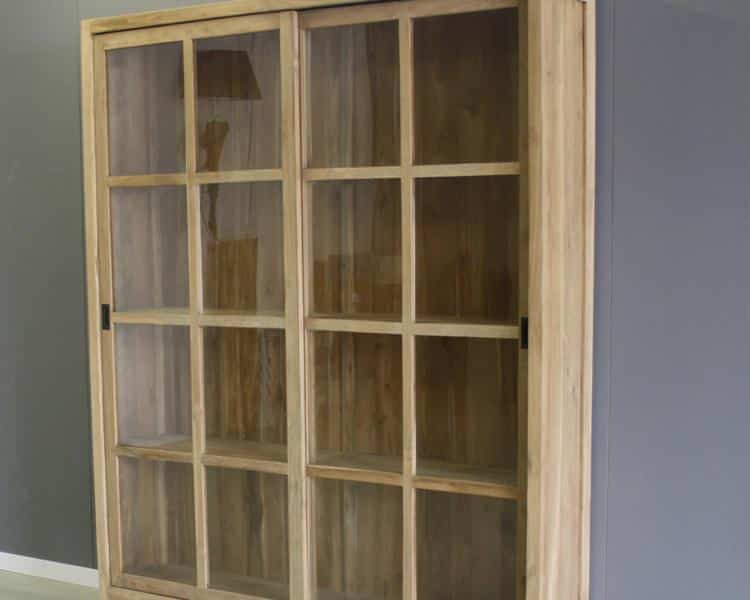 Boekenkast met twee schuifdeuren, deze boekenkast hebben we geleverd in Doetinchem. Hier is ook goed te zien dat teakhout heel mooi kleurt bij een groene wand.