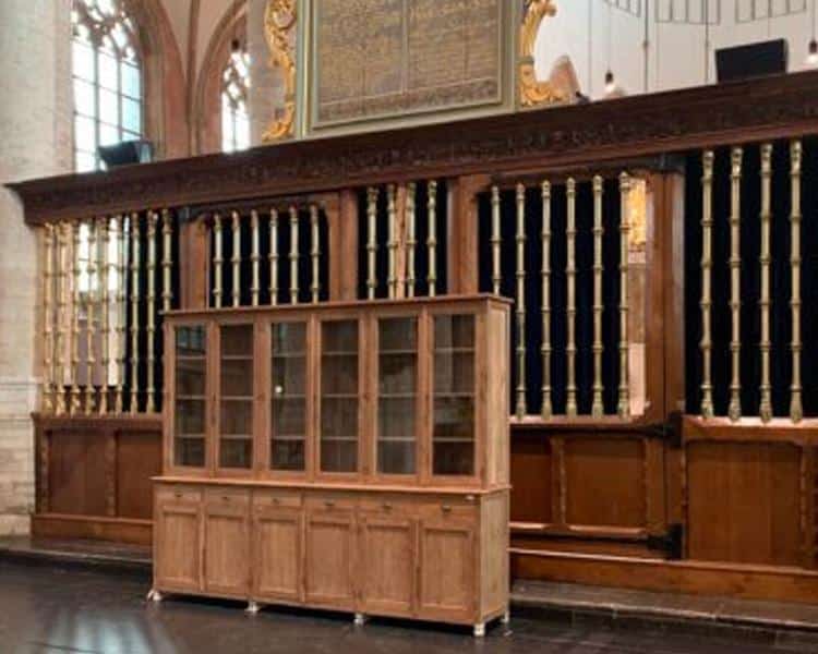 Grote buffetkast van dengkleh teakhout, een unieke kast op een nog uniekere locatie! Deze kast staat in de Pieterskerk in Leiden. Hier staat de kast als onderdeel van de bar.
