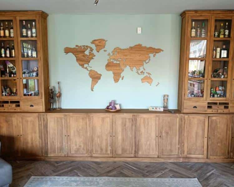 Een woonkamer vol met Indoteak! De buffetkast en het bureau zijn door de klant geolied voor een warmere uitstraling. Ook de dronken eenden in de kast komen bij Indoteak vandaan.