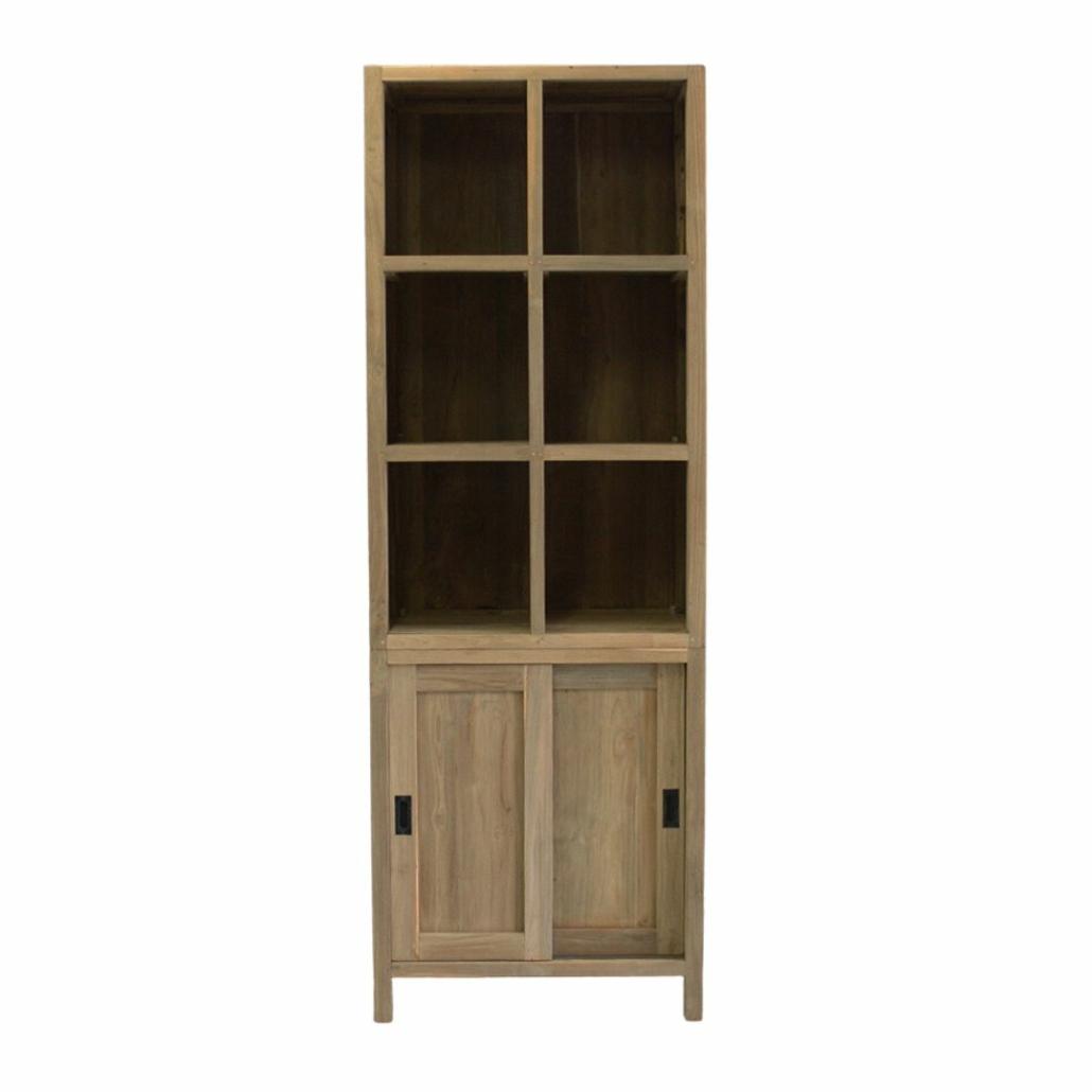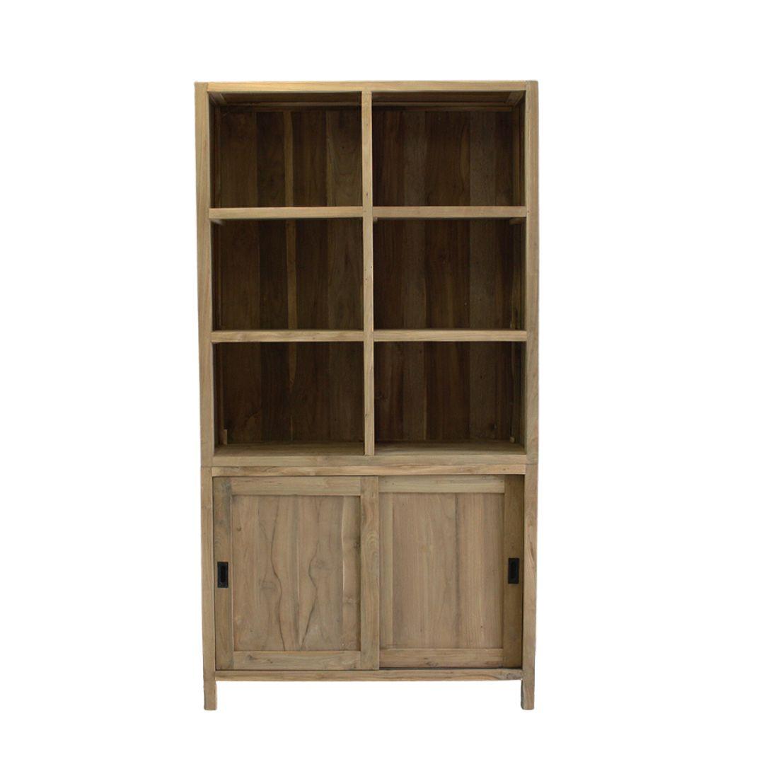 Fijne boekenkast met zes open vakken en twee schuifdeuren. Achter de schuifdeuren zit een extra plank. Dit is een ideale kantoorkast. De kast bestaat voor het transport uit twee delen.