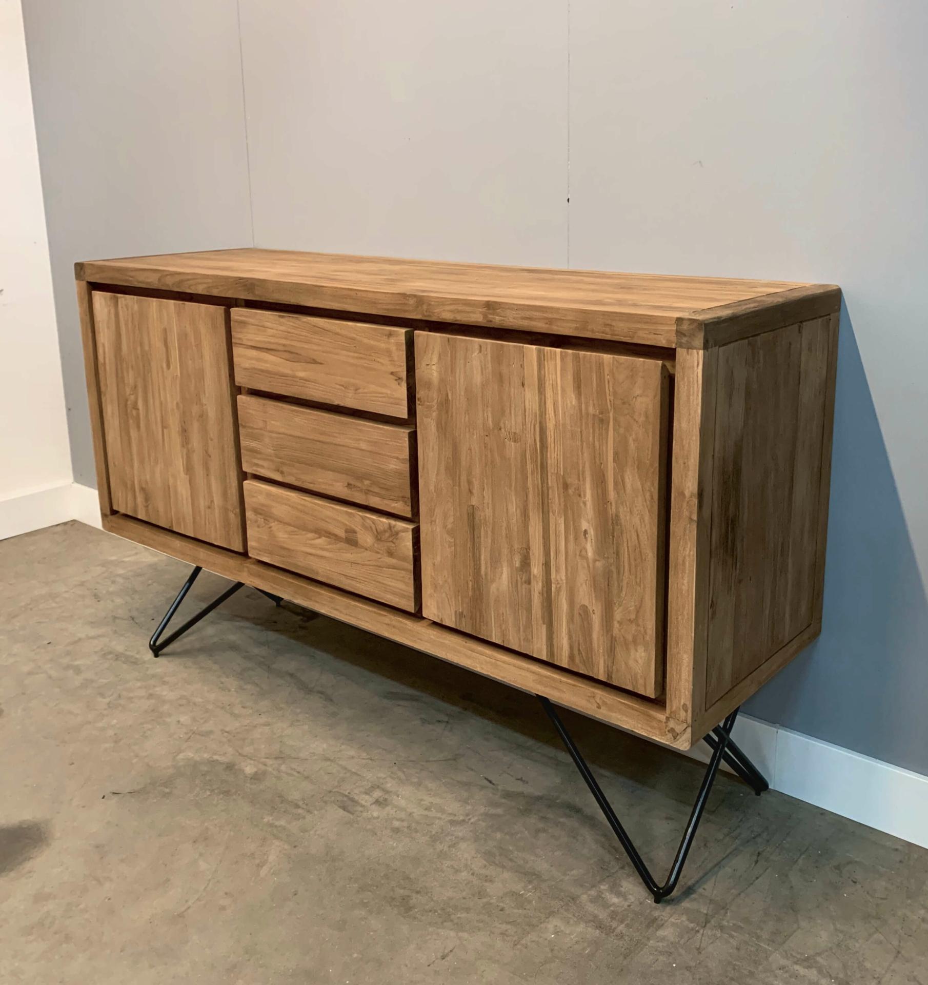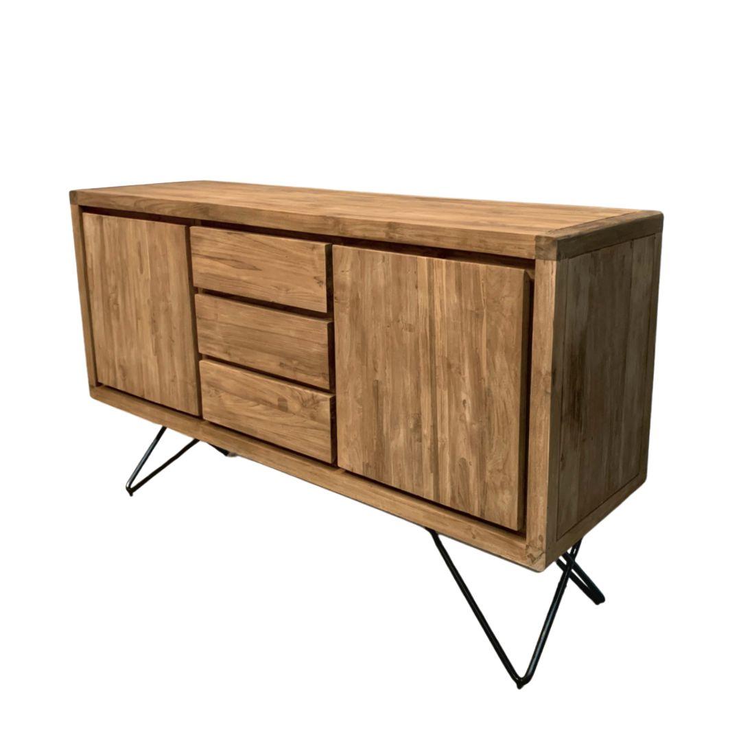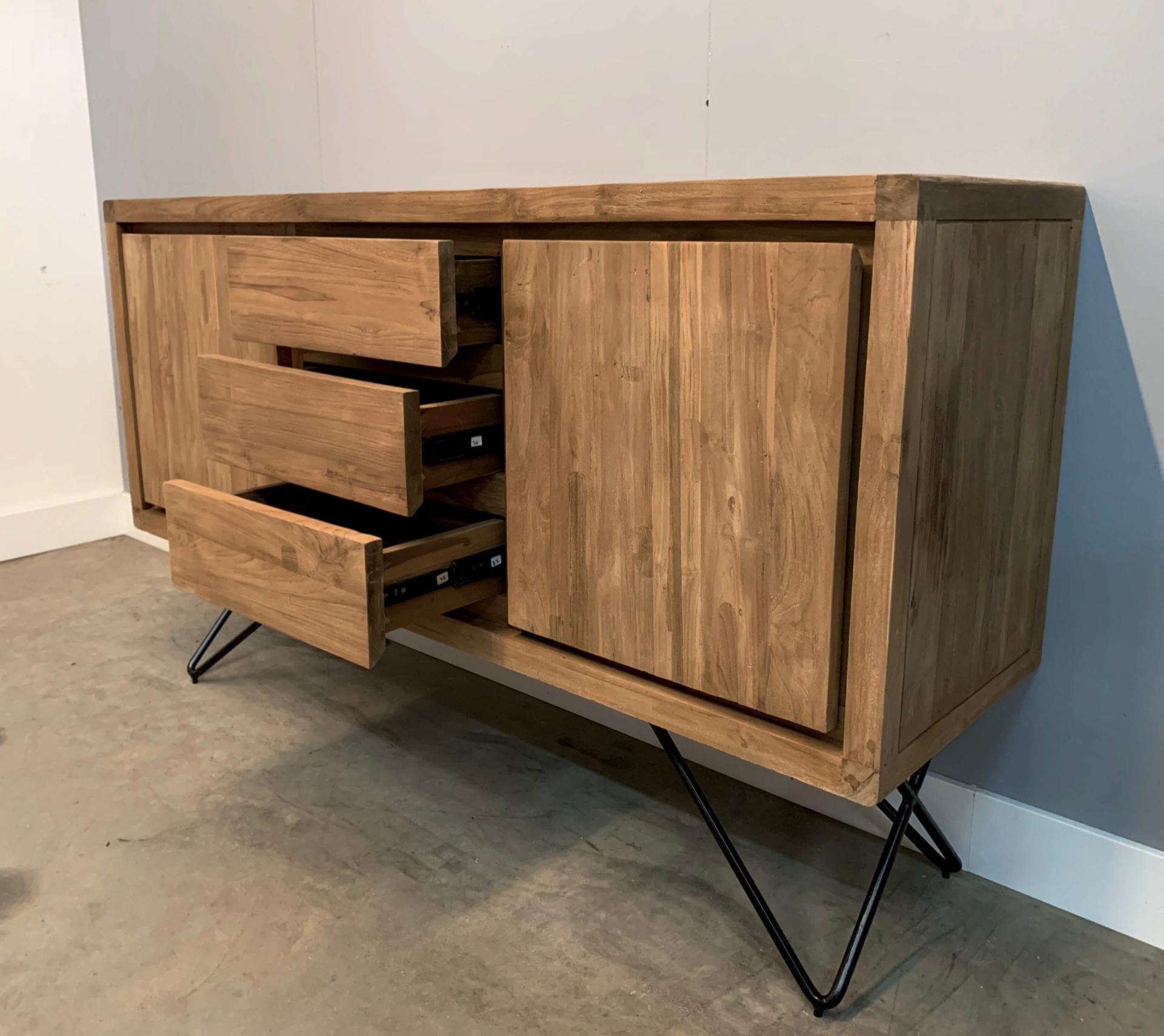 Breeze retro dressoir op stalen pootjes is ontworpen met een knipoog op de jaren 50, denk hierbij aan de afgeronde hoeken en verfijnde stalen poten. Voor dit meubel is uitsluitend de beste kwaliteit gerecycled teakhout gebruikt. Het hout is een klein beetje ruw gelaten voor een mooi contrast.