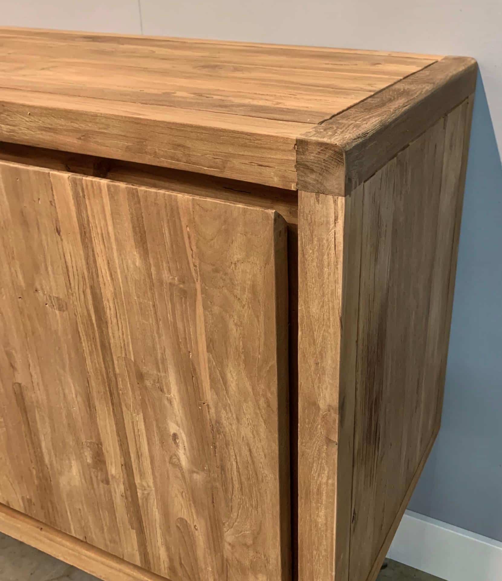 Onze fabriek in Indonesië gebruikt alleen hergebruikt teak. Het teakhout wordt terug gewonnen uit oude slooppanden. Het hout wordt verzameld en daarna klaar gemaakt voor hergebruik, denk aan het verwijderen van oude verflagen en het opvullen van spijkergaatjes. Hoewel elk breeze retro dressoir hetzelfde model heeft, is toch ieder kast uniek. Elk meubelstuk heeft zijn eigen unieke kenmerken dat komt door de opvul stukjes en natuurlijk kleurverschil van het hout. Oud hout heeft op een natuurlijke manier jaren kunnen drogen en werkt daarom veel minder dan plantage hout.