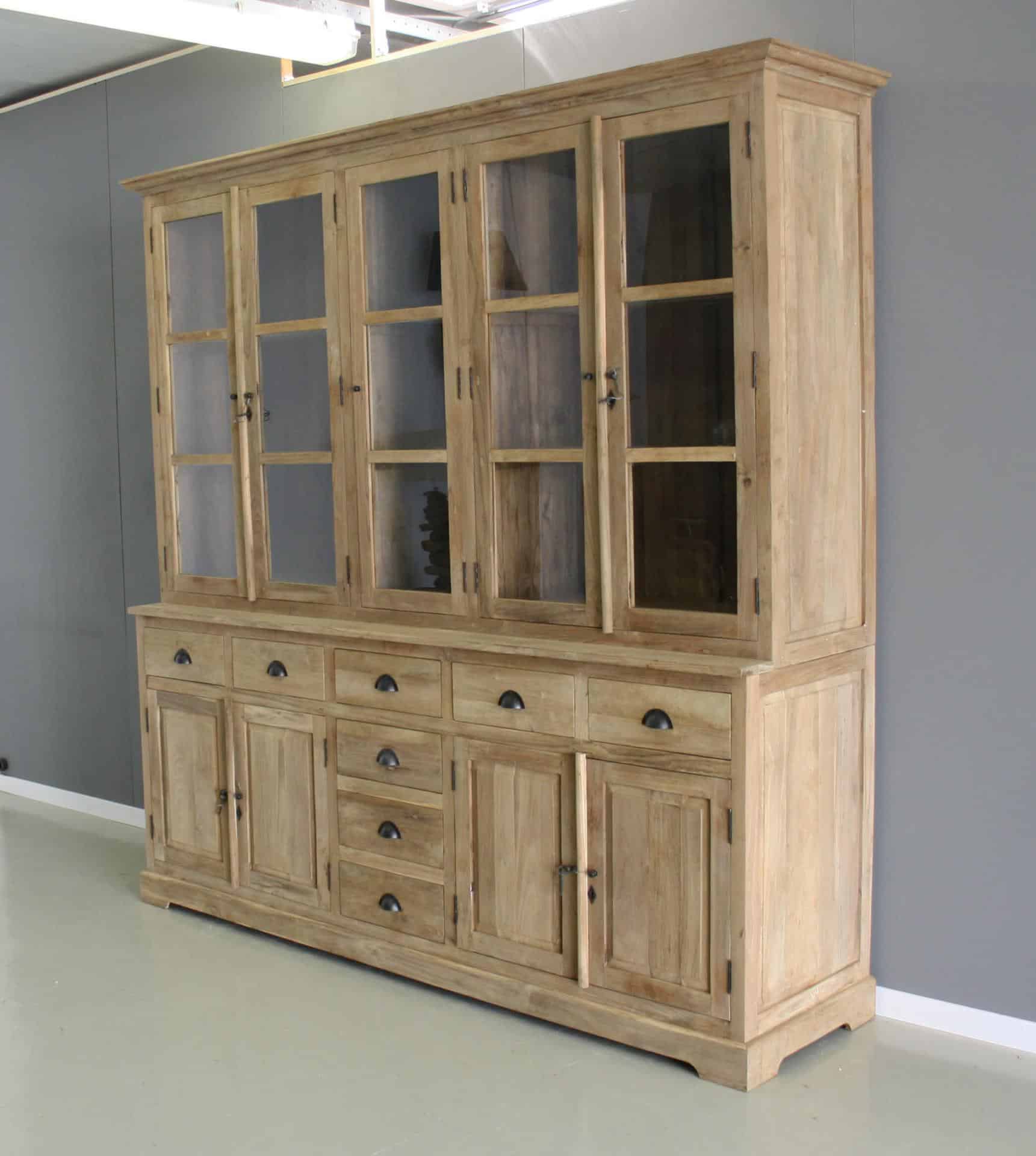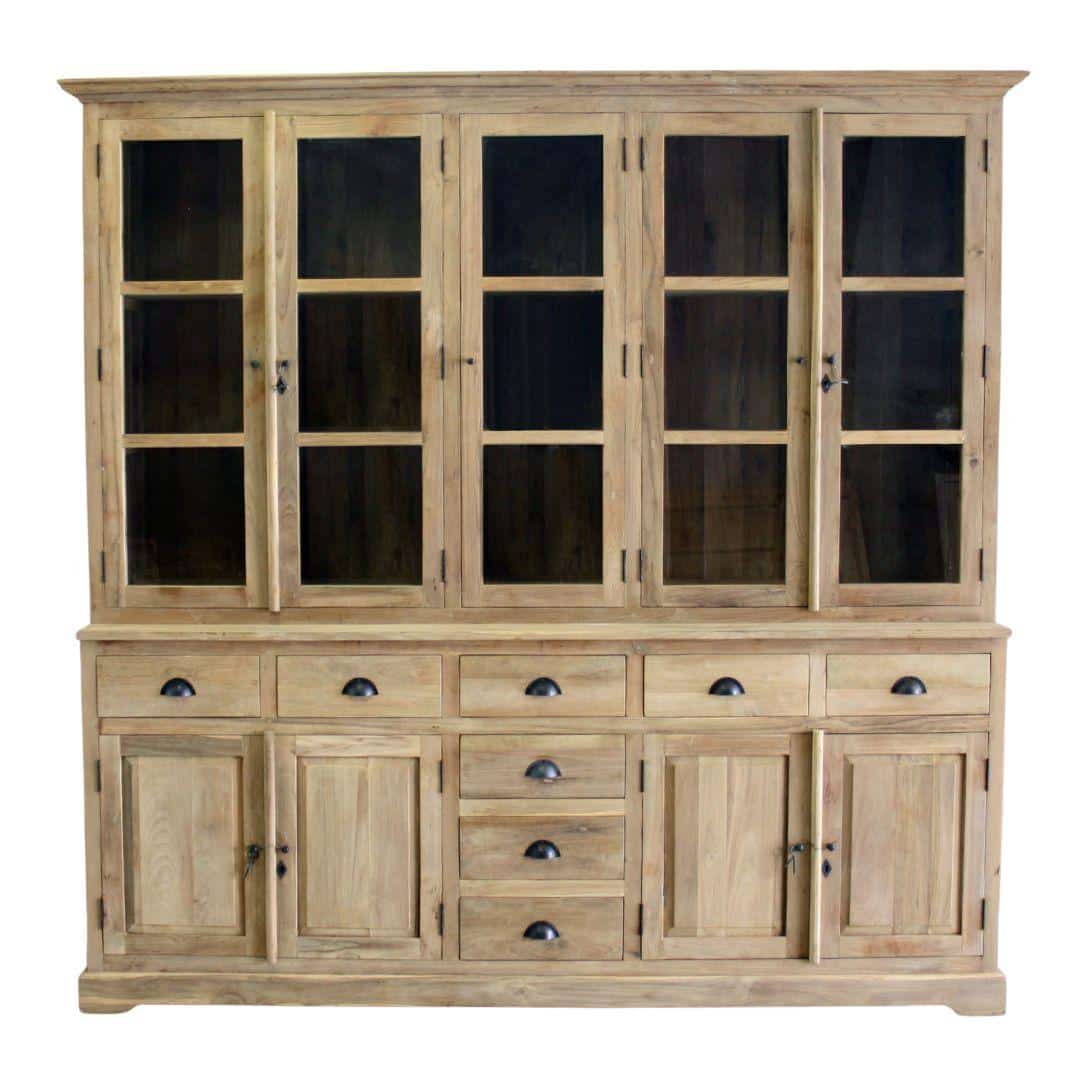 De indeling bestaat uit negen deuren en acht laden. In de teakhout bovenkast worden glazen of houten deuren gebruikt voor zichtbare of afgesloten presentatie, terwijl de onderkast extra opbergruimte biedt met lades en dichte deuren. De constructie van gerecycled teakhout geeft de kast een natuurlijke uitstraling, met subtiele variaties in kleur en nerf.