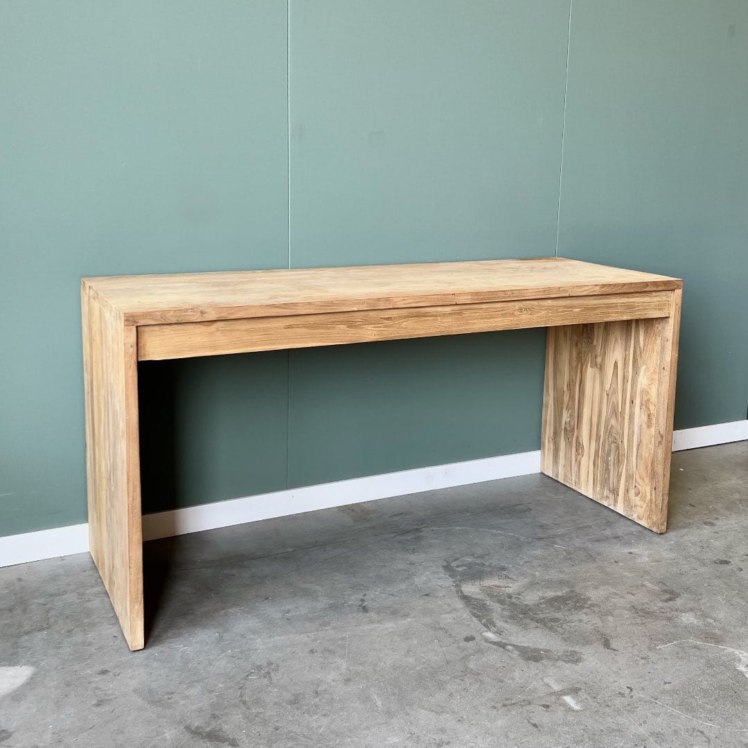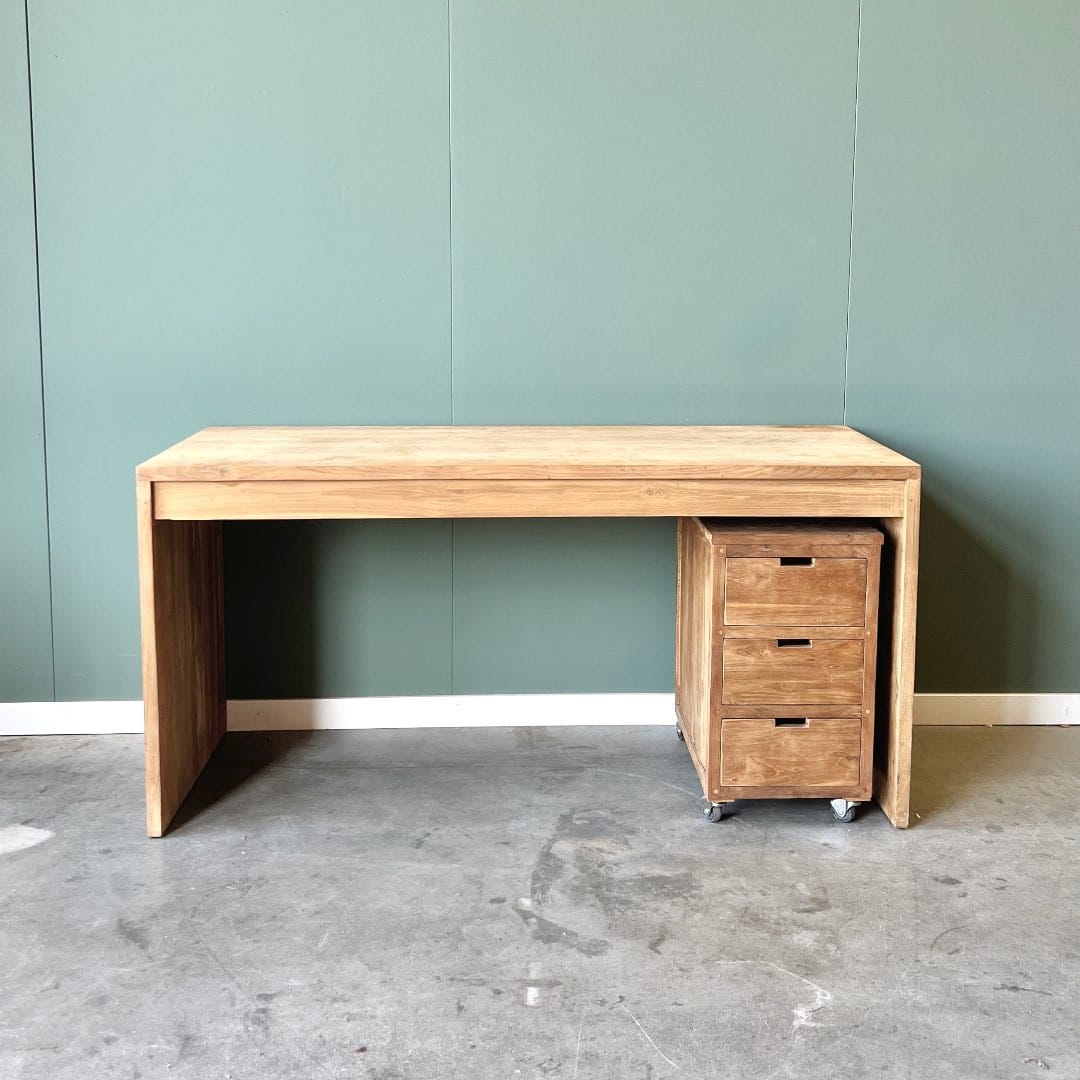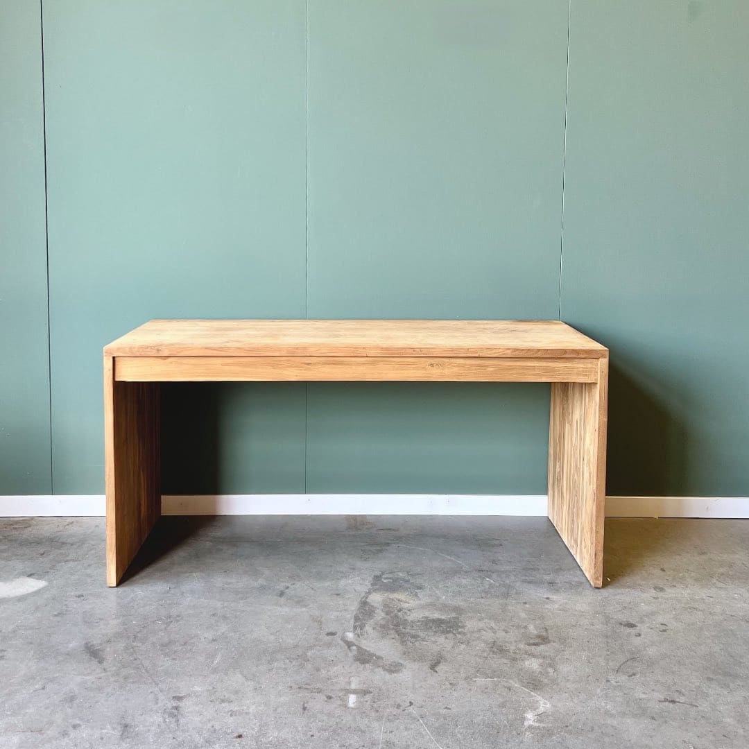 Upgrade je werkruimte met dit moderne bureau van gerecycled teakhout, FSC-gecertificeerd voor duurzame kwaliteit. Het strakke design past perfect in elk interieur, terwijl het bureau genoeg ruimte biedt voor al je werkbenodigdheden.
