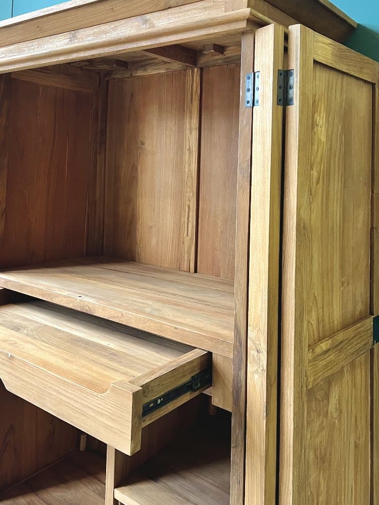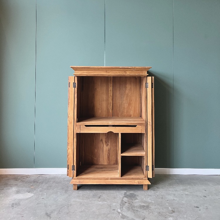 Deze computerkast van gerecycled teakhout biedt zowel een robuuste als duurzame oplossing voor je werkplek. Dankzij het ontwerp biedt de kast voldoende opbergruimte voor je computer, accessoires en kabels, terwijl het hout een warme en natuurlijke uitstraling toevoegt aan uw woonruimte. Het uitschuifplateau is voorzien van een metalen geleider.