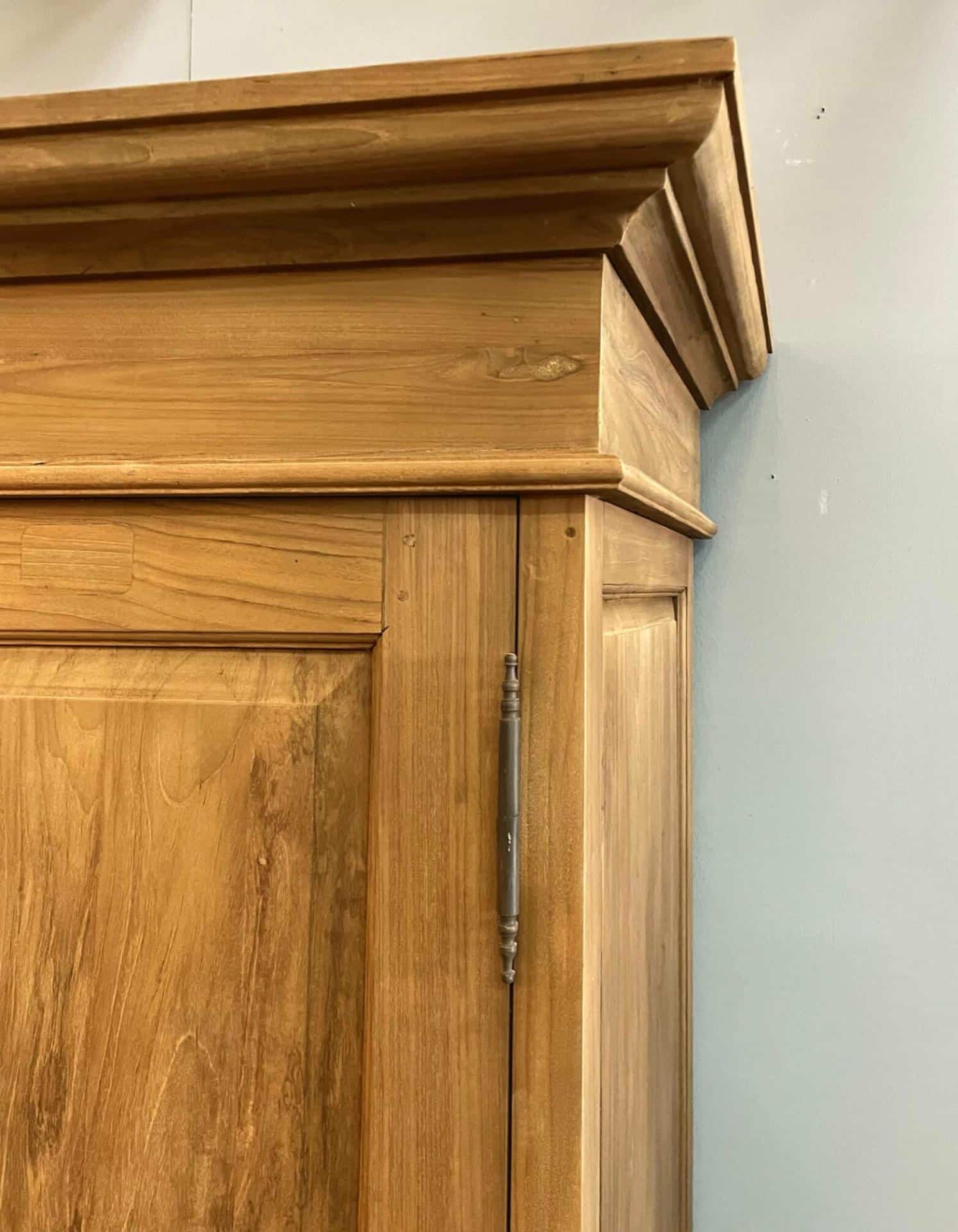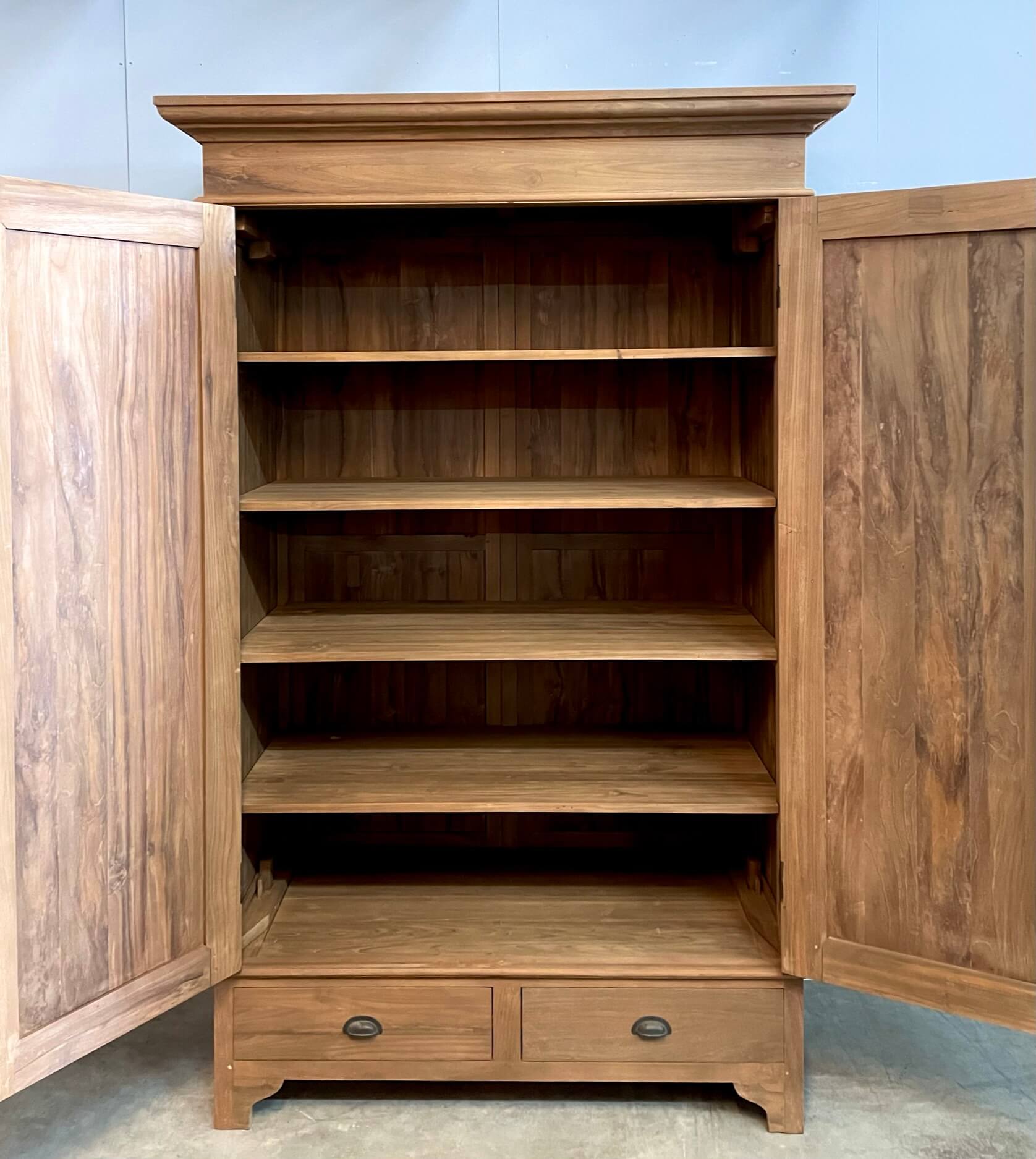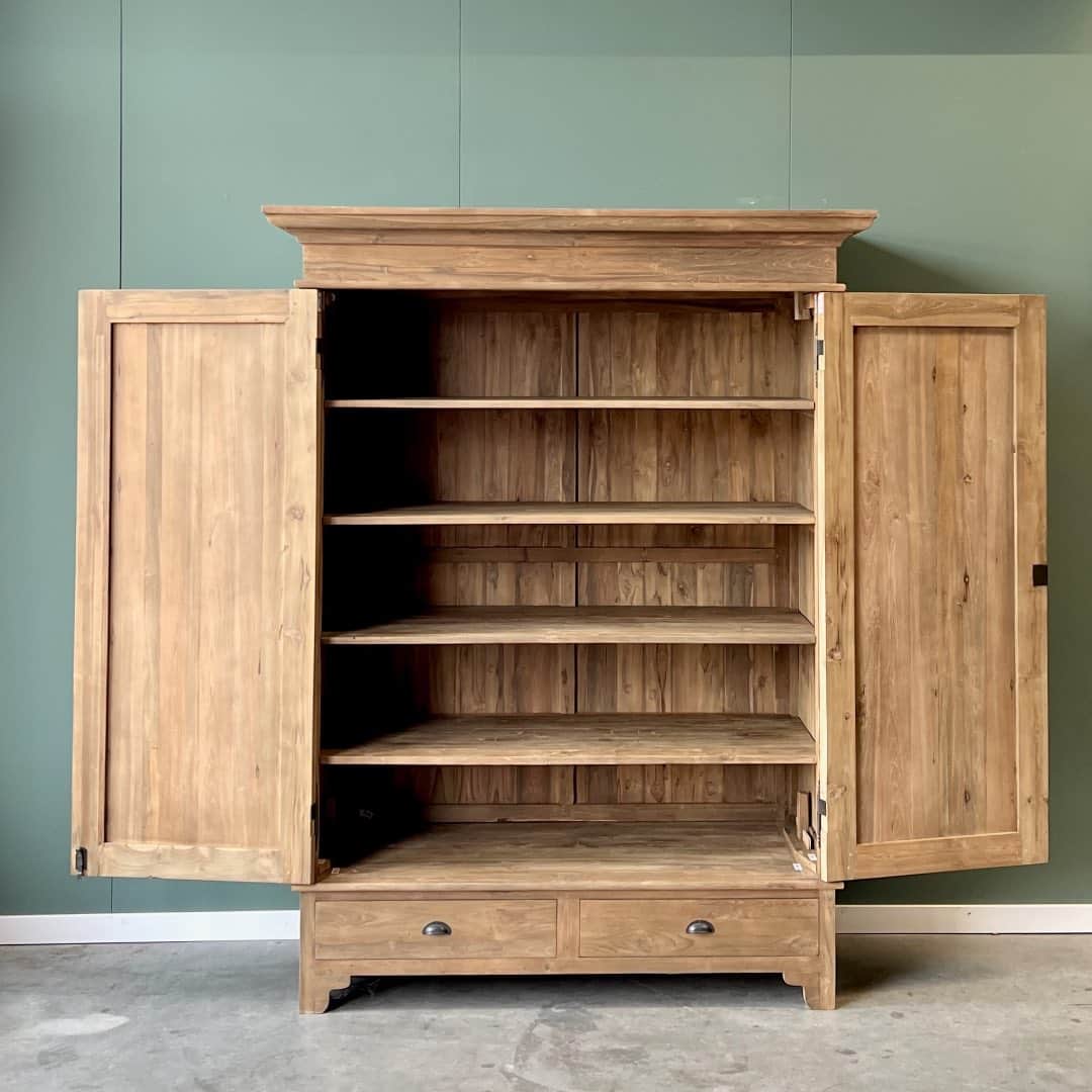 Deze prachtige teakkast van gerecycled teakhout heeft een klassieke, maar tijdloze uitstraling die in elk interieur tot zijn recht komt. De kast is voorzien van vijf ruime legplanken, ideaal voor het netjes opbergen van kleding, linnengoed of andere spullen.