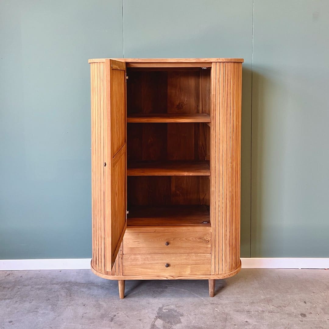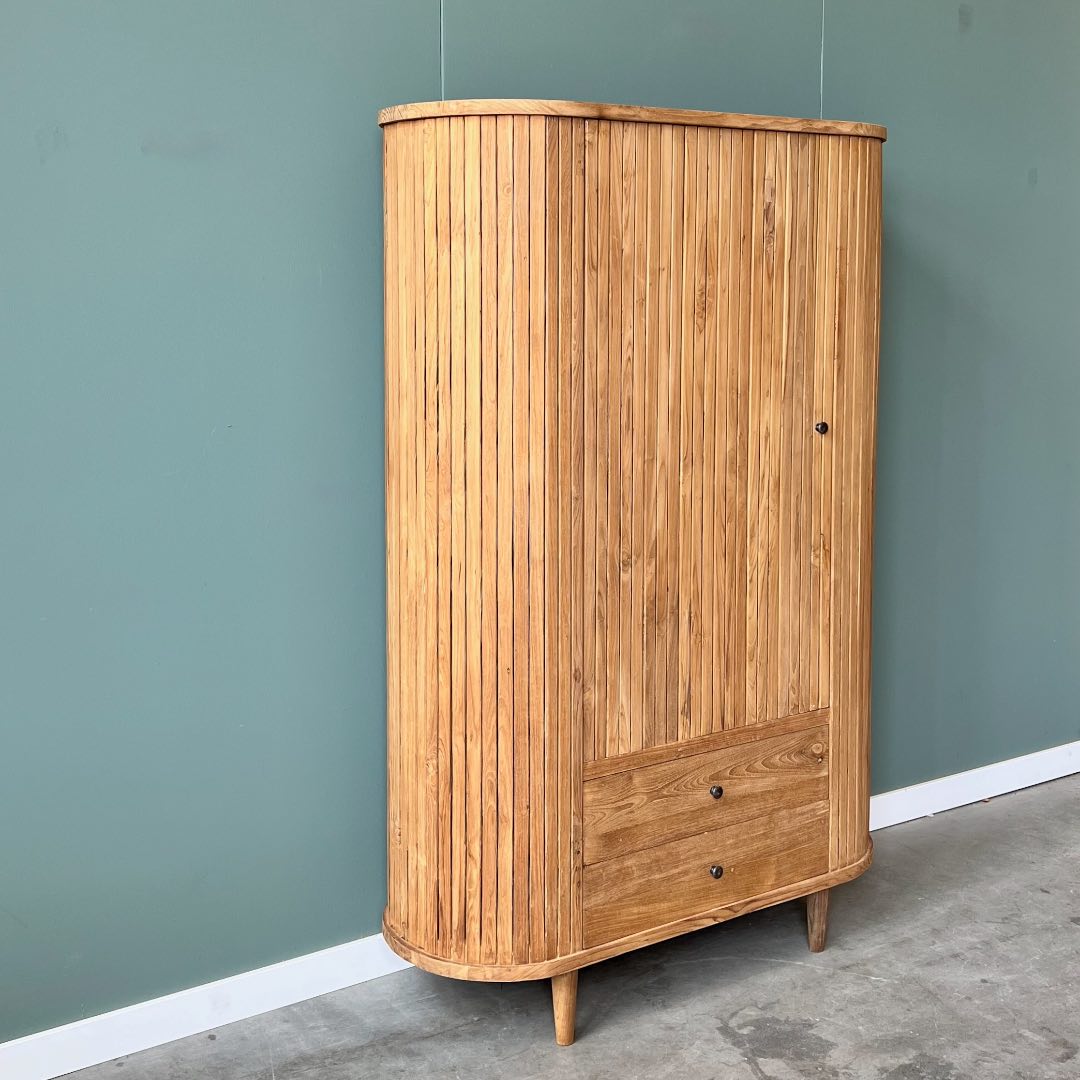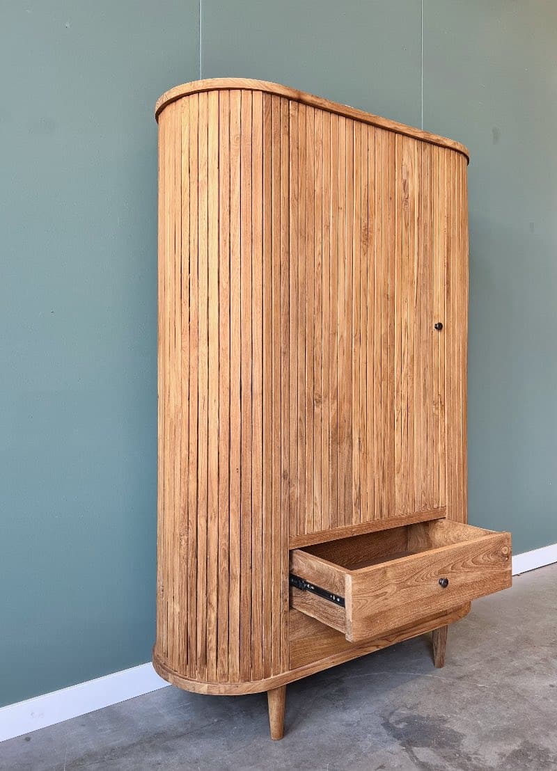 Deze prachtige kast van massief teakhout valt direct op door zijn stijlvolle ronde zijkanten en verticale lattenstructuur. Het warme hout geeft een natuurlijke, sfeervolle uitstraling, terwijl het unieke design een echte blikvanger is in je interieur.