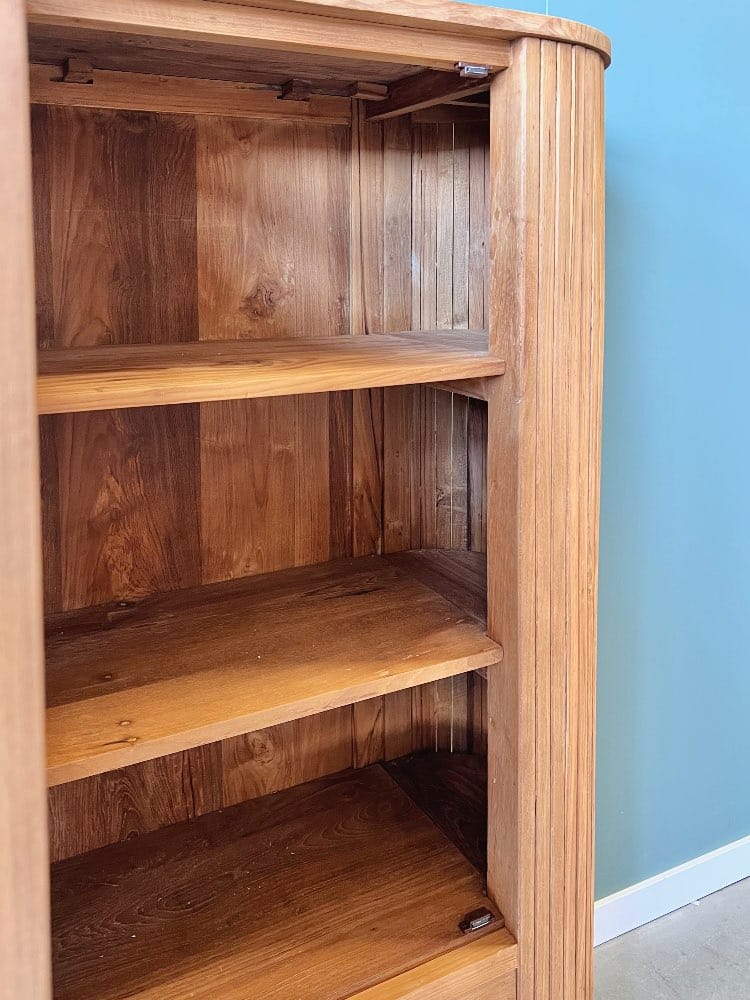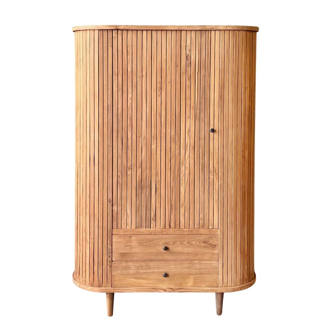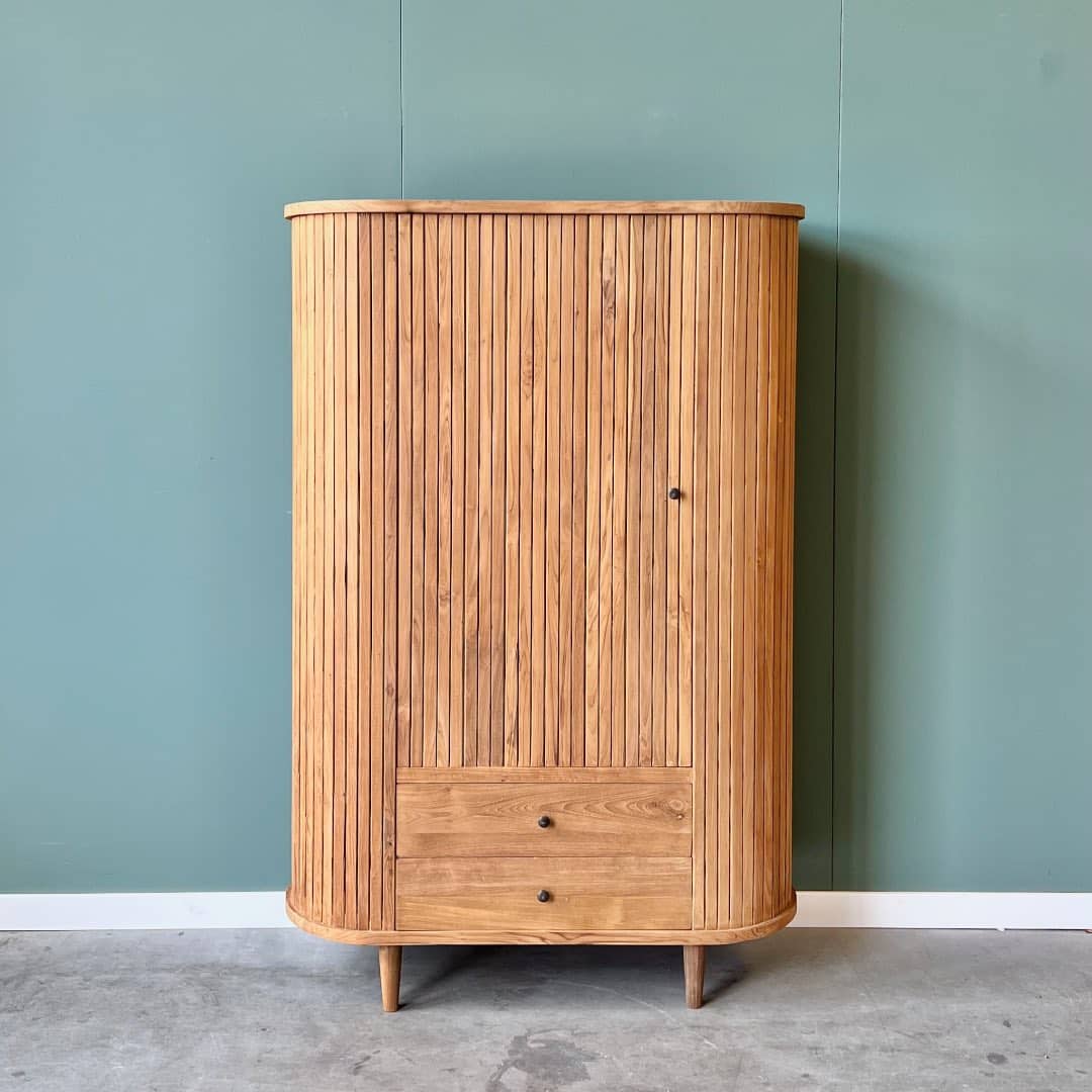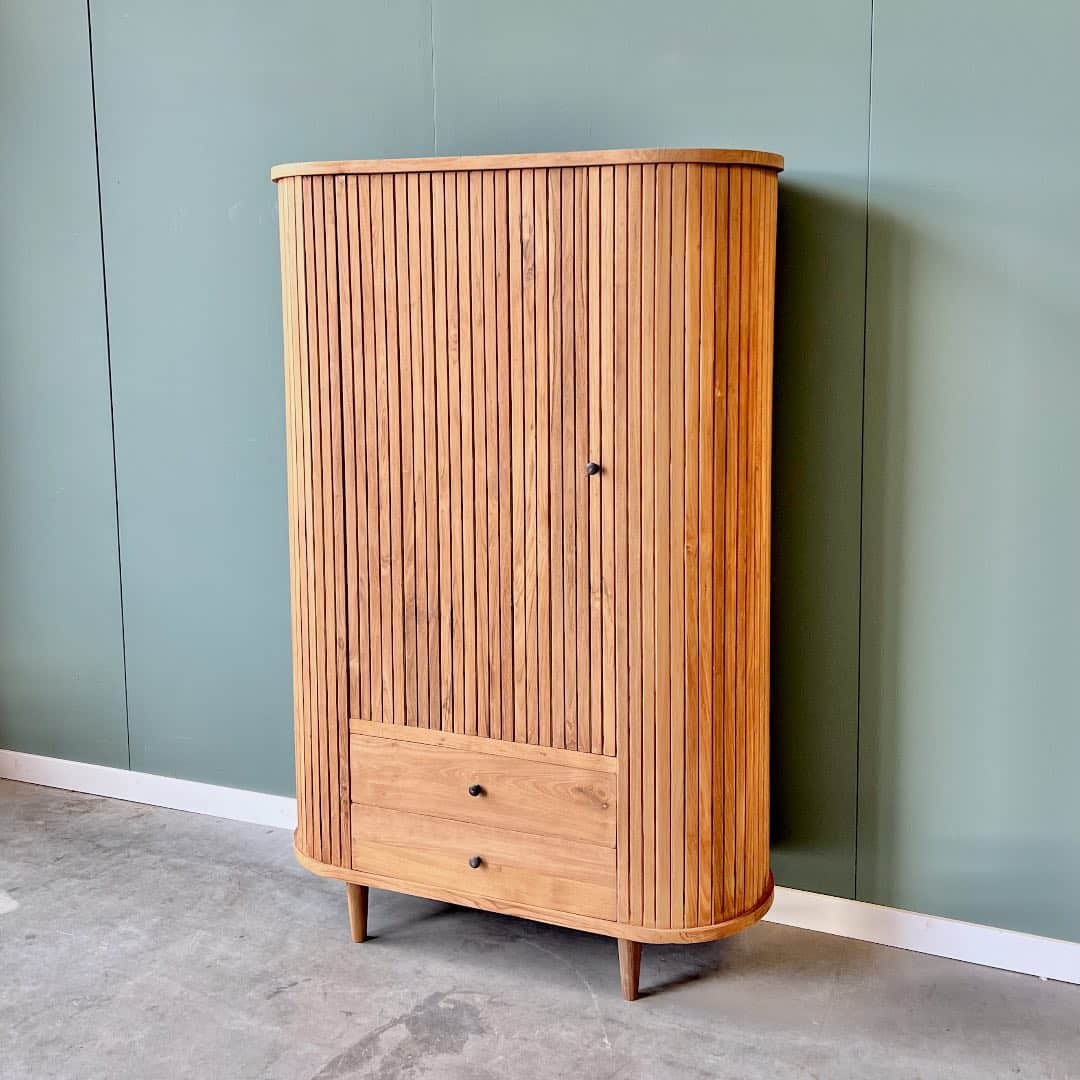 Deze prachtige kast van massief teakhout valt direct op door zijn stijlvolle ronde zijkanten en verticale lattenstructuur. Het warme hout geeft een natuurlijke, sfeervolle uitstraling, terwijl het unieke design een echte blikvanger is in je interieur.
