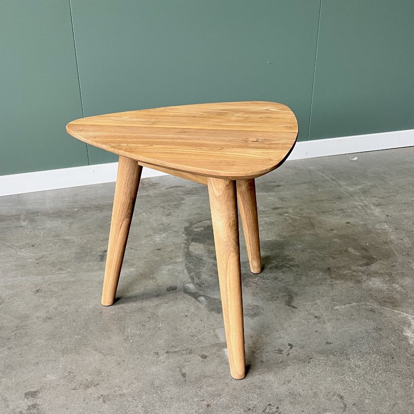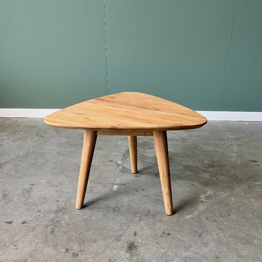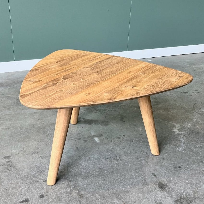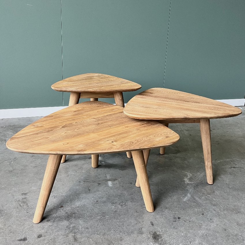 Ontdek de perfecte mix van duurzaamheid en design met onze salontafels van gerecycled teakhout. Deze driehoekige tafels met ronde, tapse poten en een blad met verjongde rand geven uw interieur een eigentijdse uitstraling met een subtiele vintage touch. Verkrijgbaar als set van 3 of ook los, zodat u uw woonruimte precies naar wens kunt inrichten.
