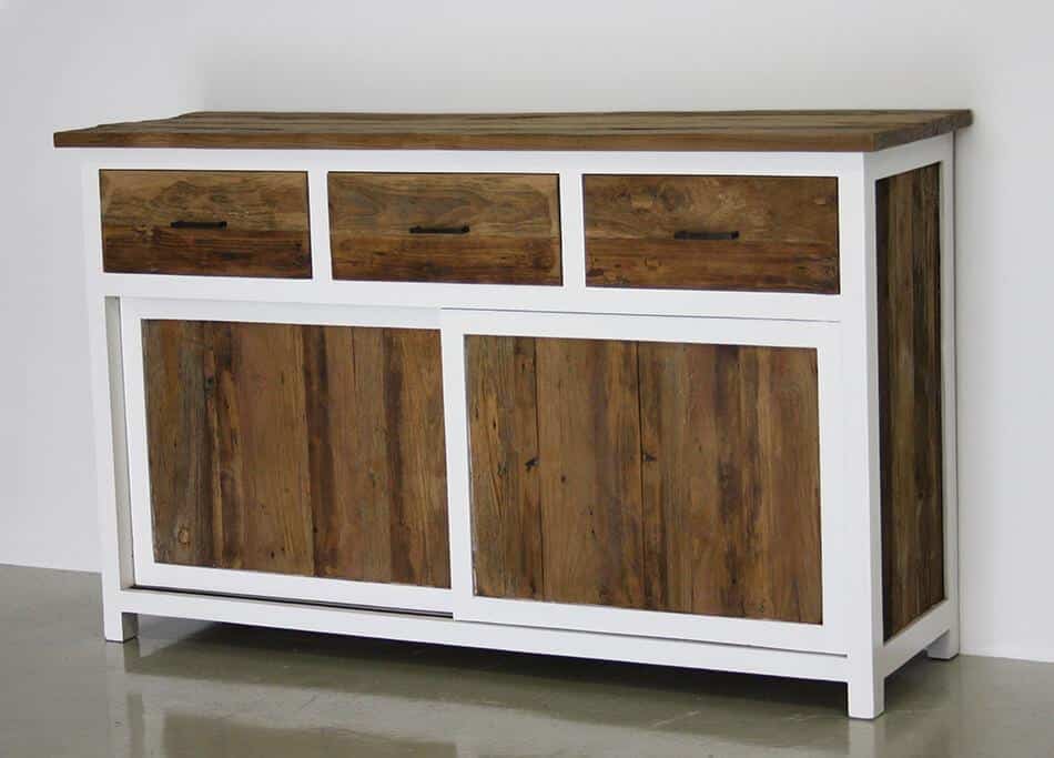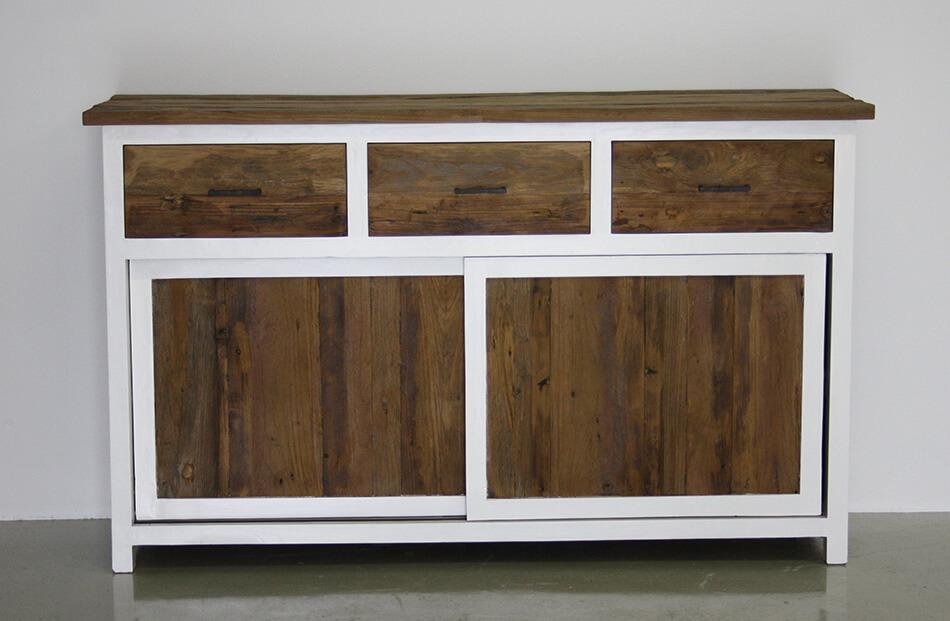 Dressoir uit onze DUO serie. Met schuifdeuren en laden. Het frame van het dressoir is wit gekleurd, het teak in de panelen is gekleurd met krijtverf.