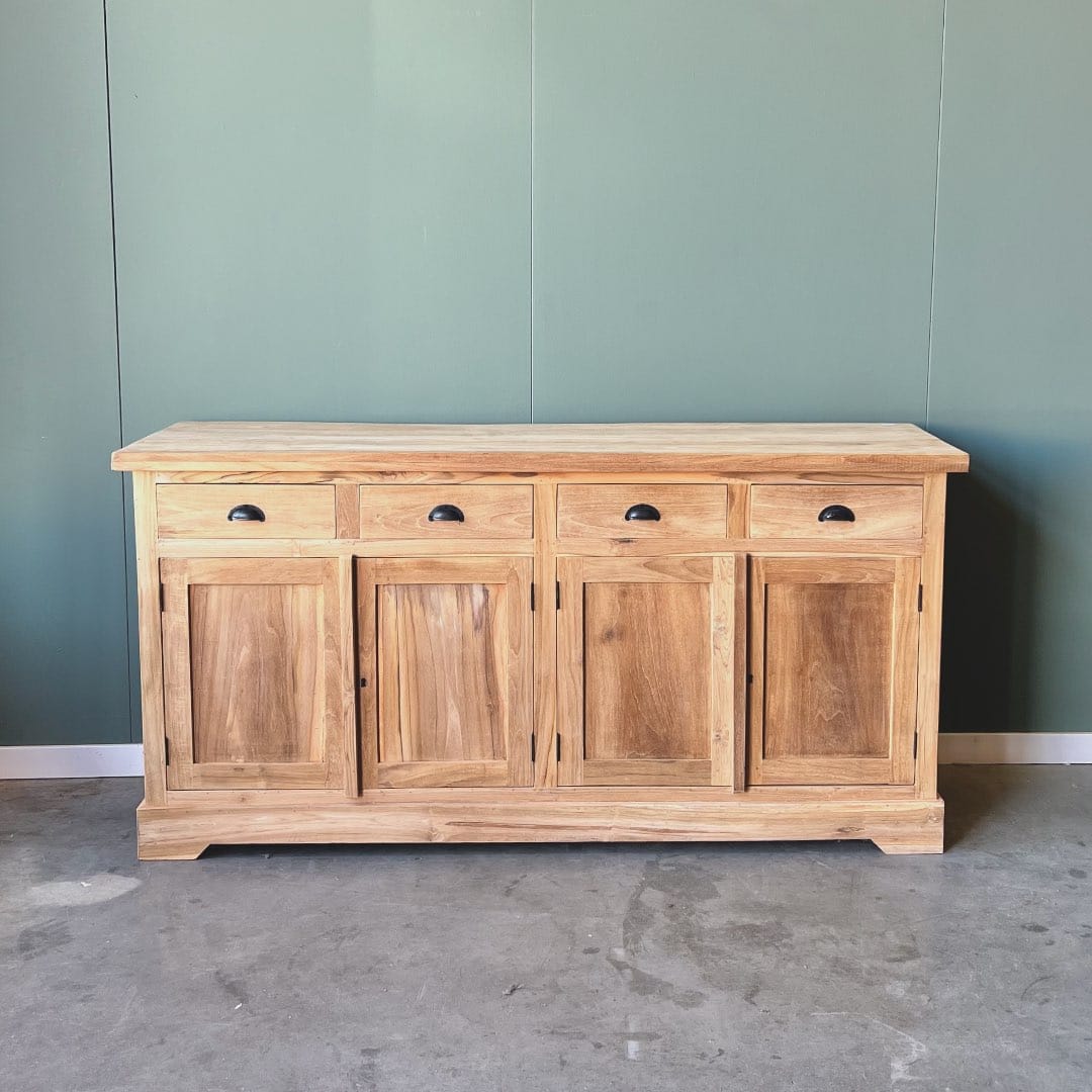 Eenvoudig teak dressoir van plantage hout. Achter de deuren zit een plank. Deze plank kan eventueel verwijderd worden. De laden lopen niet op geleiders.