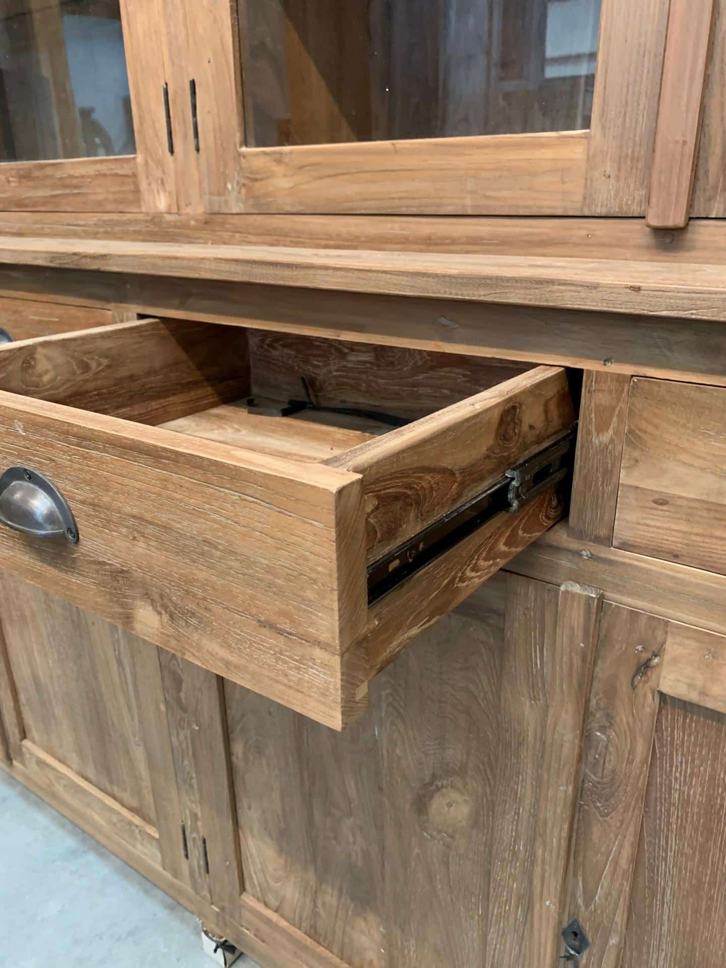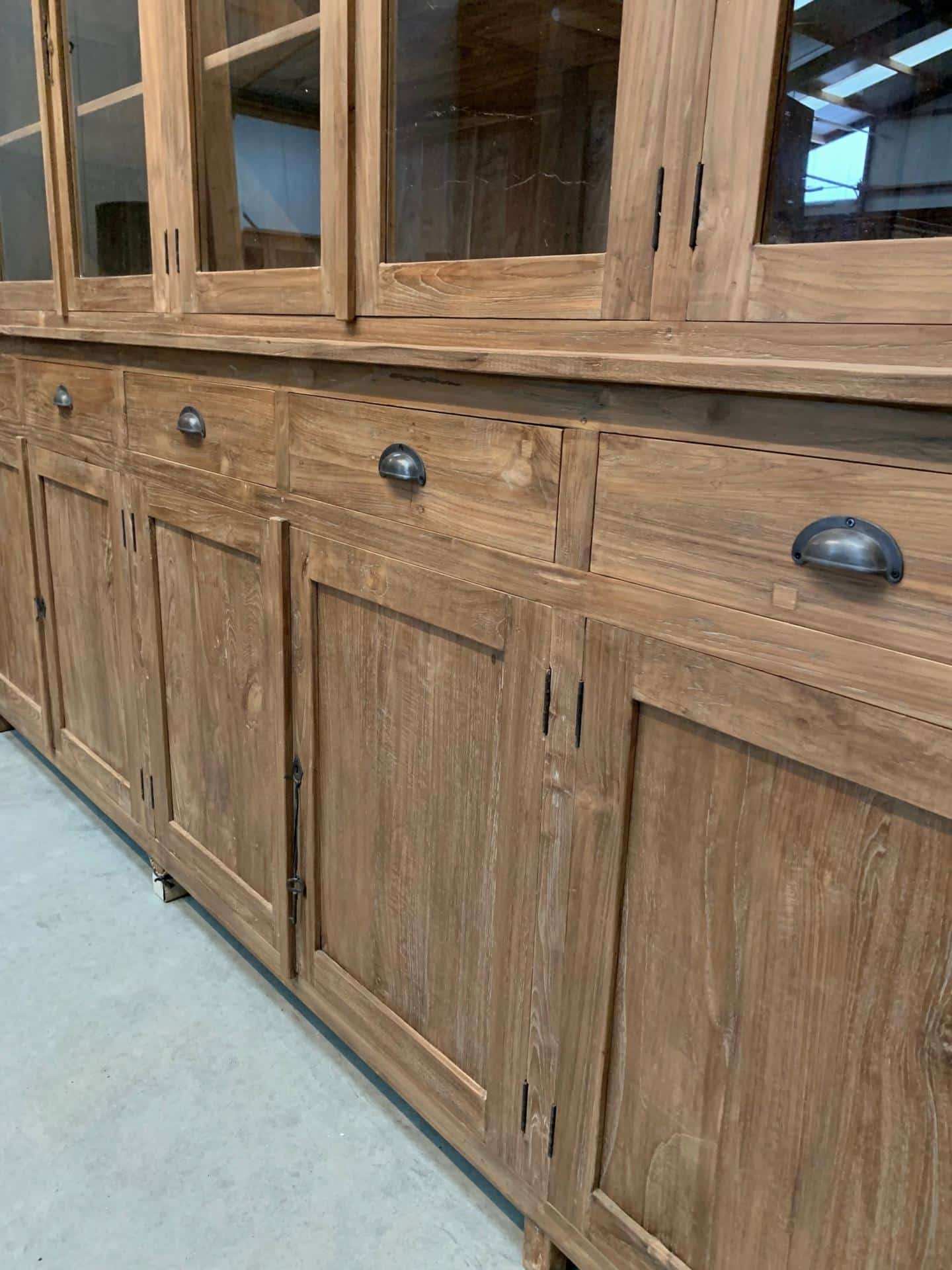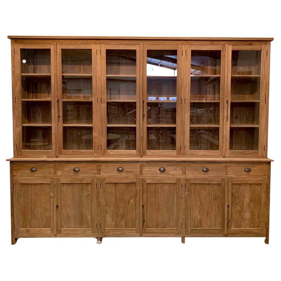 Deze indrukwekkende buffetkast is het grootste meubelstuk uit de collectie en vormt direct het middelpunt van de kamer. De kast is gemaakt van massief teakhout dat ruw is afgewerkt voor een natuurlijke uitstraling. Het hout is behandeld met was, waardoor de warme kleur en het karakter van het materiaal extra goed tot hun recht komen. Deze specifieke afwerking staat in Indonesië bekend als dingklik.