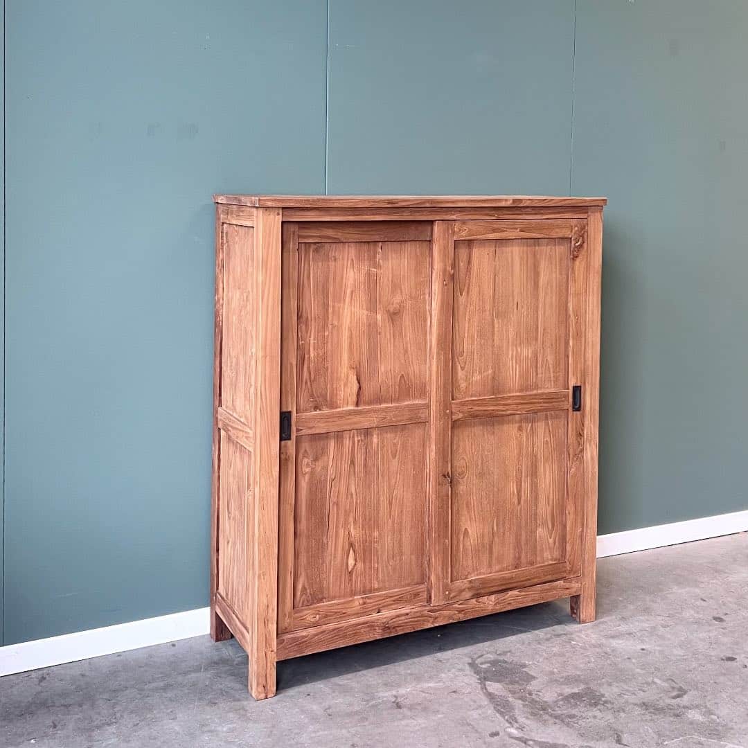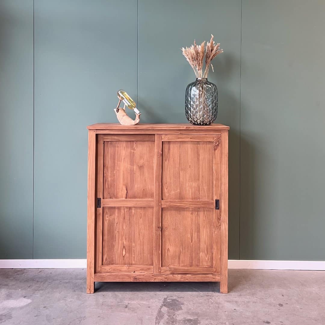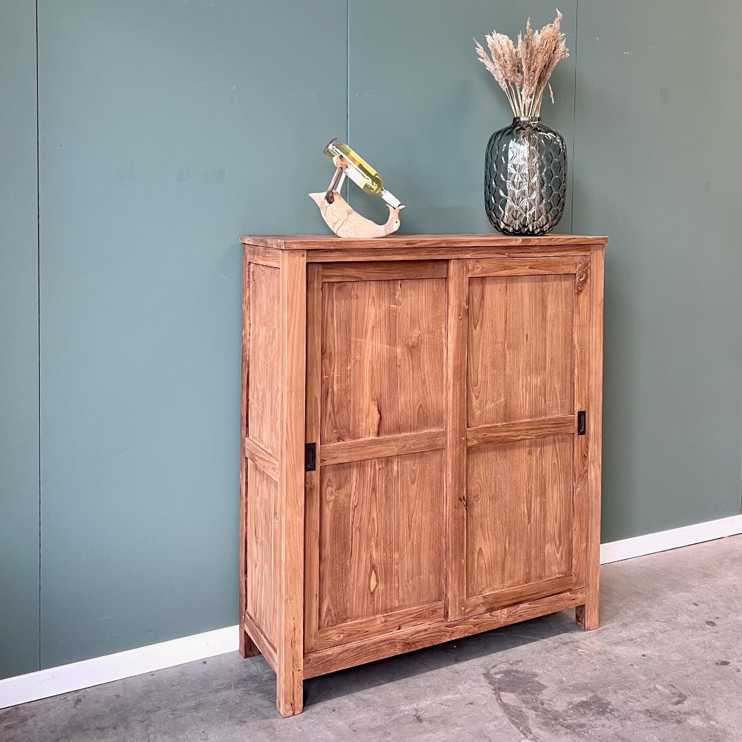 Deze halfhoge schuifdeurkast van gerecycled teakhout is met zijn hoogte van 140 cm net even anders dan een standaard dressoir. Perfect om nog iets decoratiefs bovenop te plaatsen, terwijl je binnenin volop opbergruimte hebt. De schuifdeuren lopen soepel en zijn eenvoudig na te stellen – en het grootste voordeel: ze draaien nooit de kamer in, dus ideaal voor kleinere ruimtes. De dichte deuren zorgen voor een rustige, strakke uitstraling.