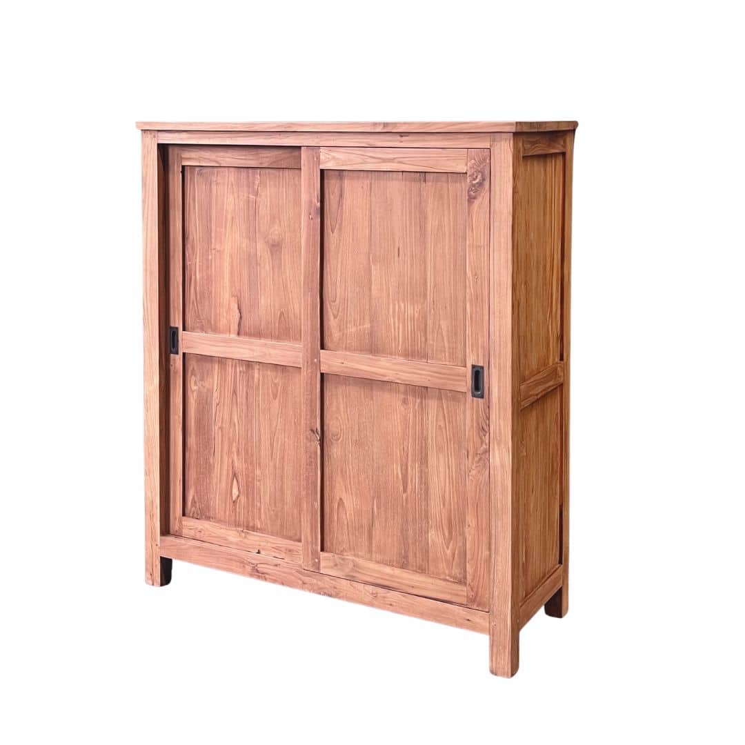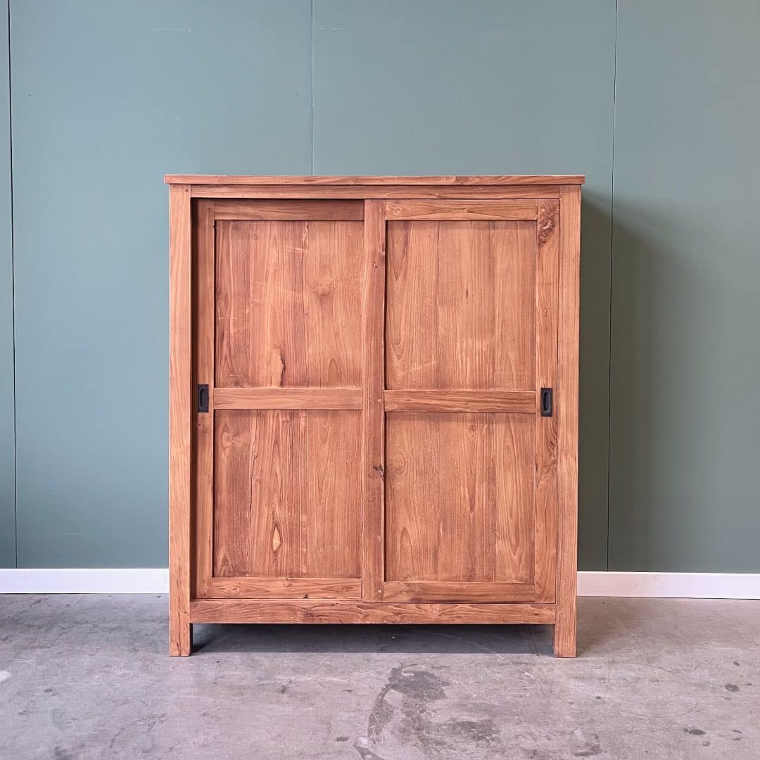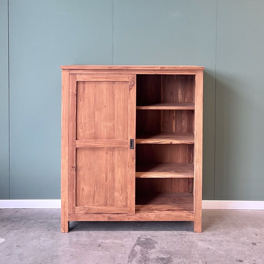Deze halfhoge schuifdeurkast van gerecycled teakhout is met zijn hoogte van 140 cm net even anders dan een standaard dressoir. Perfect om nog iets decoratiefs bovenop te plaatsen, terwijl je binnenin volop opbergruimte hebt. De schuifdeuren lopen soepel en zijn eenvoudig na te stellen – en het grootste voordeel: ze draaien nooit de kamer in, dus ideaal voor kleinere ruimtes. De dichte deuren zorgen voor een rustige, strakke uitstraling.
