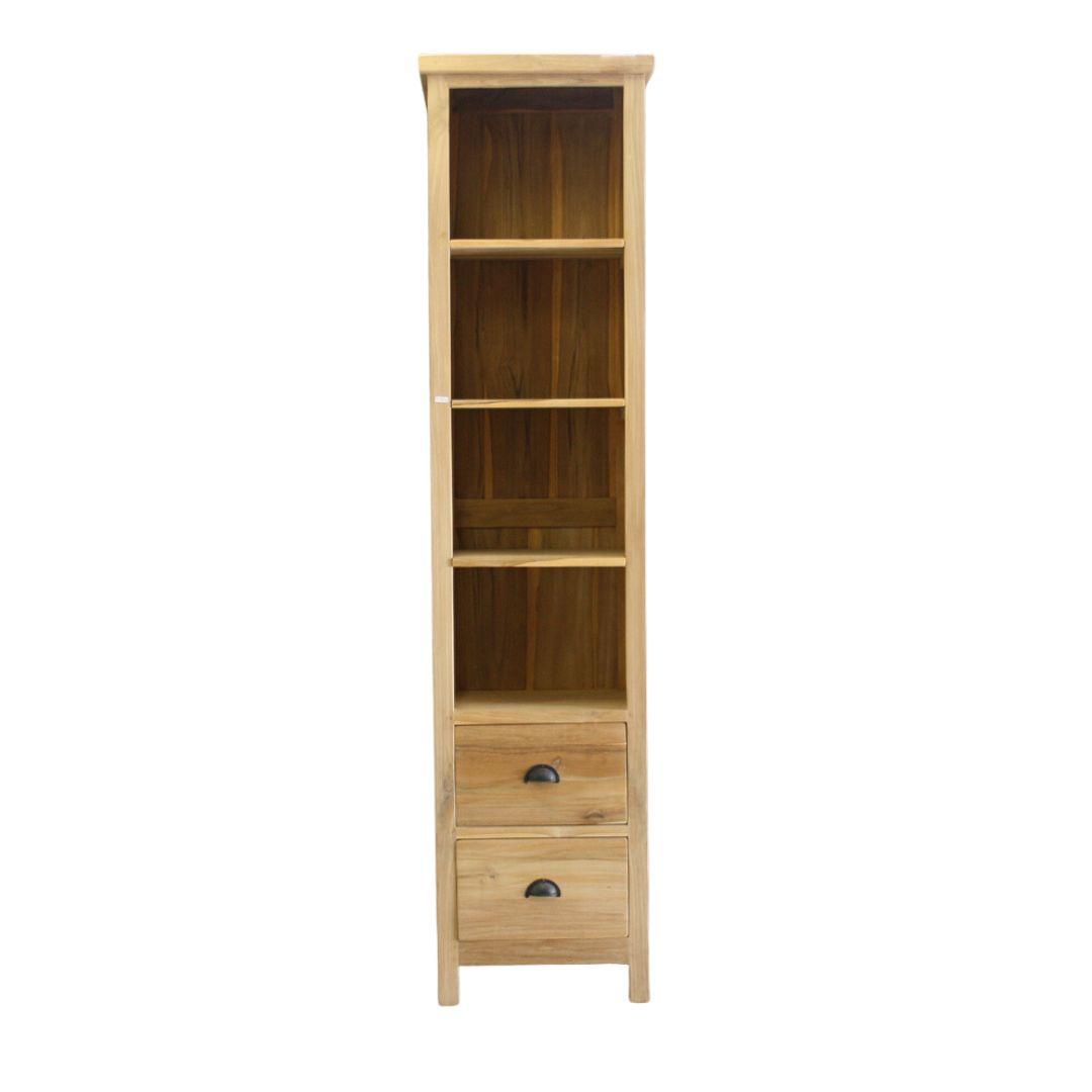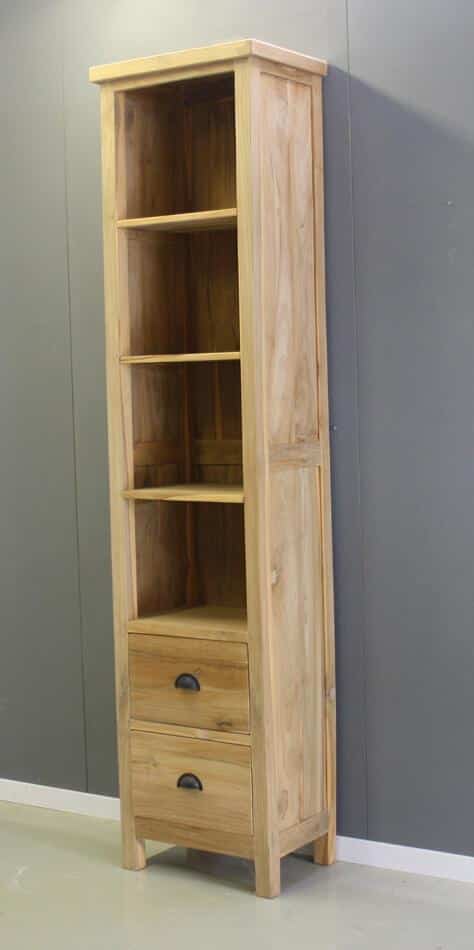 Hoge elegante smalle boekenkast van teakhout. Deze kast heeft twee grote laden. Ook leverbaar met greeploze laden!