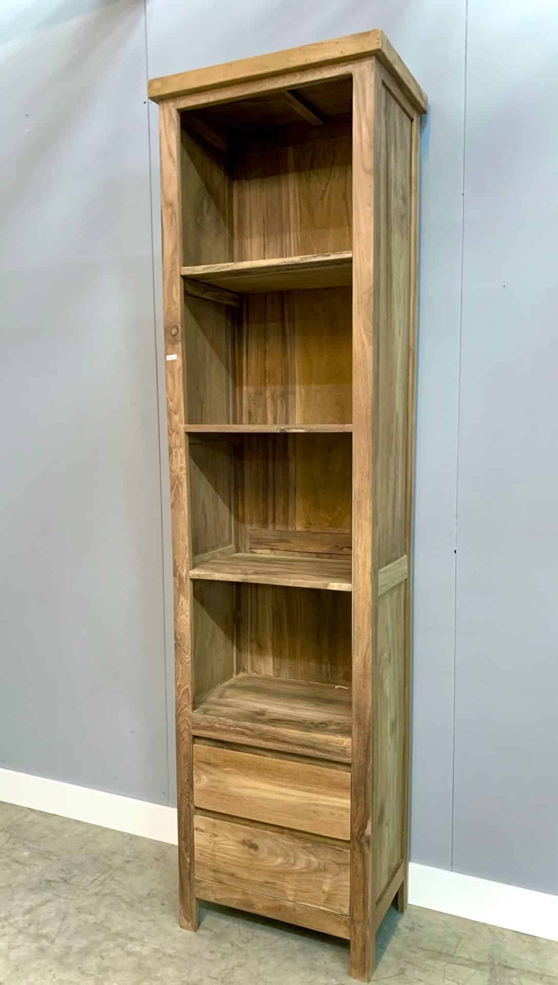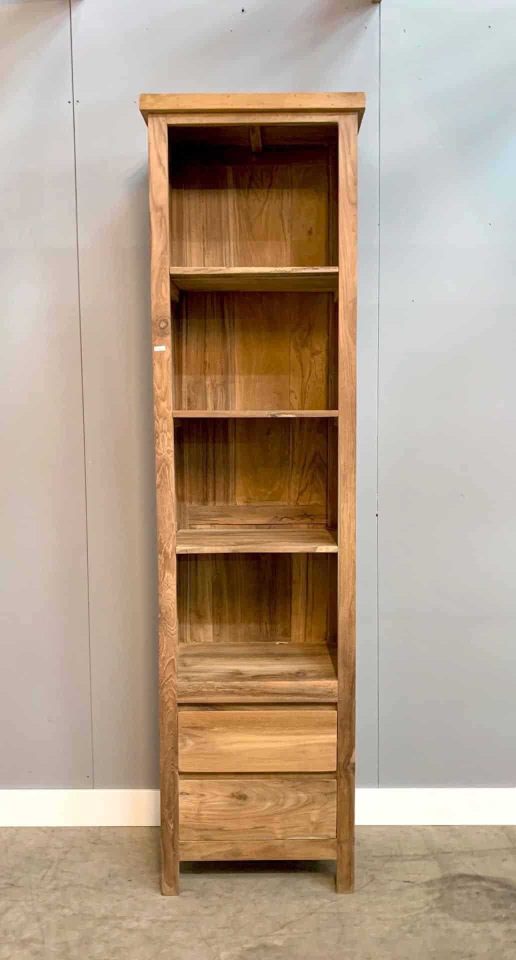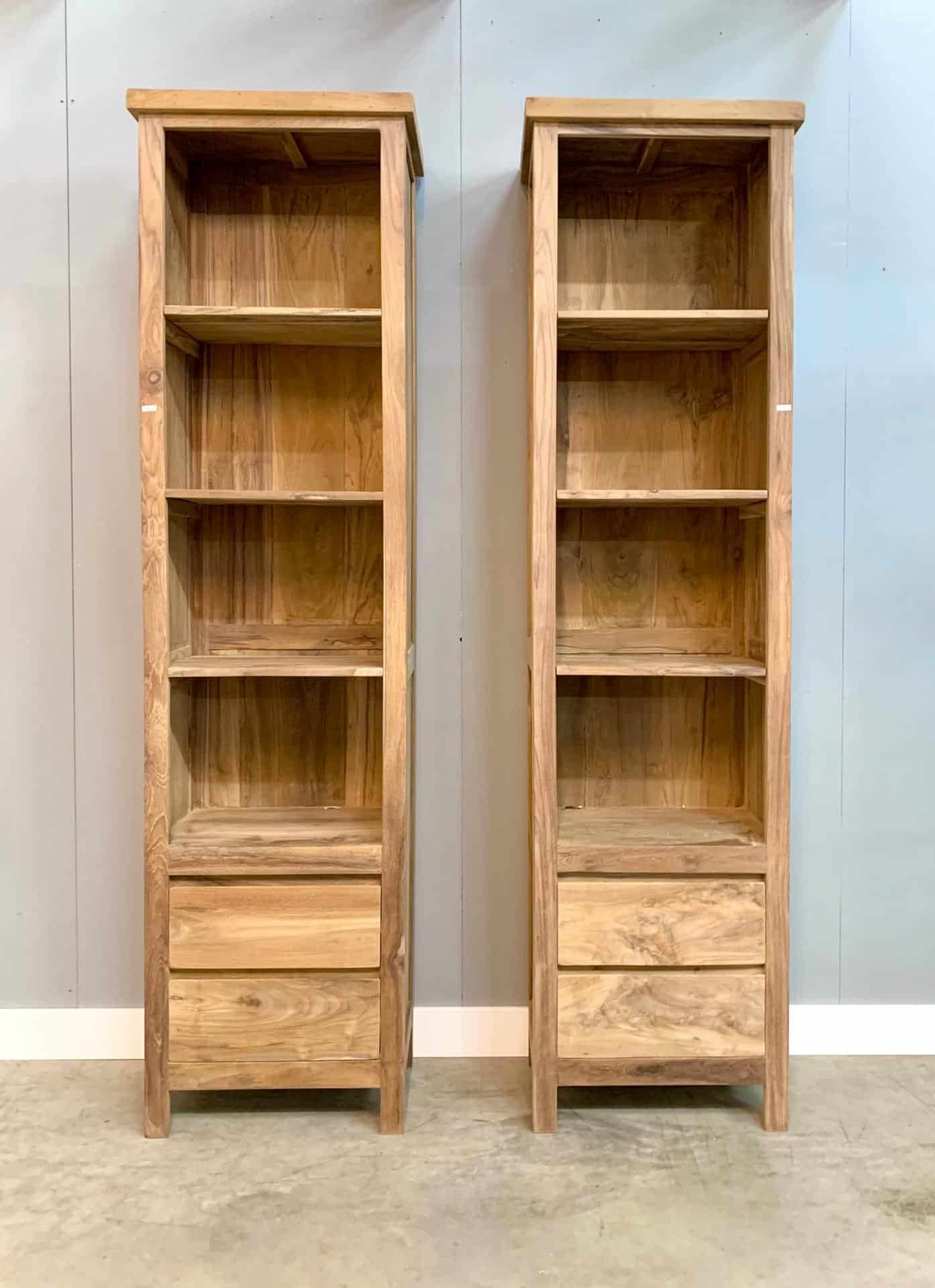 Moderne boekenkast van teakhout. Door 2 dezelfde kasten te plaatsen tegen een wand creëert u symmetrie, dat kan een extra ruimtelijk effect geven.