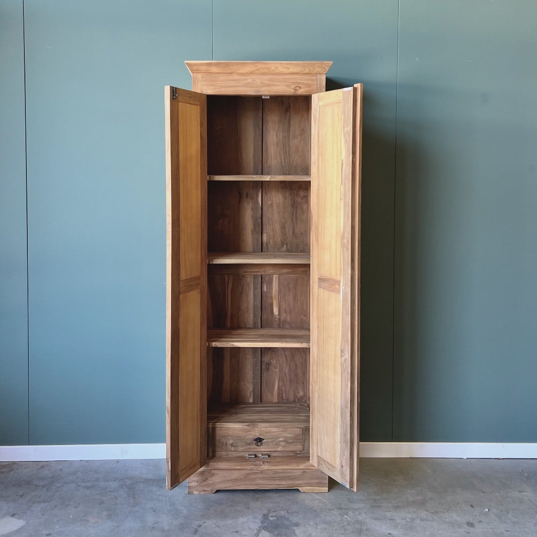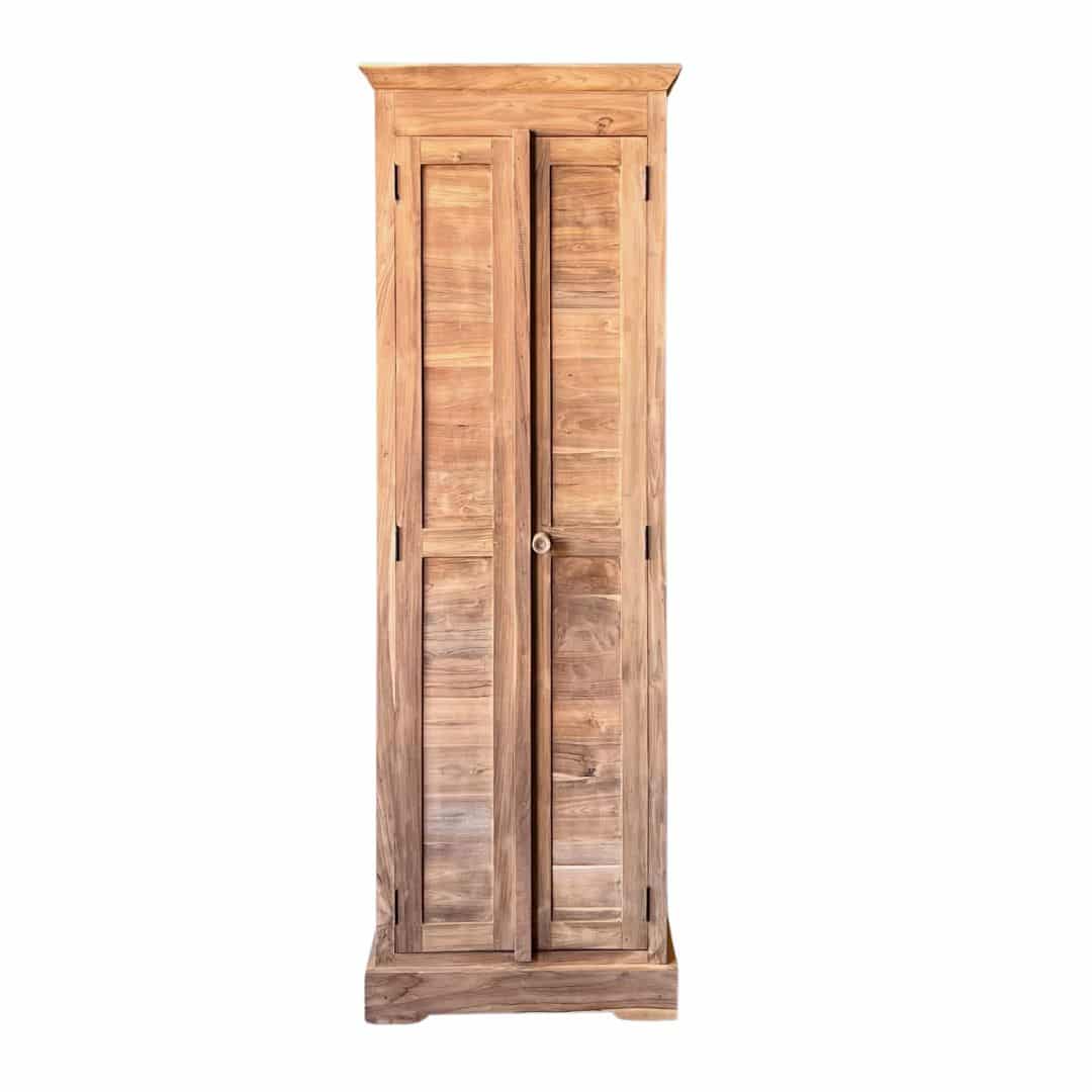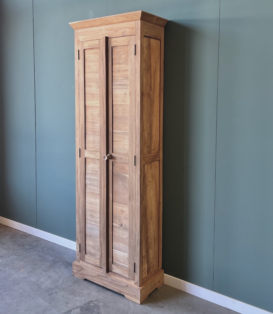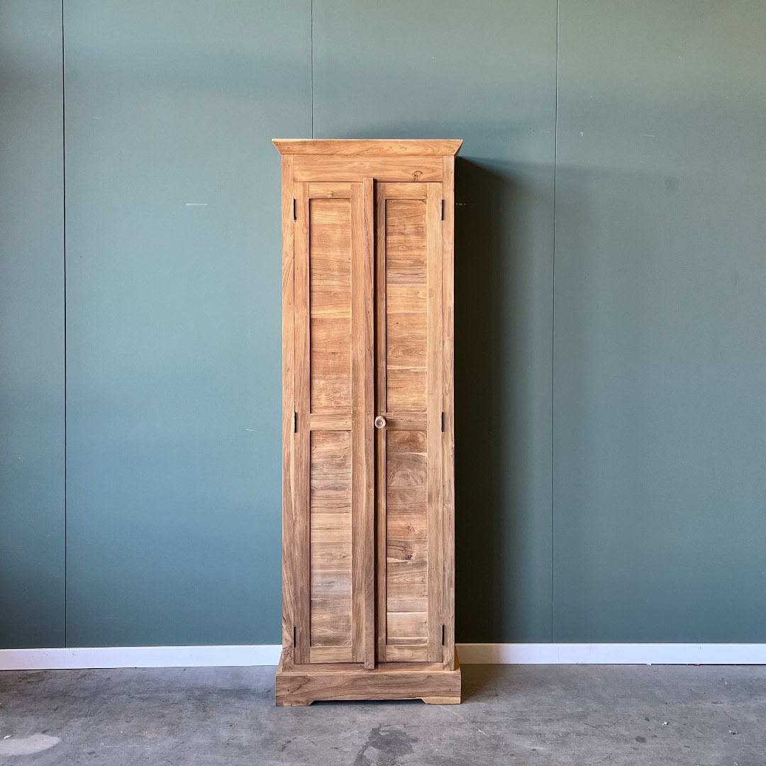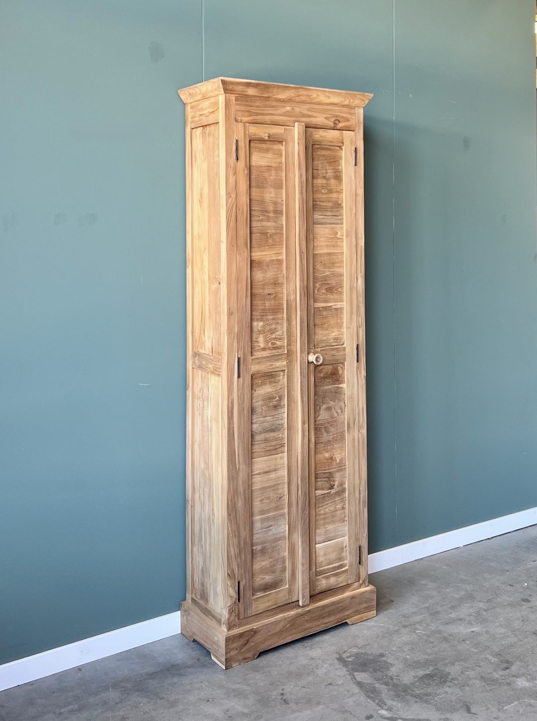 Hoge smalle kast met dichte deuren. Met een diepte van 35cm komt deze kast niet ver de kamer in. Maar door de dichte deuren biedt de kast wel erg veel opbergruimte.