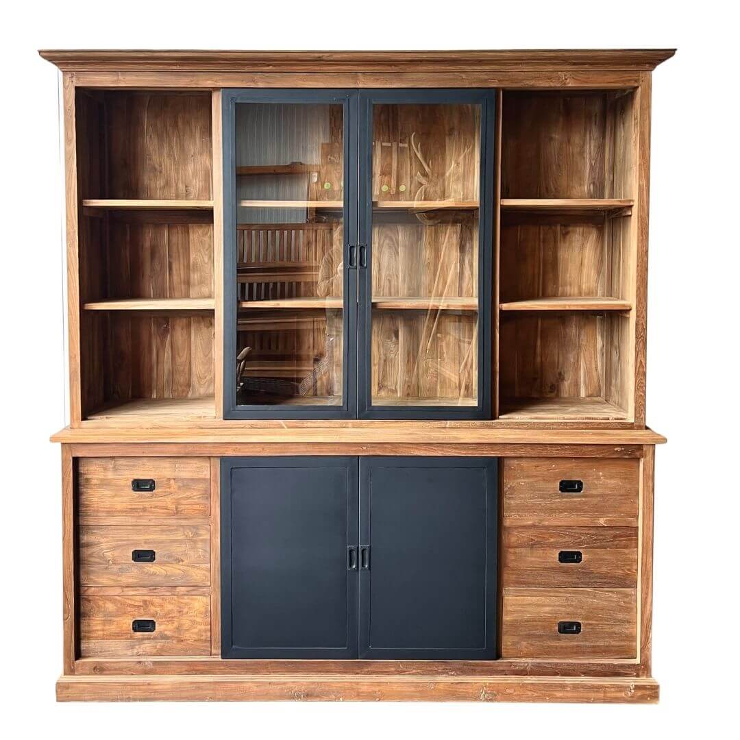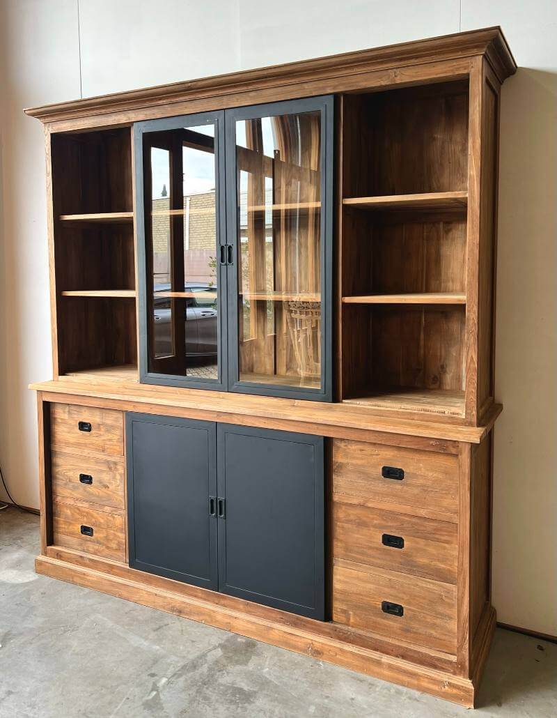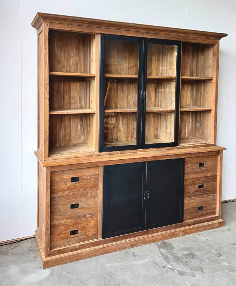 De Industriële Buffetkast met stalen schuifdeuren combineert hout en staal op een stijlvolle manier, waardoor een warme maar stoere uitstraling ontstaat die perfect past in industriële en moderne interieurs. Deze grote kast is niet alleen een eyecatcher, maar ook uiterst praktisch in gebruik.