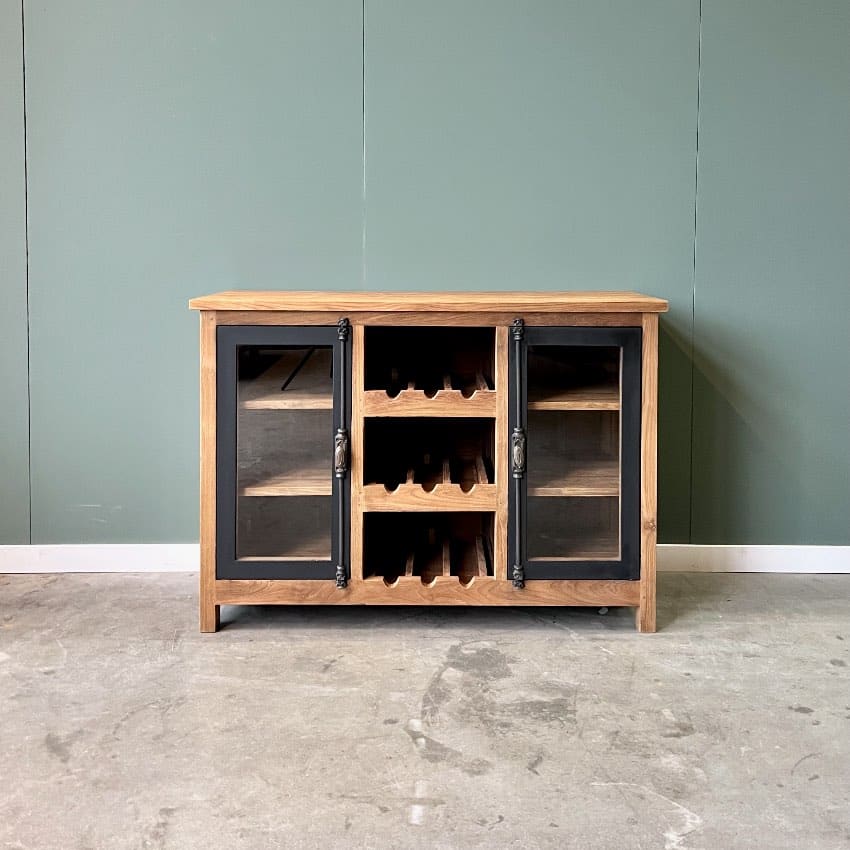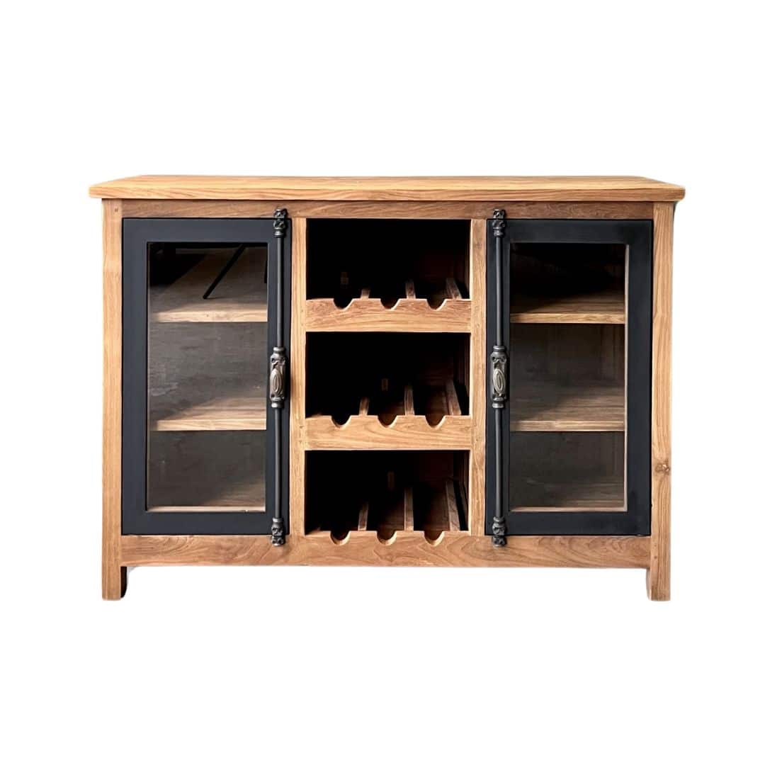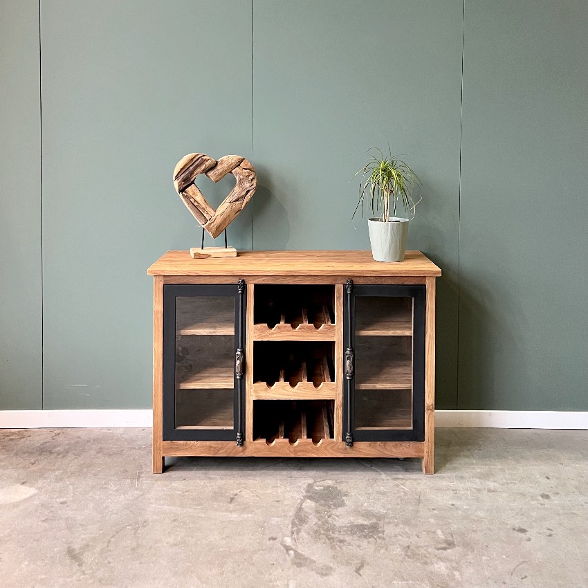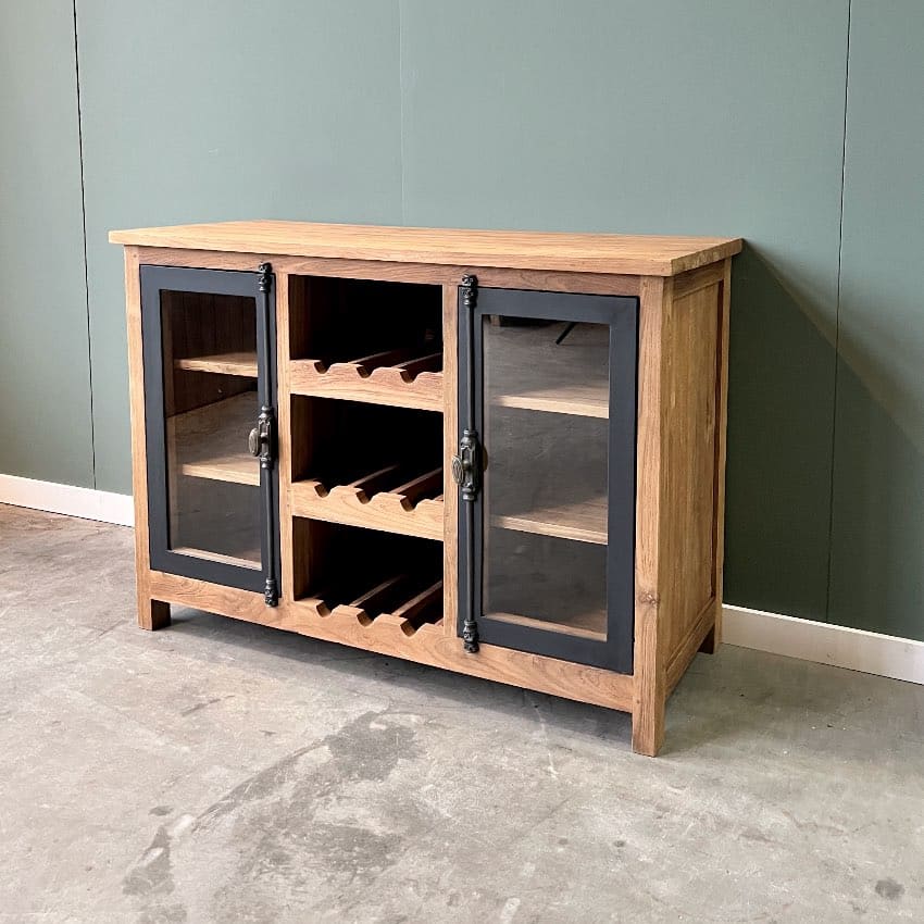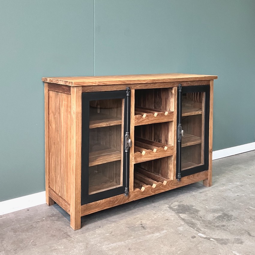 Geef je wijncollectie een elegante plek met deze unieke teakhouten wijnkast. Met zijn robuuste stalen deuren aan beide zijden en een open middenruimte voor flessenopslag, combineert deze kast een industriële uitstraling met warme, natuurlijke materialen. Perfect voor wijnliefhebbers die stijl en functionaliteit willen samenbrengen in hun interieur.