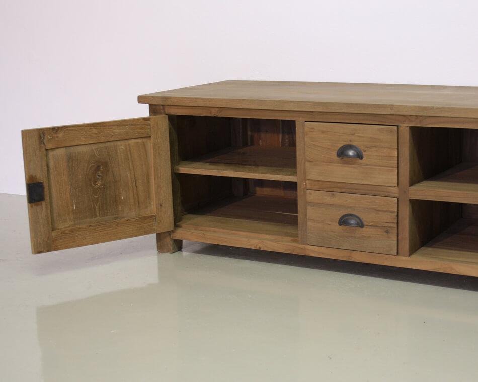 Dit tijdloze tv-meubel van 225 cm breed, gemaakt van hoogwaardig teakhout, combineert elegantie en functionaliteit. Aan weerszijden bevinden zich deuren voor ruime opbergruimte, naast twee praktische laden voor kleinere items. In het midden zijn twee open vakken, ideaal voor het plaatsen van multimedia-apparatuur en decoratieve elementen. Met zijn klassieke ontwerp en duurzame constructie is dit meubel een perfecte aanvulling voor elke woonkamer.