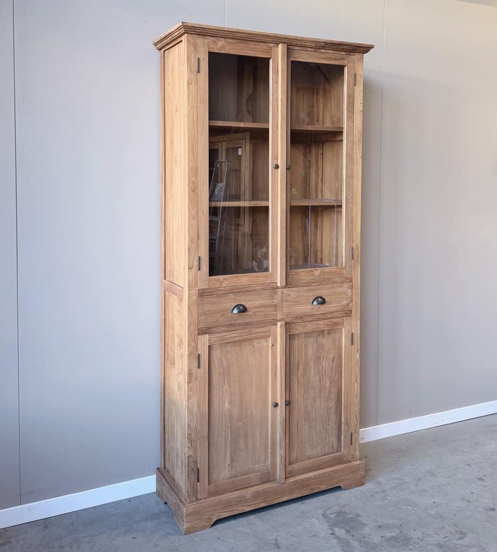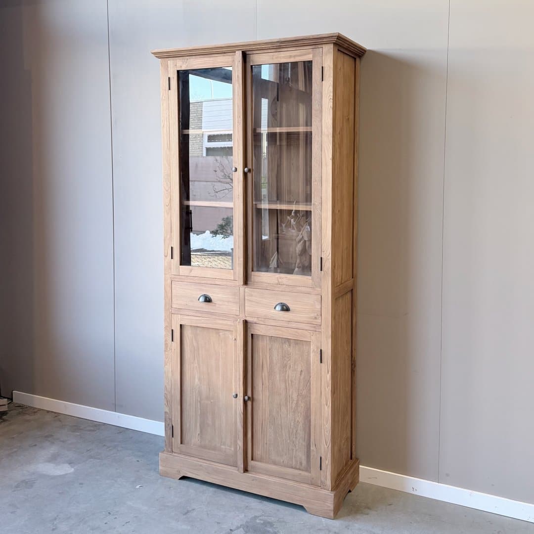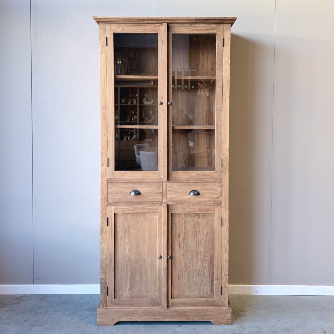 Deze buffetkast van gerecycled teakhout combineert warmte en karakter met praktische opbergruimte. Het klassieke ontwerp met glasdeuren boven en gesloten kastruimte onder past perfect in een sfeervol interieur.