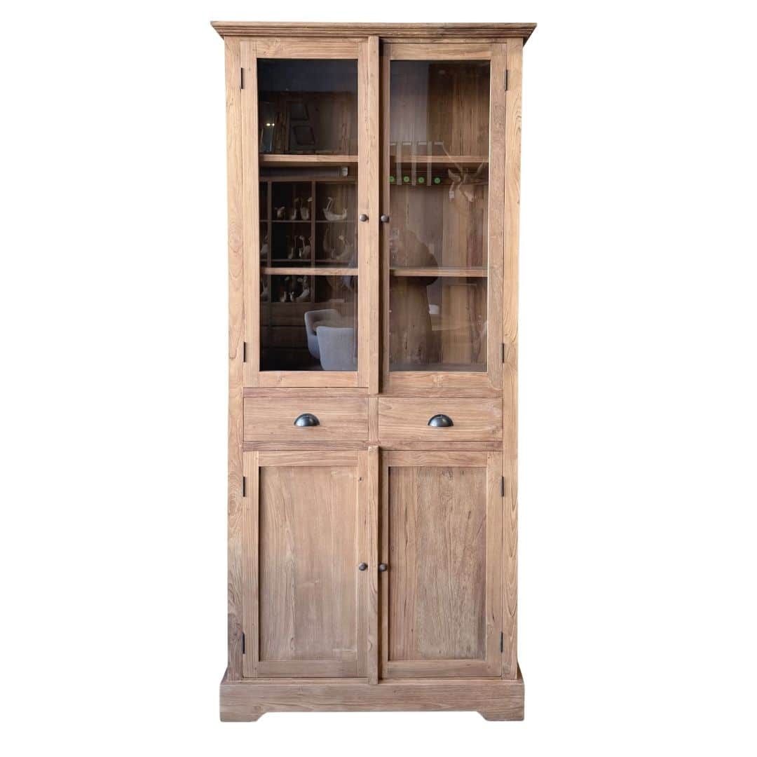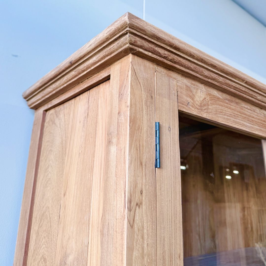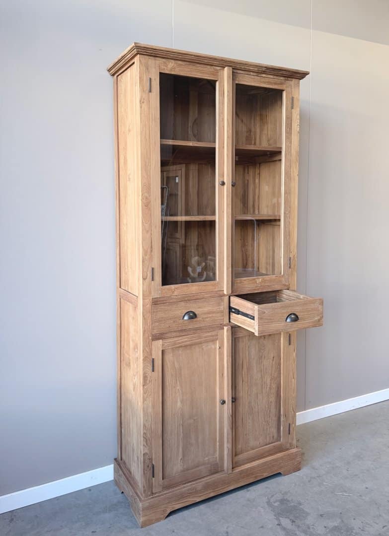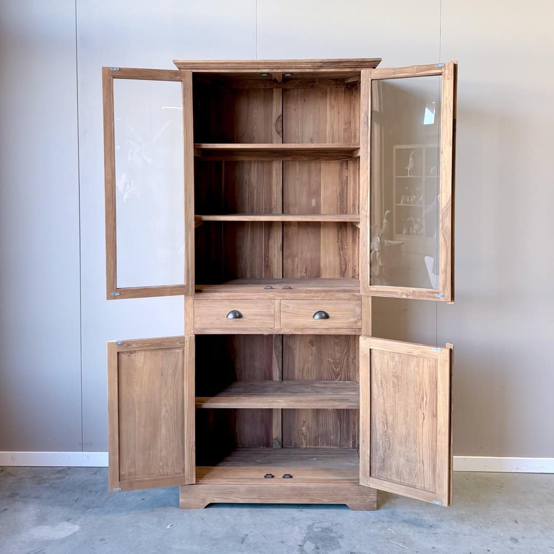 Deze buffetkast van gerecycled teakhout combineert warmte en karakter met praktische opbergruimte. Het klassieke ontwerp met glasdeuren boven en gesloten kastruimte onder past perfect in een sfeervol interieur.