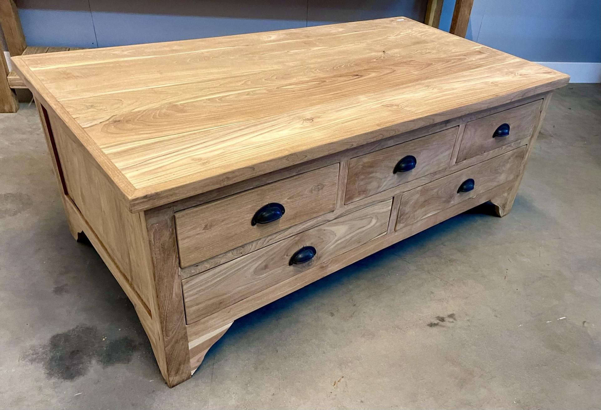 De klassieke salontafel van plantage teakhout. De salonkist heeft 10 laden.