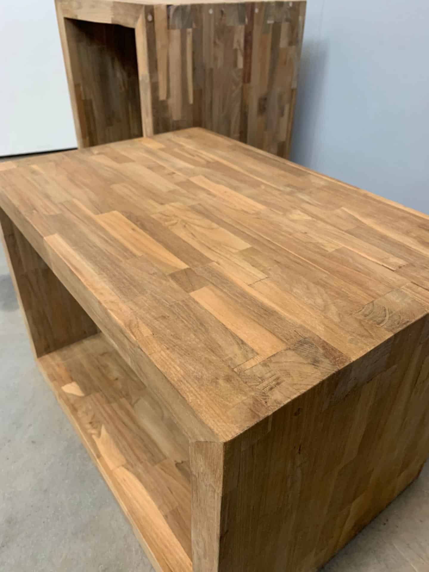 Zware kubus van teakhout. Kan op meerdere manieren decoratief neergezet worden. Leuk als salontafeltje maar als plantentafel is het ook een ideaal meubel.