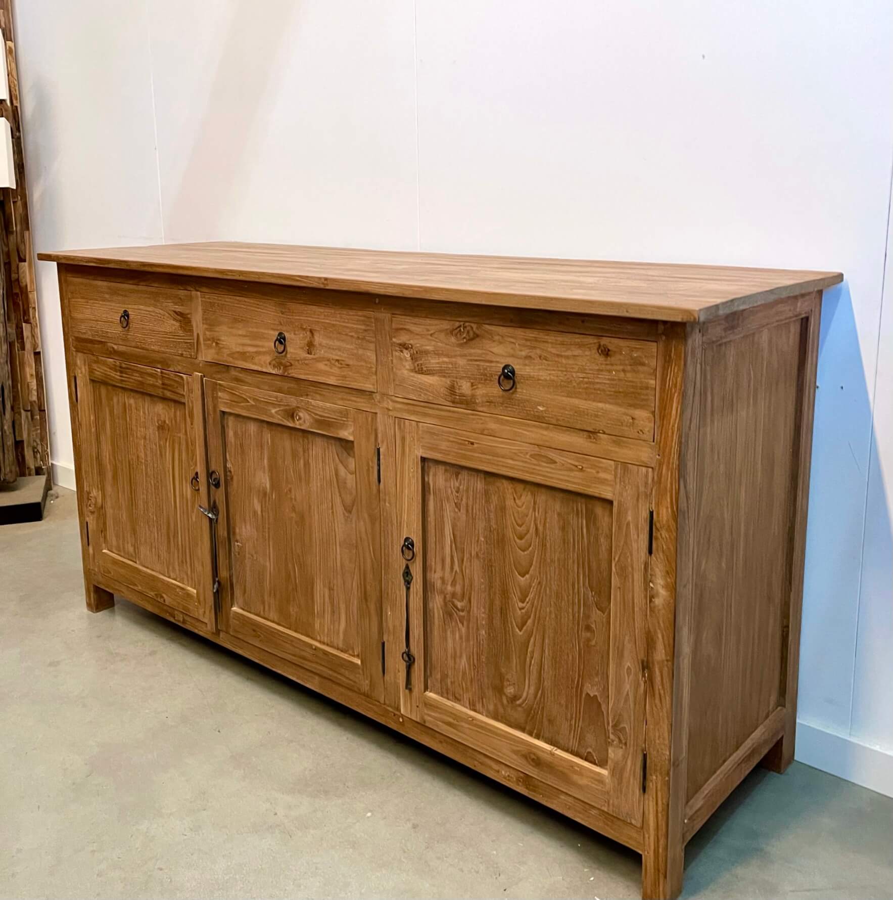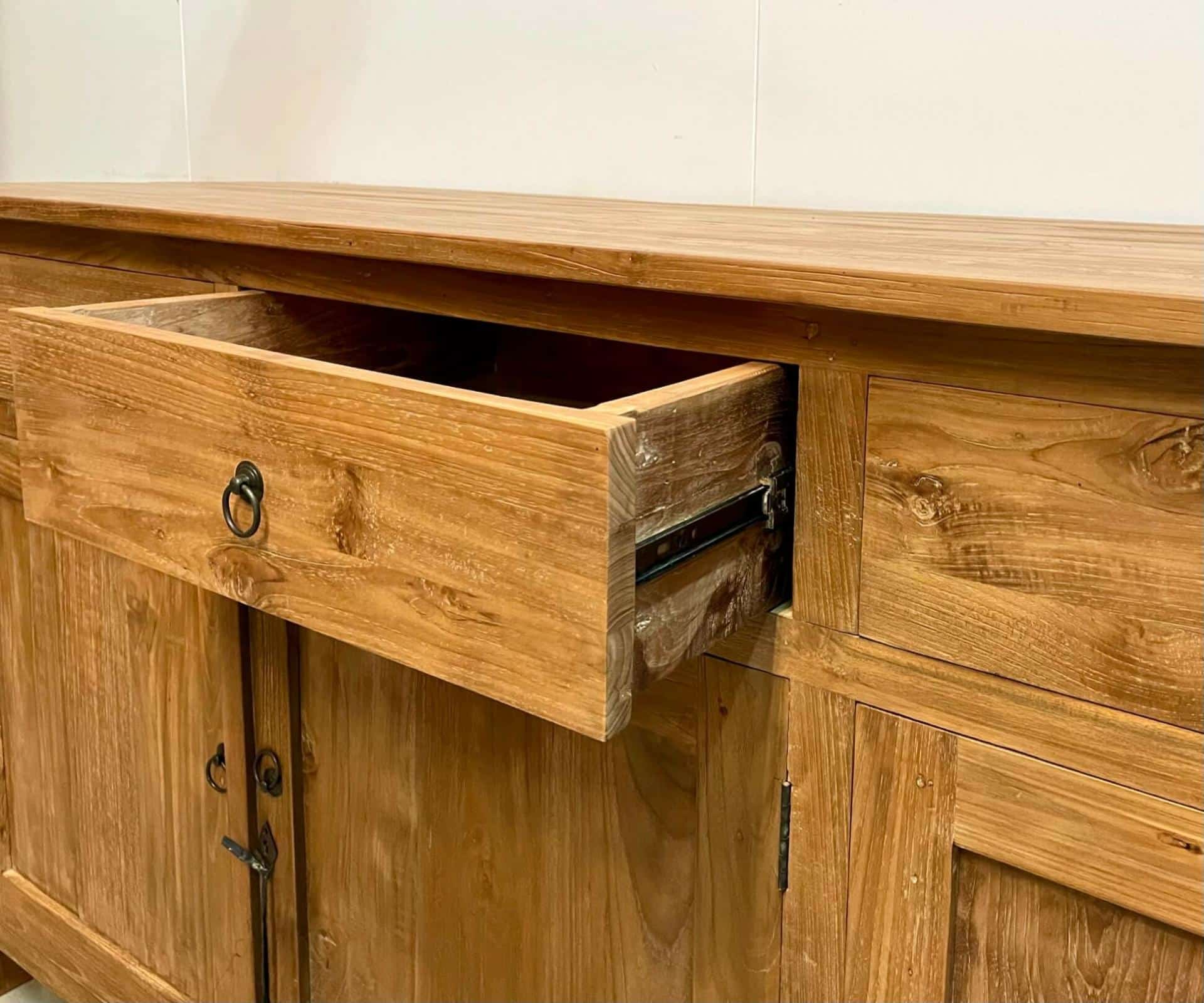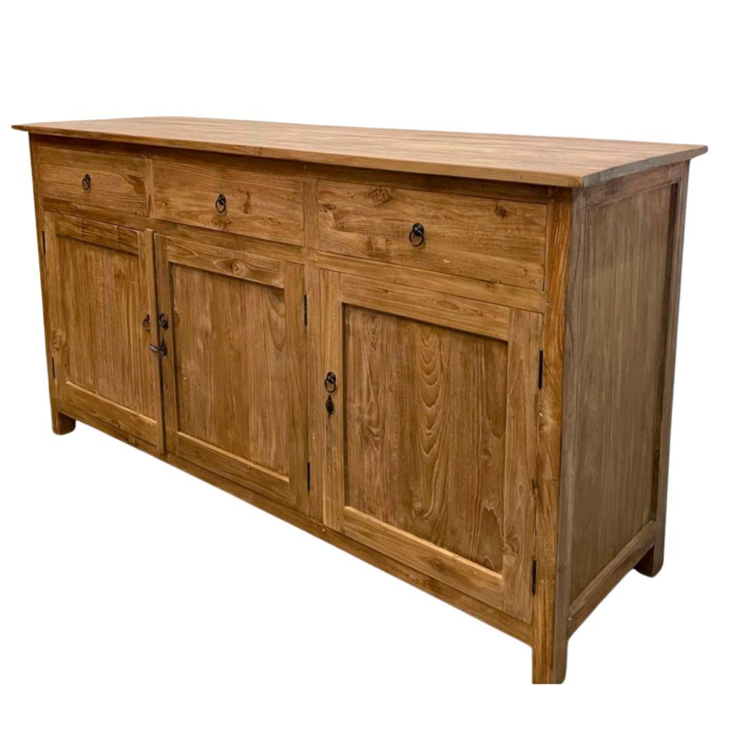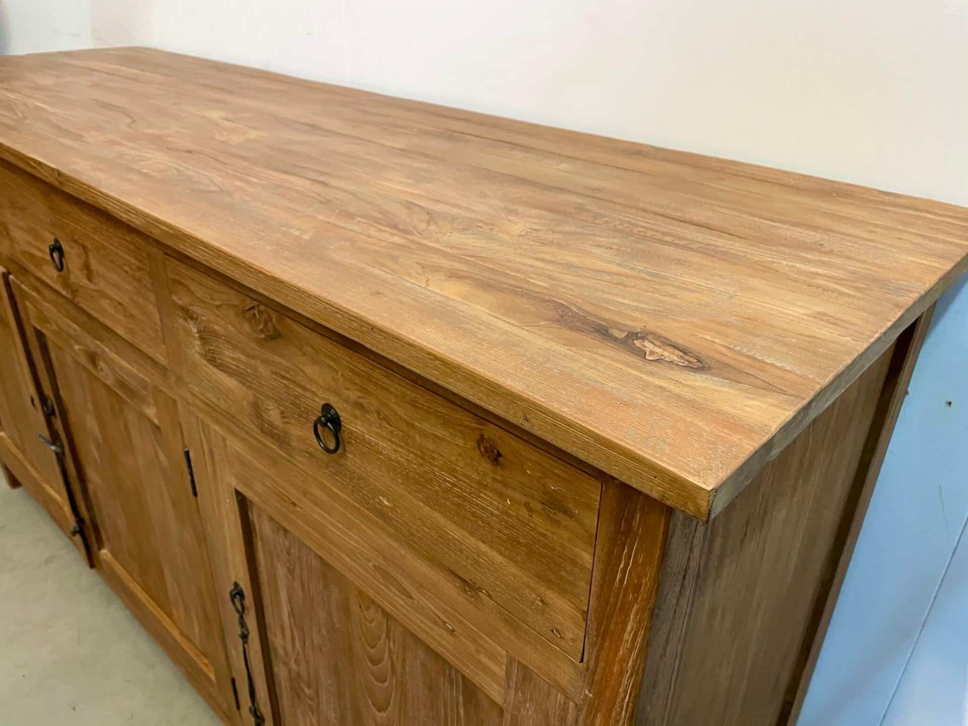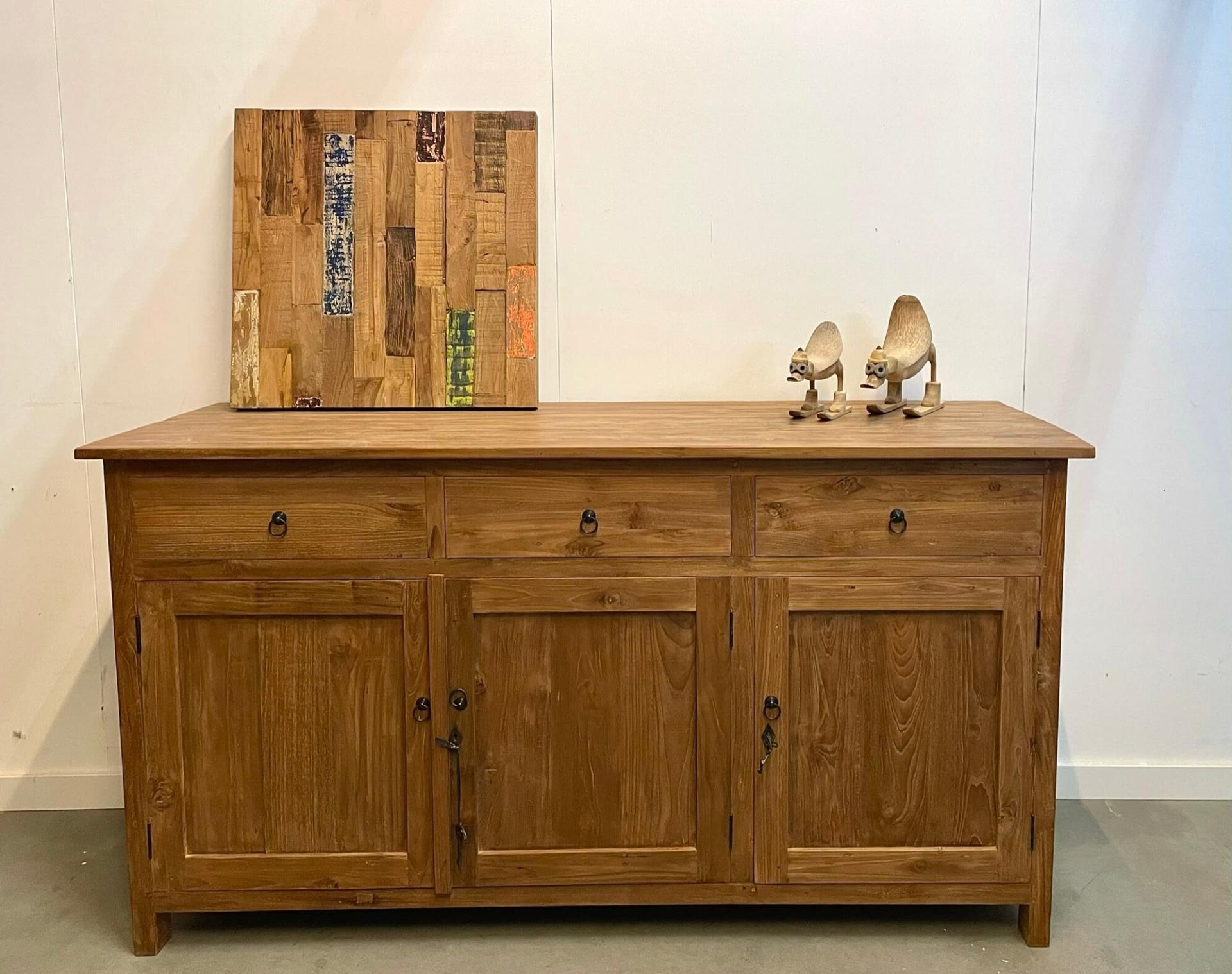 Dingklik dressoir van teakhout. Dit dressoir heeft een speciale behandeling gehad in Indonesië, het hout is iets grover gelaten en heeft een warmere kleur. Het teakhout is van uitstekende kwaliteit. Indien gewenst kan dit meubel ook geleverd worden met schelpgrepen.