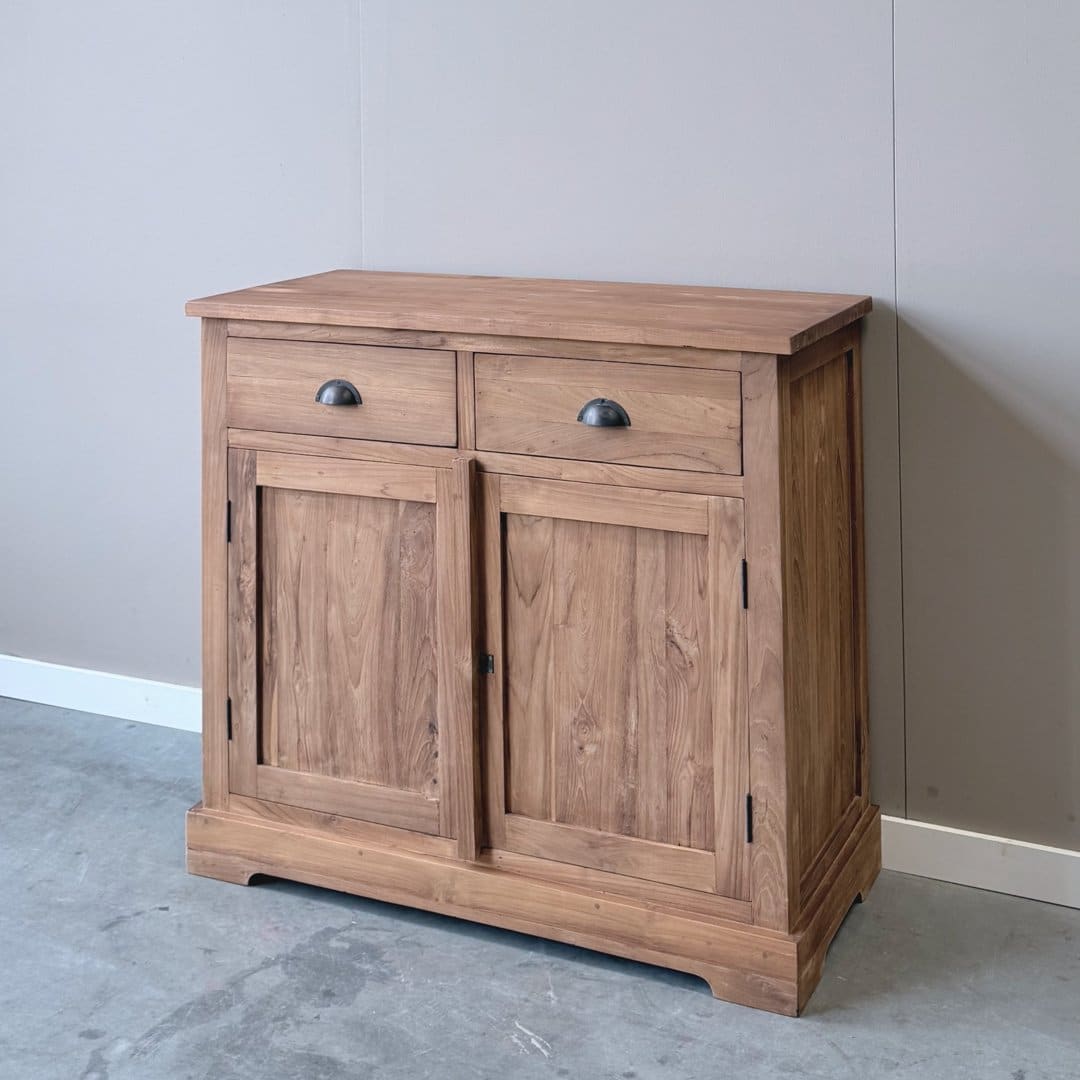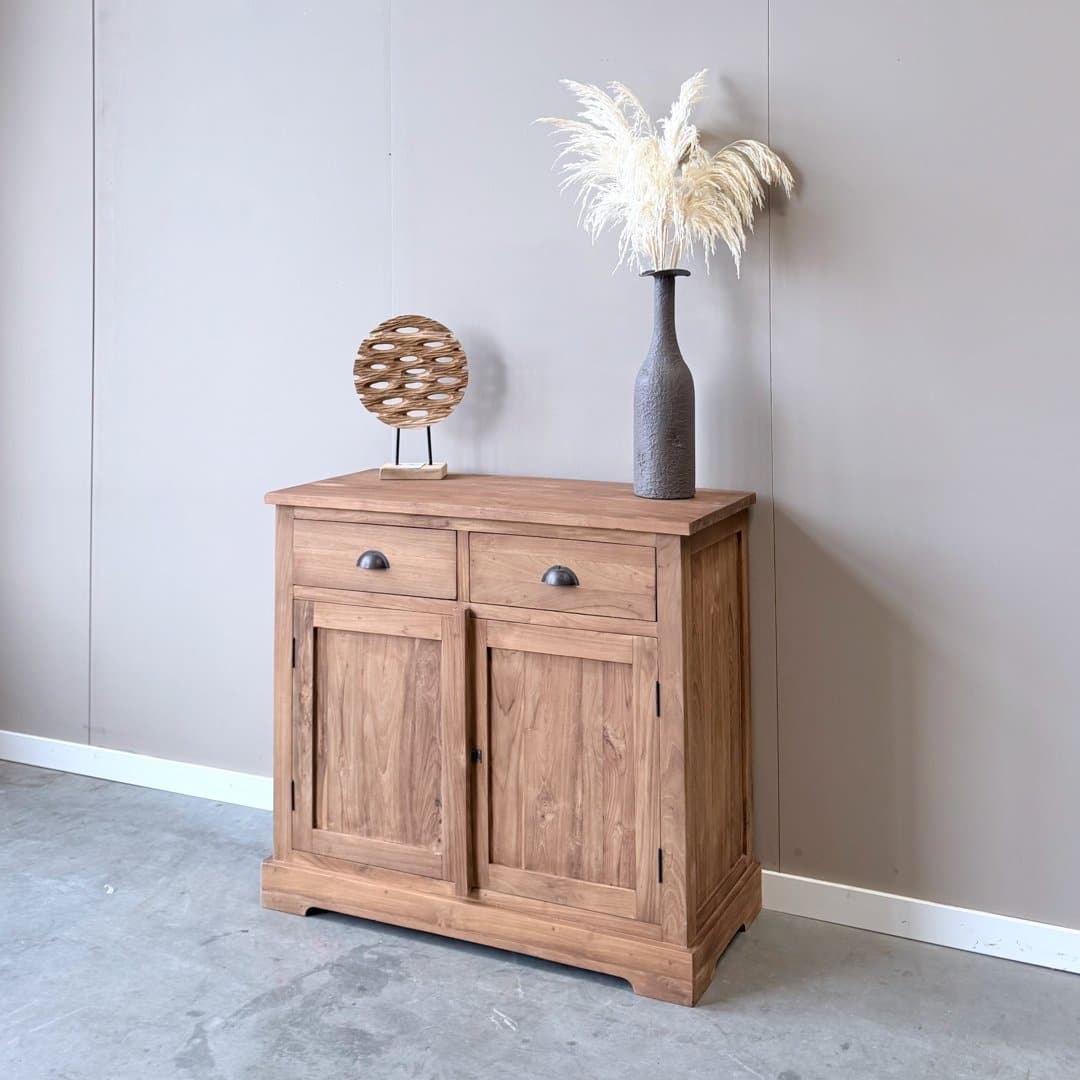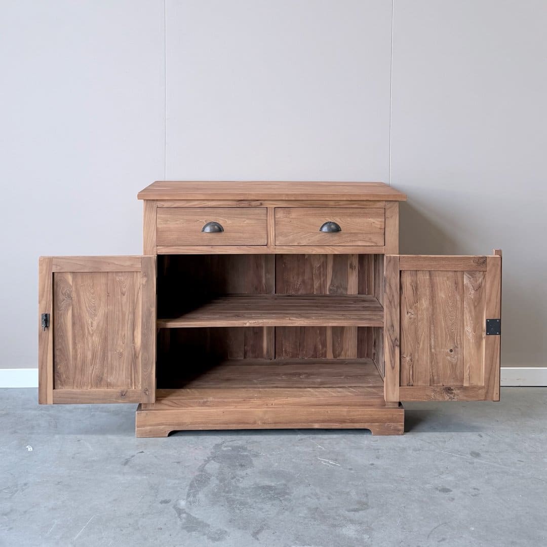 Dit landelijke dressoir is vervaardigd uit massief gerecycled teakhout en combineert karakter met functionaliteit. De warme houttinten en natuurlijke houtstructuur zorgen voor een tijdloze en sfeervolle uitstraling.