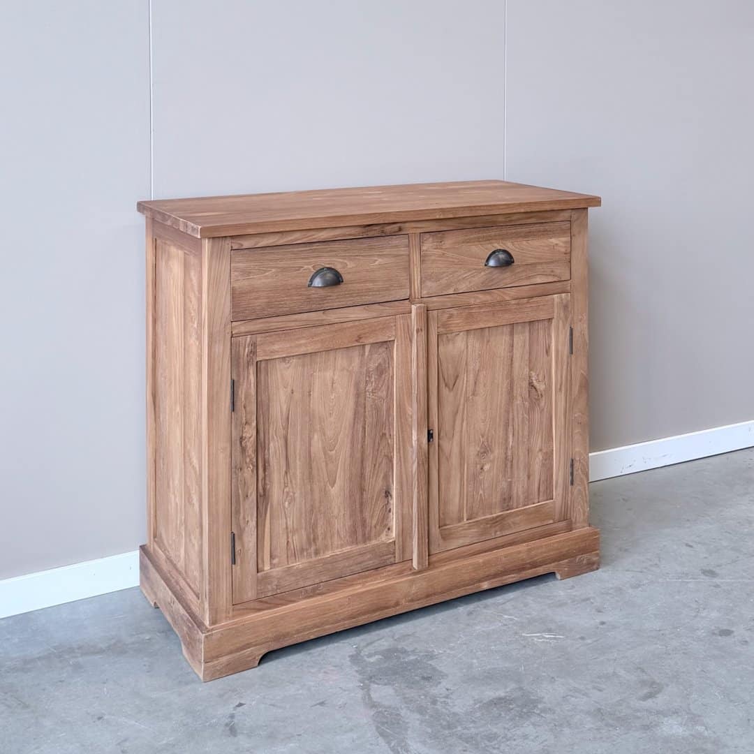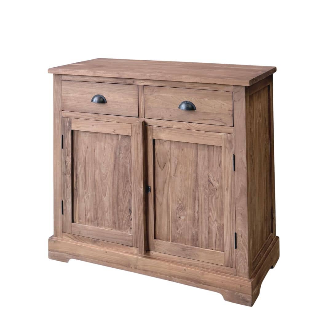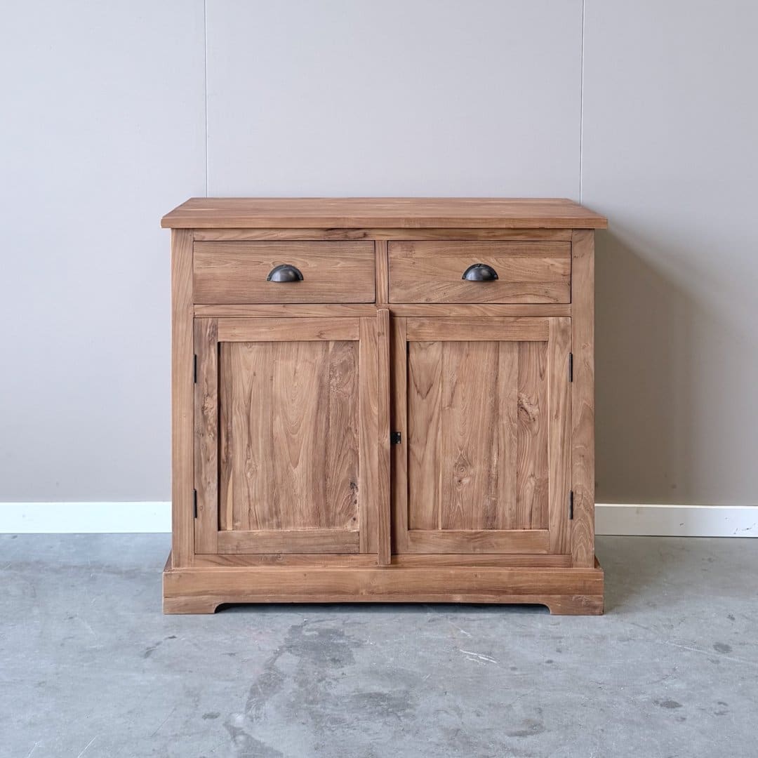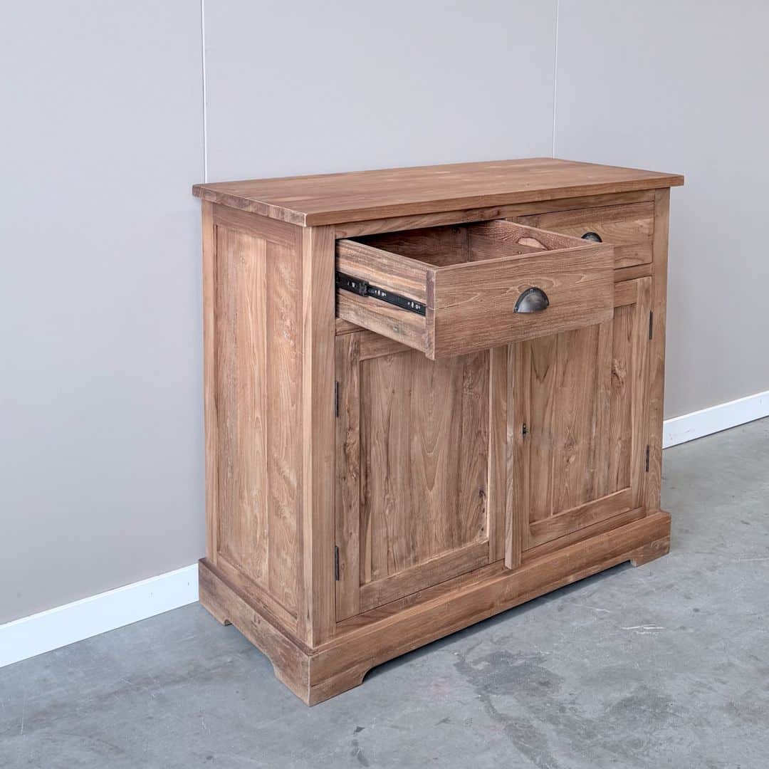 Dit landelijke dressoir is vervaardigd uit massief gerecycled teakhout en combineert karakter met functionaliteit. De warme houttinten en natuurlijke houtstructuur zorgen voor een tijdloze en sfeervolle uitstraling.
