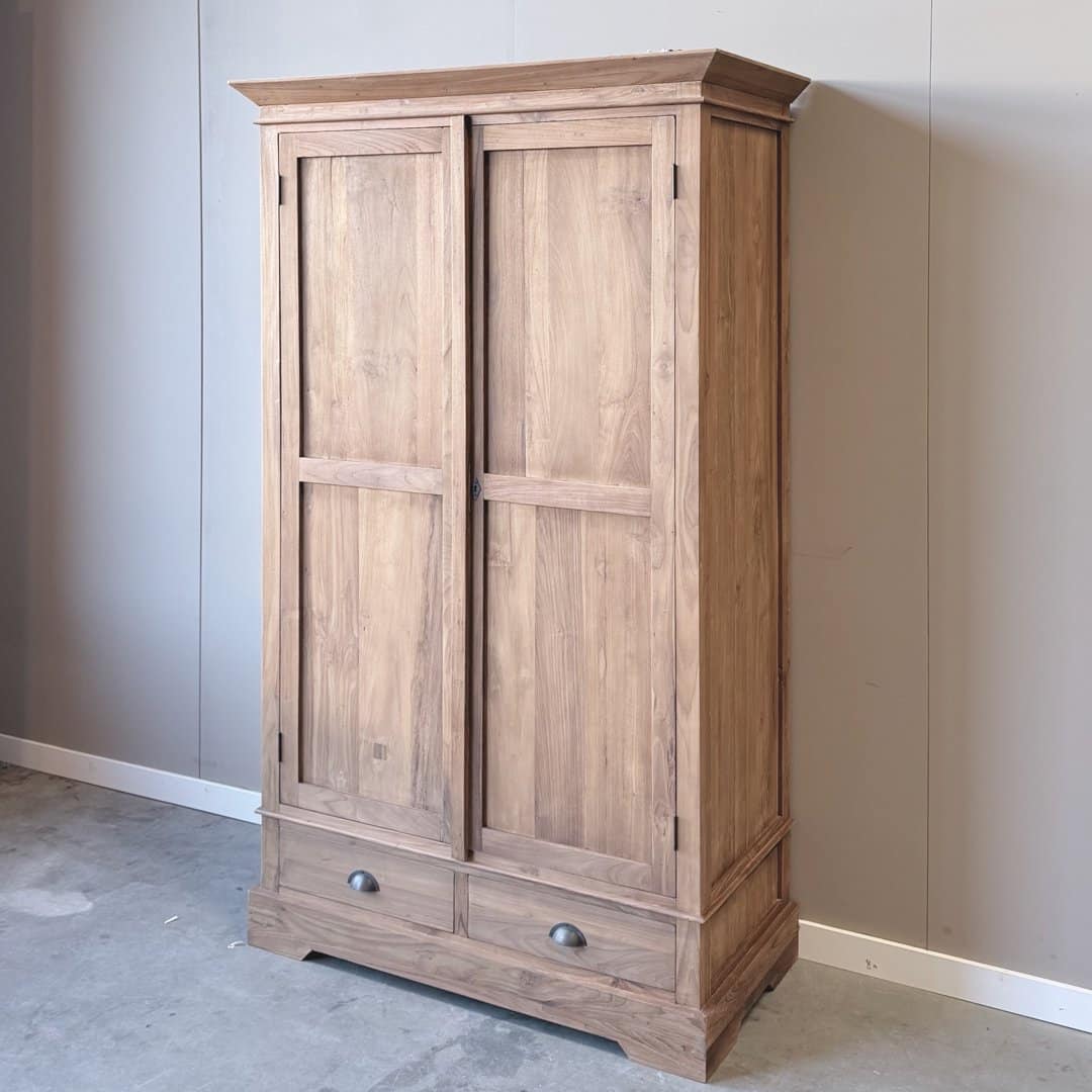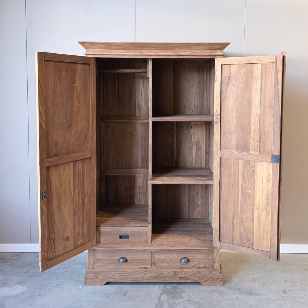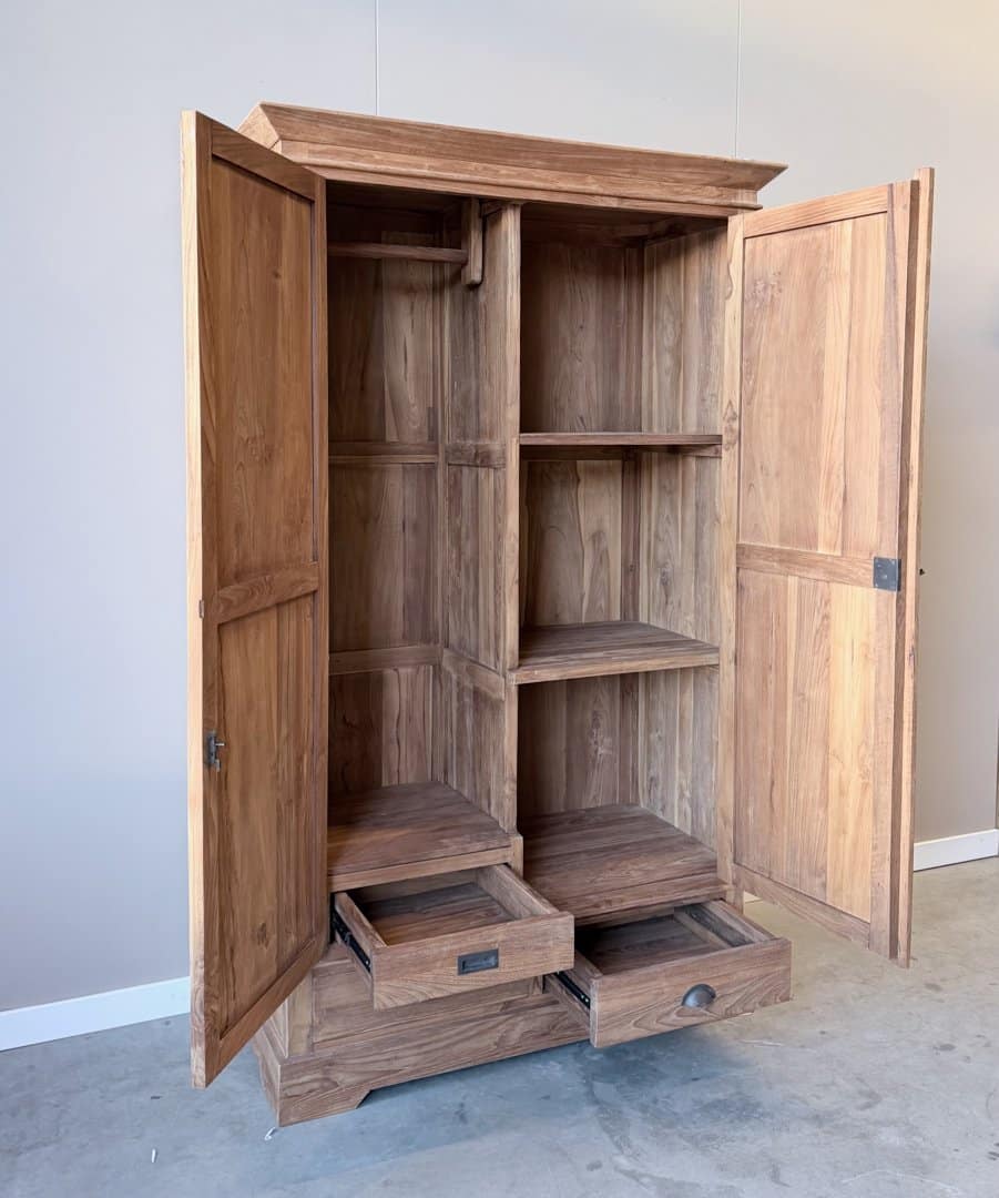 Deze stijlvolle linnenkast is gemaakt van de beste kwaliteit teakhout en biedt een ideale combinatie van elegantie en functionaliteit. Achter de deuren vindt u een slimme indeling: aan één zijde een roede om kleding op te hangen met een kleine lade onderin. Aan de andere zijde drie legplanken voor overzichtelijke opbergruimte. Aan de buitenzijde beschikt de kast bovendien over twee ruime laden, die soepel openen dankzij het metalen railsysteem.