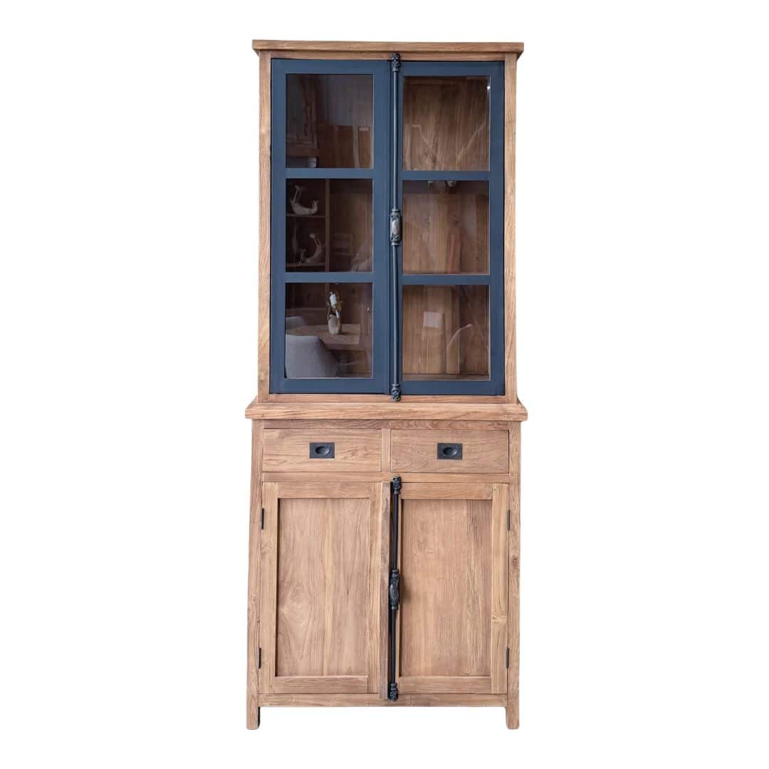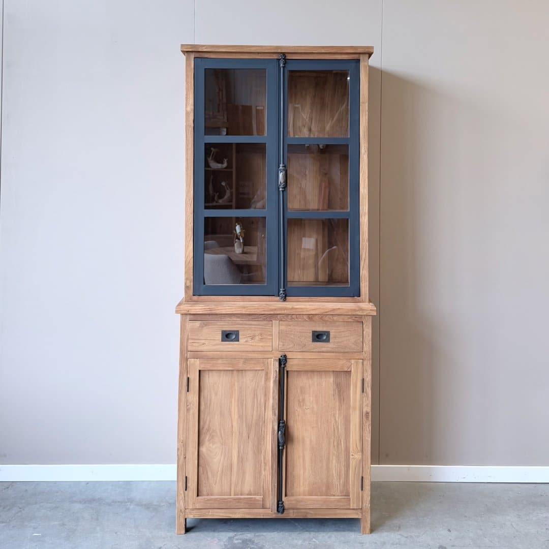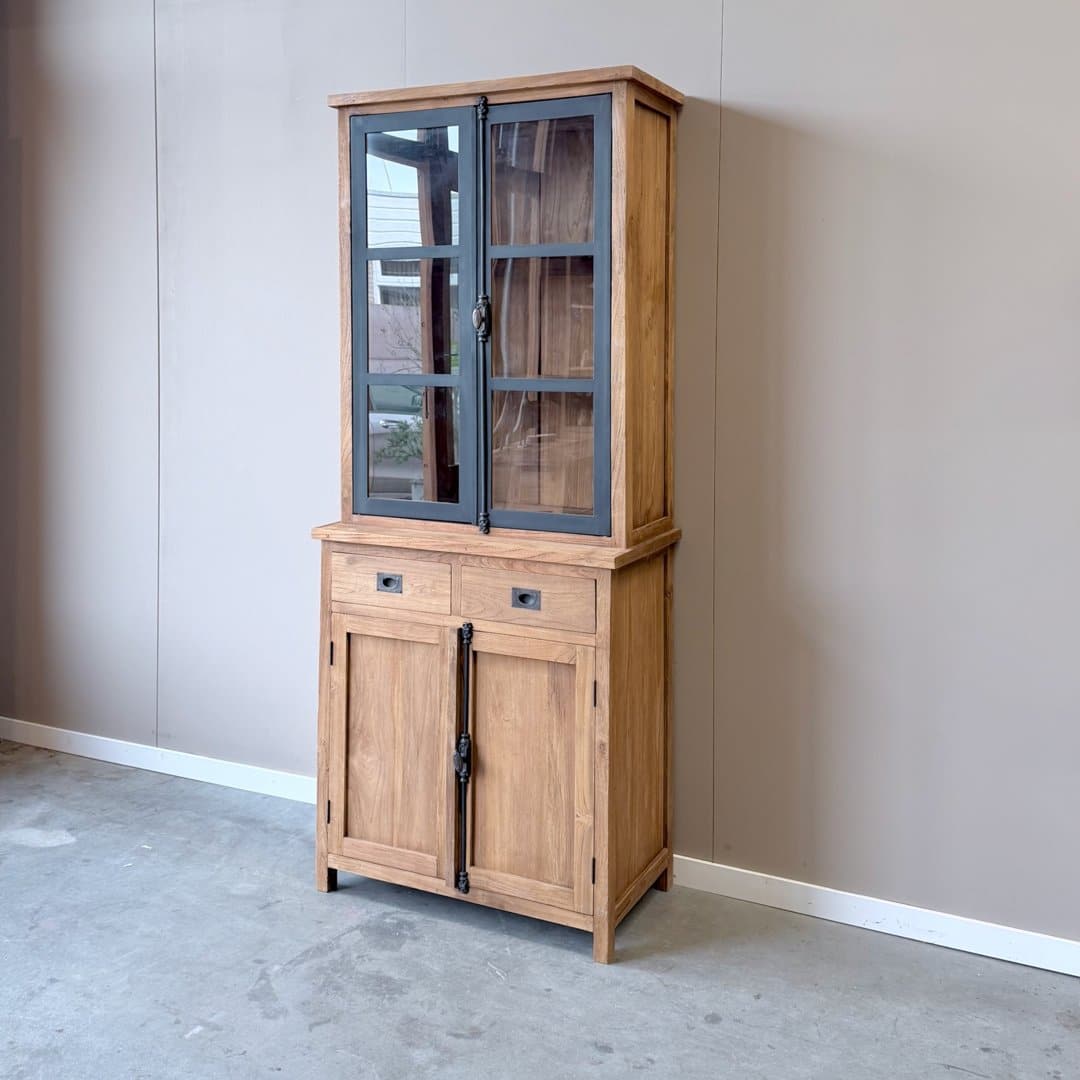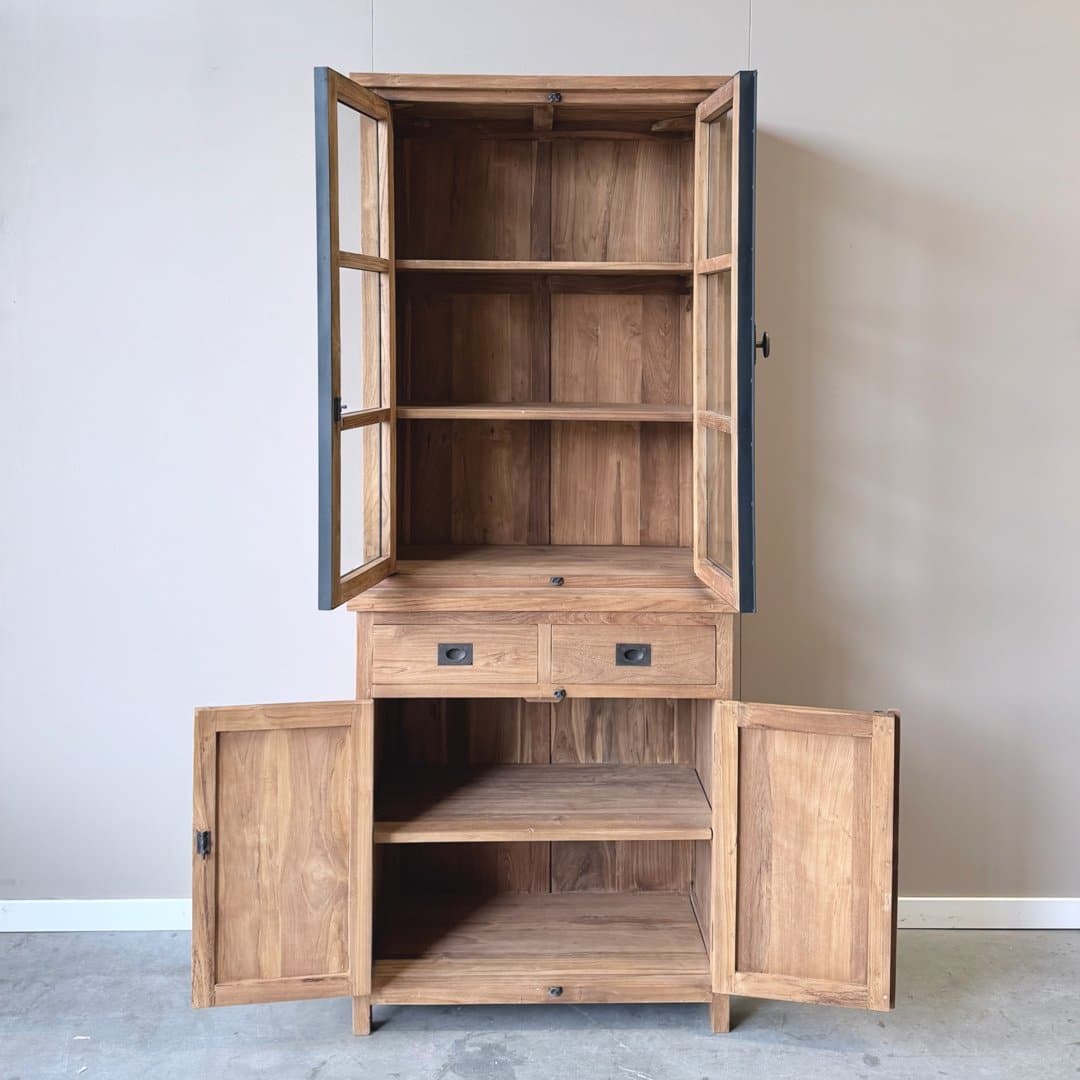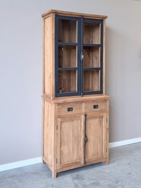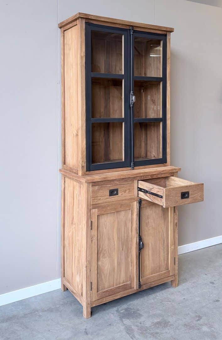 De kast heeft een bovenstuk met stalen vitrinedeuren voorzien van glas, waardoor servies, boeken of woonaccessoires zichtbaar maar beschermd worden opgeborgen. De stalen deuren zijn afgewerkt met spanjoletsluiting, wat een elegant detail toevoegt aan het industriële ontwerp. Daaronder bevinden zich twee diepe laden die extra opbergruimte bieden. Het onderste gedeelte heeft twee dichte houten deuren met daarachter een legplank, ideaal voor spullen die uit het zicht opgeborgen mogen worden.