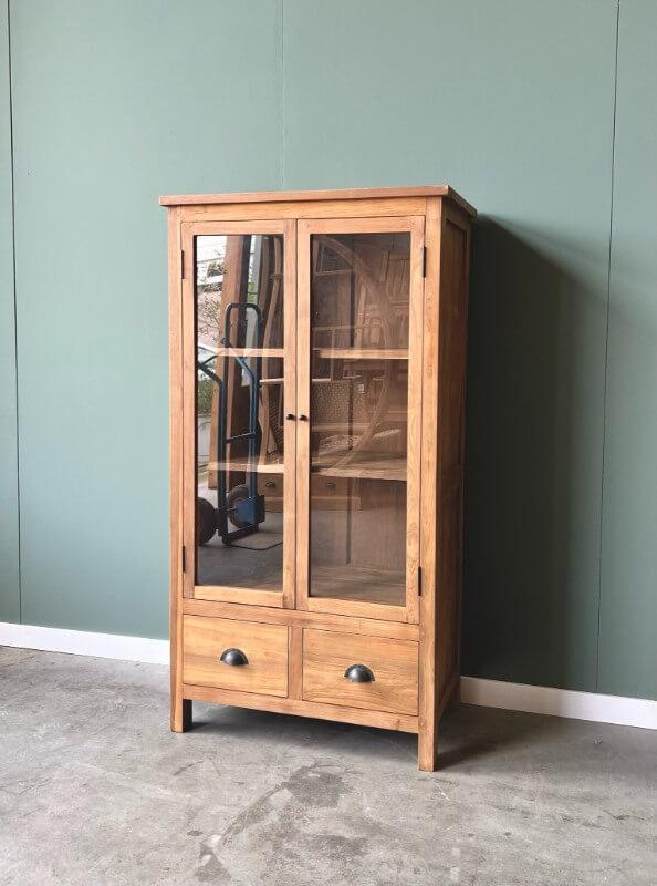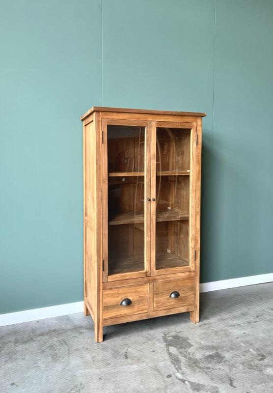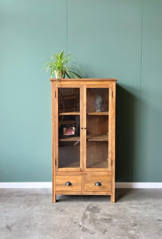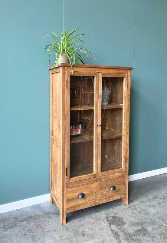 De Mini Teak Buffetkast is een compacte en stijlvolle kast, vervaardigd uit FSC-gecertificeerd gerecycled teakhout. Dankzij de unieke afmetingen is deze kast perfect te plaatsen tussen twee deuren of onder een trap, waardoor hij ideaal is voor kleinere ruimtes zonder in te leveren op opbergruimte.