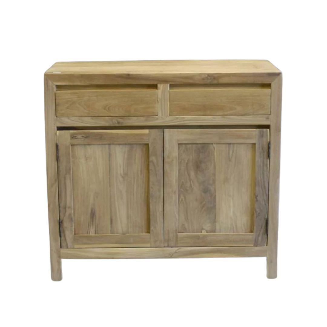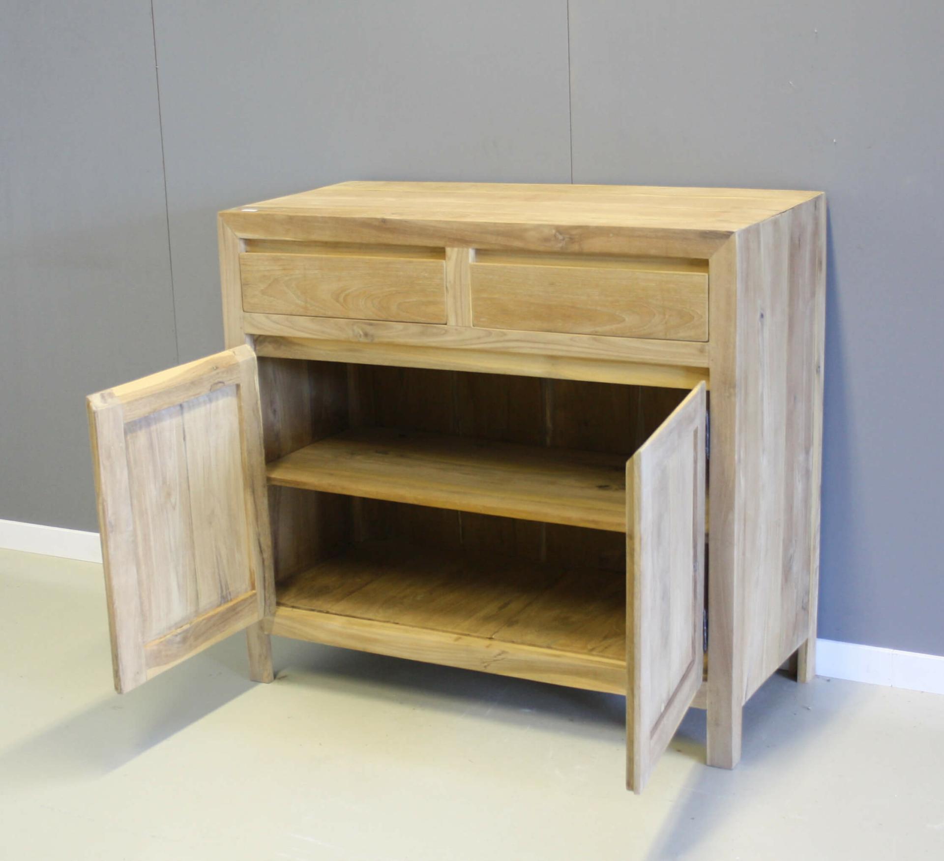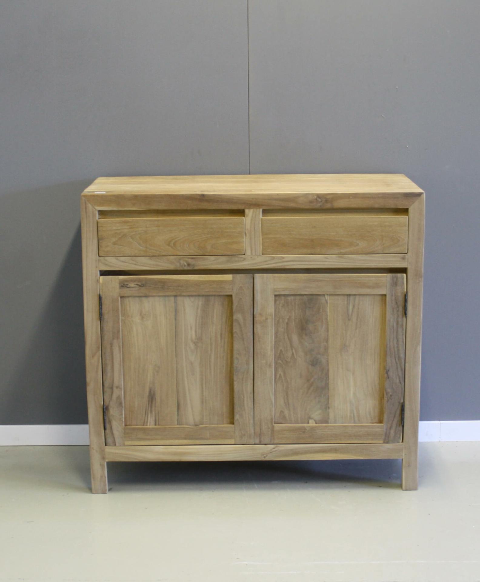 Dressoir van teakhout modern afgewerkt. Twee greeploze laden en normale draaideuren. Het dressoir is gemaakt van plantage hout.