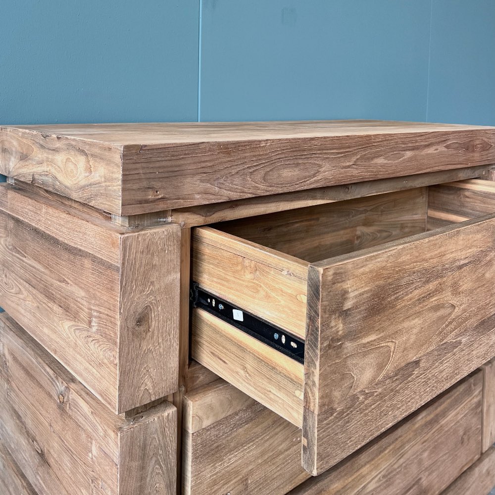 Wat jong teak bijzonder maakt, is de prachtige goudgele kleur en de rustige, egale uitstraling. Het hout heeft minder sporen van een vorig leven dan gerecycled teak en oogt daardoor strak en modern. Perfect voor wie houdt van een frisse, eigentijdse stijl. Voordat het hout verwerkt wordt, wordt het zorgvuldig geselecteerd en gedroogd. Dit helpt om de werking van het hout zoveel mogelijk te beperken en zorgt voor een stevig en duurzaam meubel.