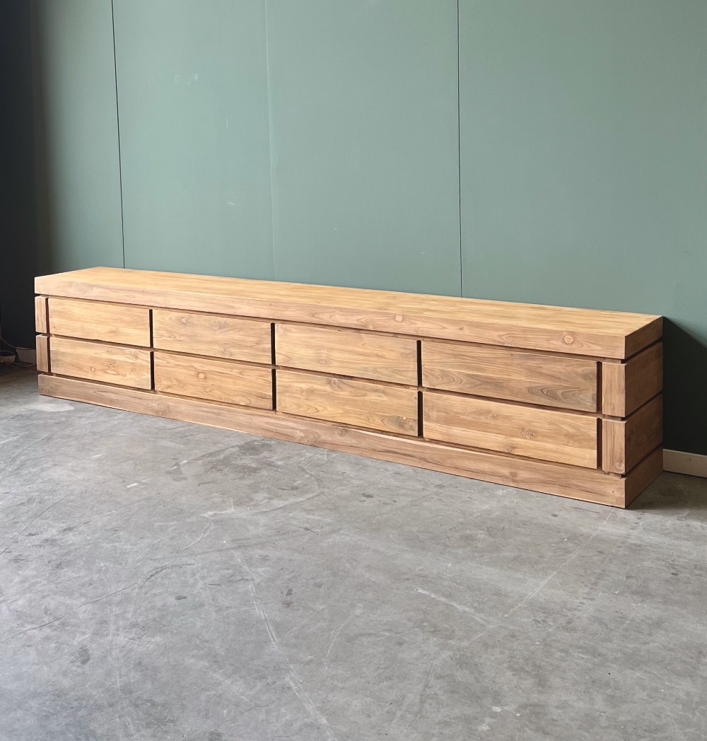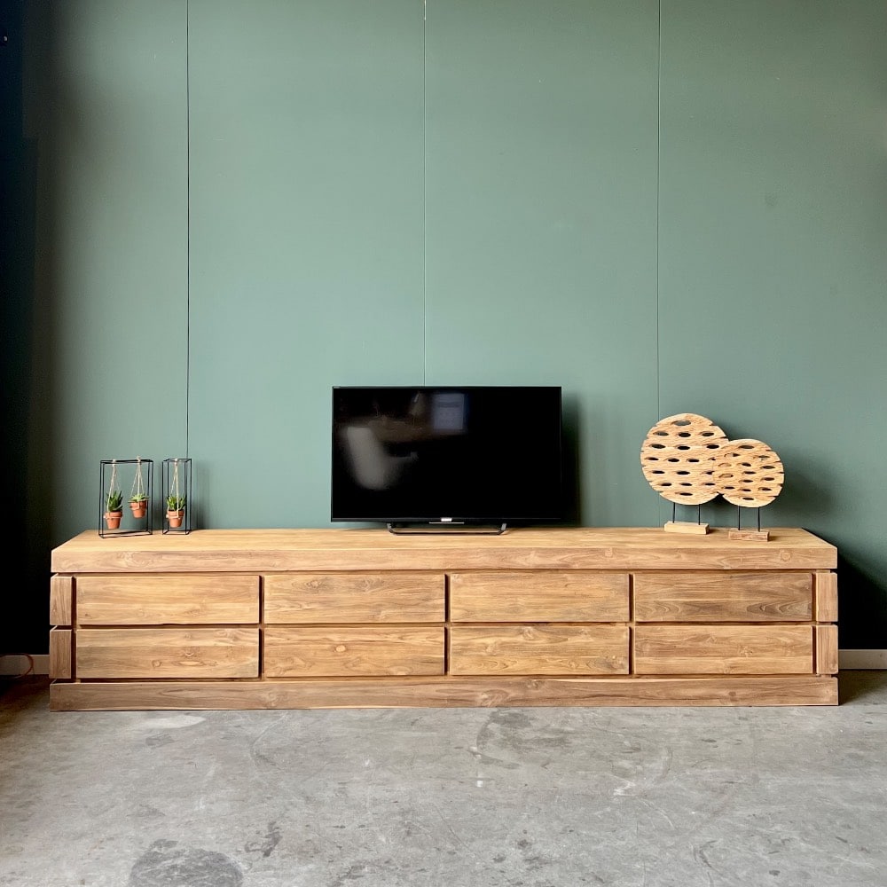 Modern vormgegeven tv-meubel gemaakt van uitstekende kwaliteit gerecycled teakhout. Het meubel heeft laden en een klep voor de apparatuur. Het hout is iets ruiger gelaten voor een robuust effect.
