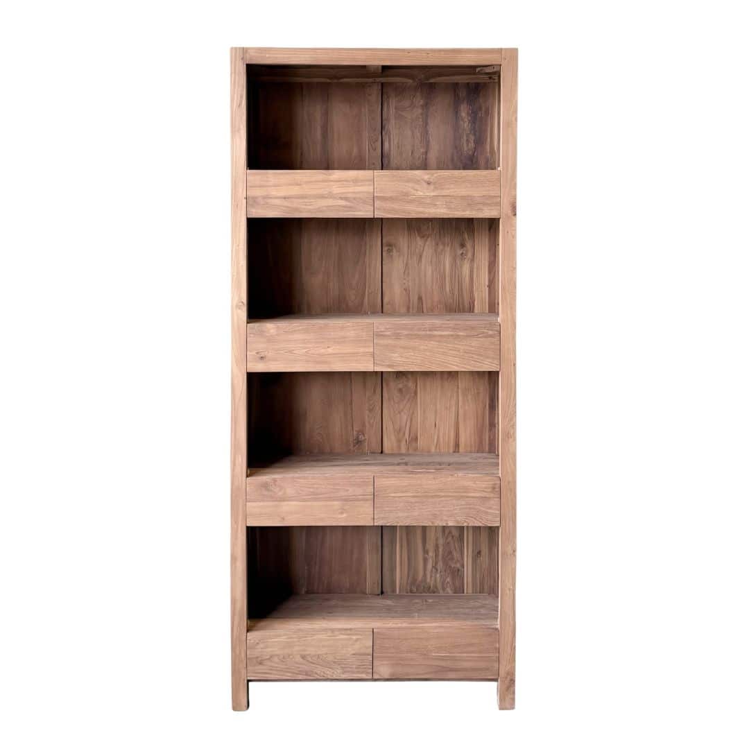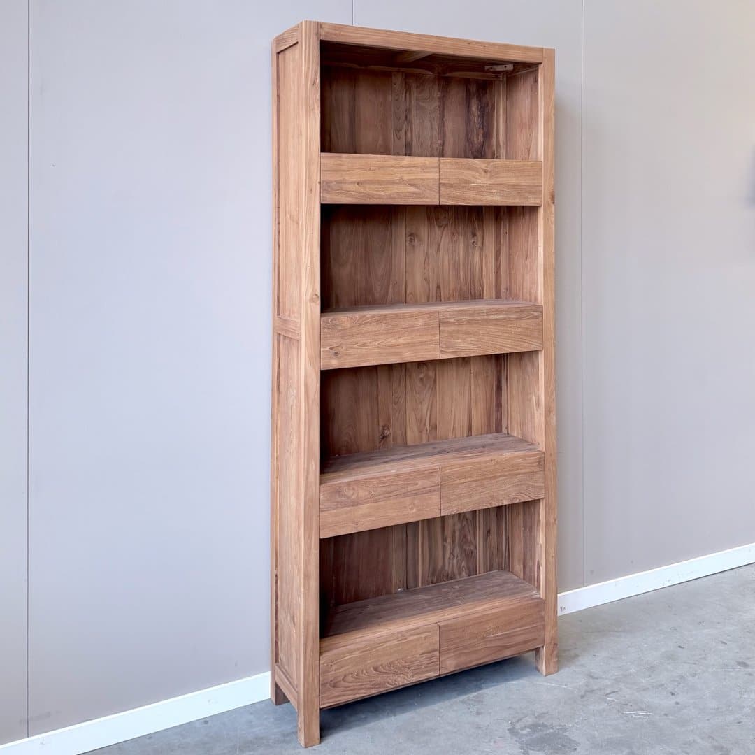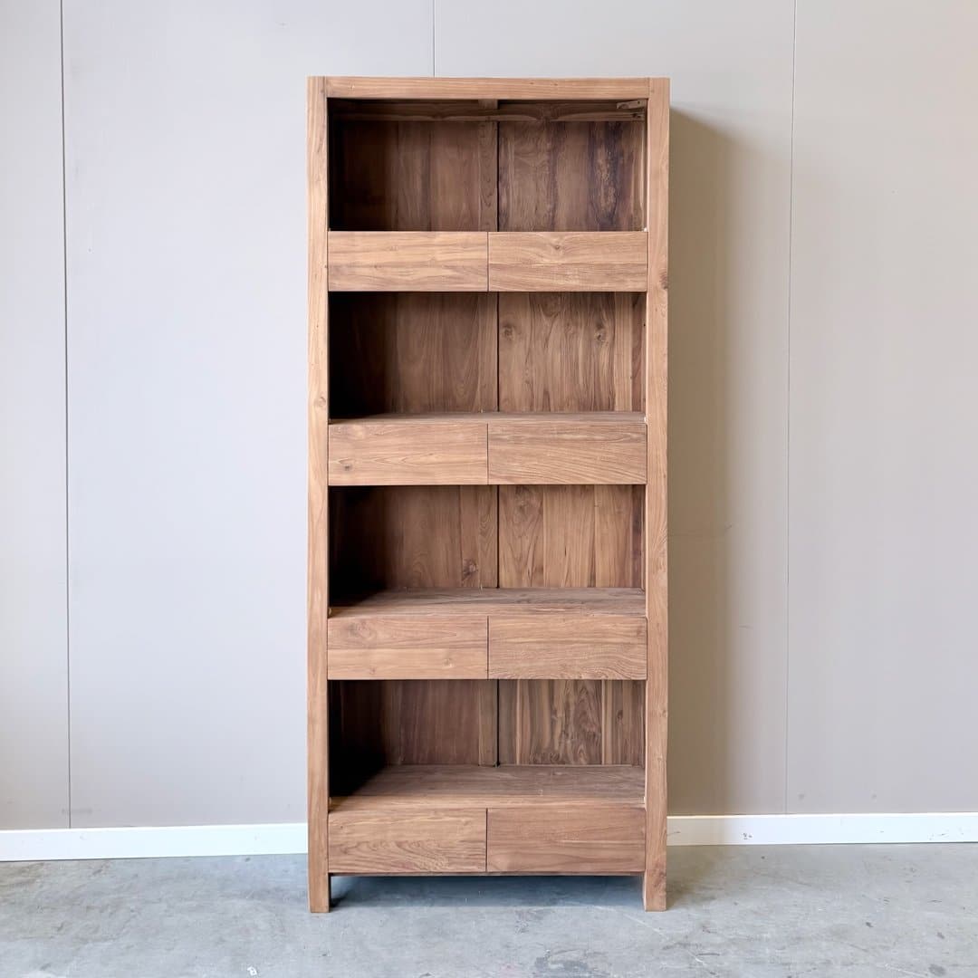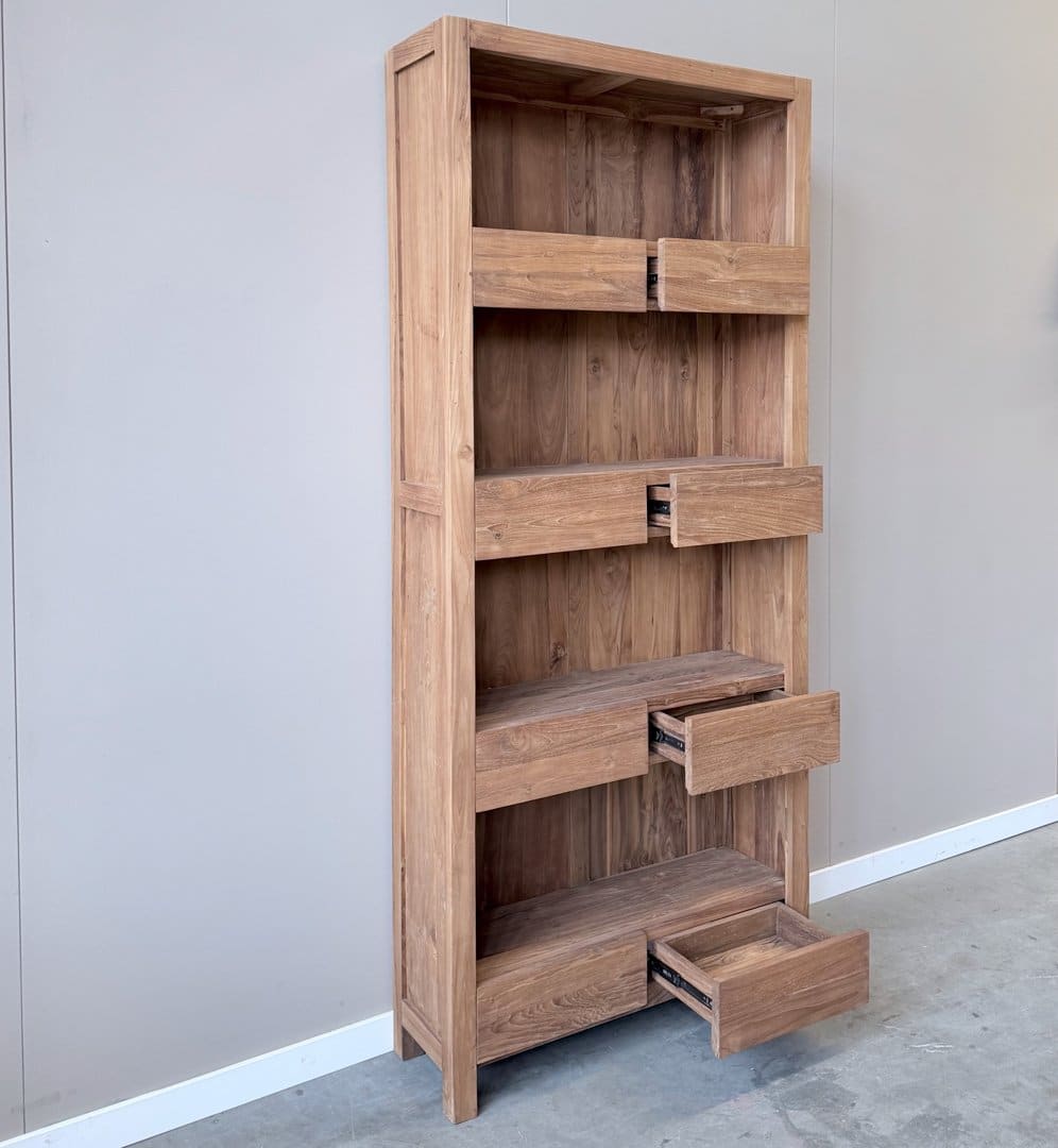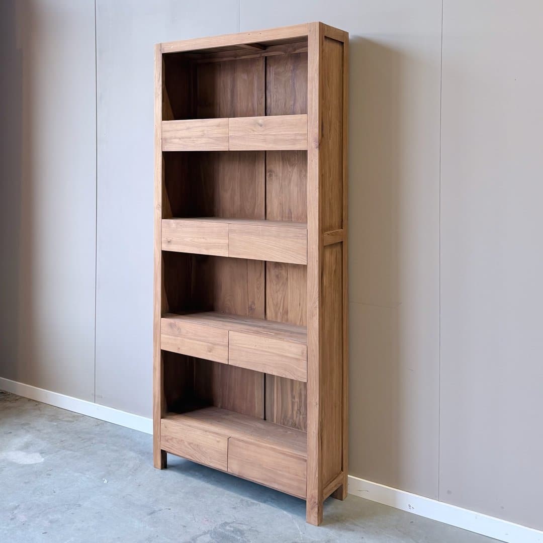 Deze moderne boekenkast van gerecycled teakhout met 8 laden combineert een strak ontwerp met de warme uitstraling van massief hout.