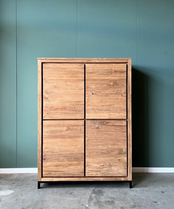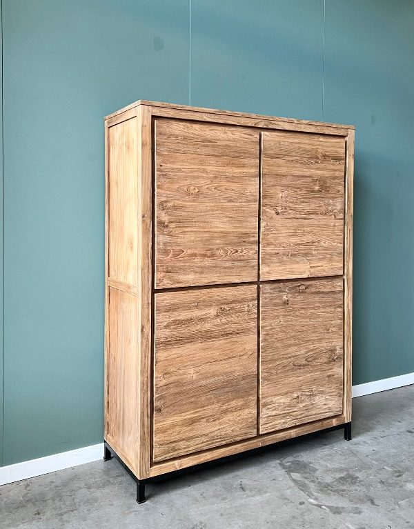 De licht opgeruwde teakhouten deuren geven de kast een stoere, natuurlijke uitstraling. Achter deze gesloten deuren vind je verrassend veel bergruimte voor servies, administratie of kinderspeelgoed. Alles blijft netjes uit het zicht wanneer er bezoek komt, ideaal voor een opgeruimd huis.