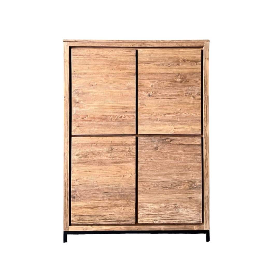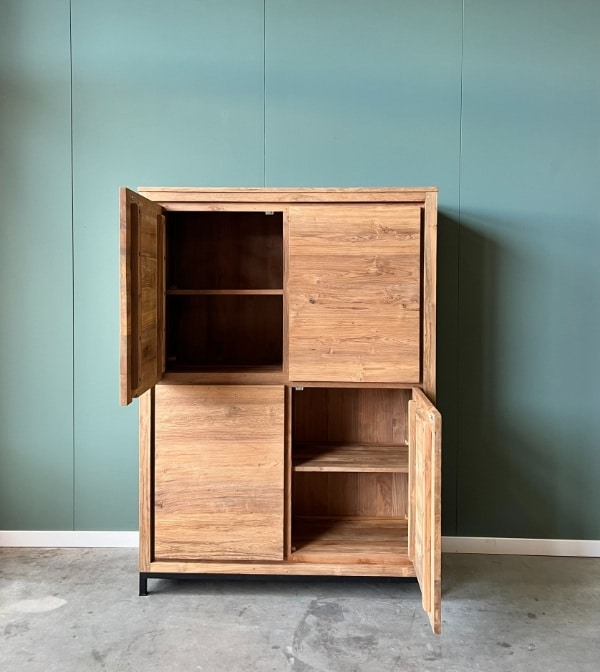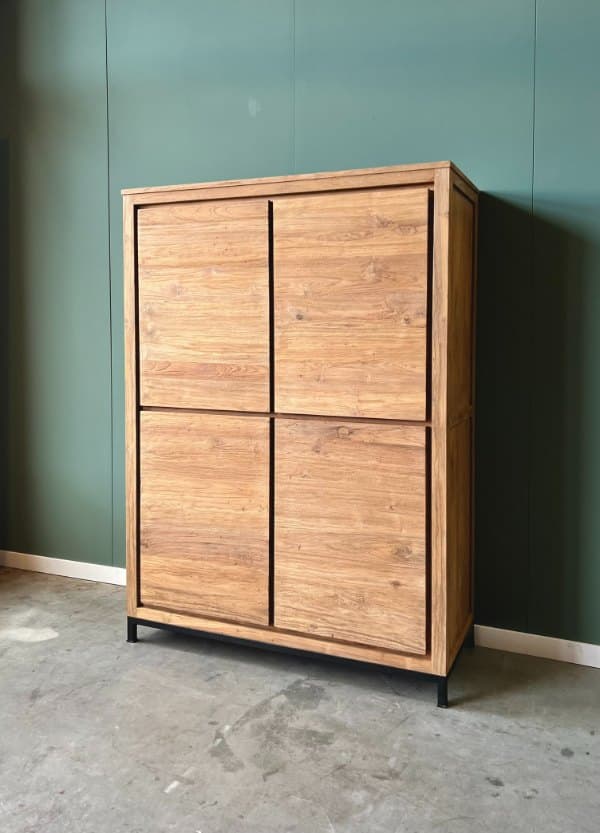 De licht opgeruwde teakhouten deuren geven de kast een stoere, natuurlijke uitstraling. Achter deze gesloten deuren vind je verrassend veel bergruimte voor servies, administratie of kinderspeelgoed. Alles blijft netjes uit het zicht wanneer er bezoek komt, ideaal voor een opgeruimd huis.
