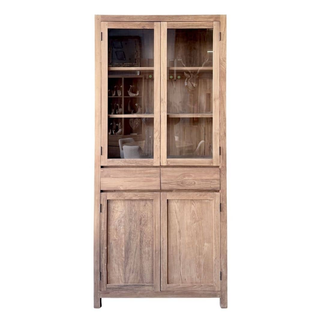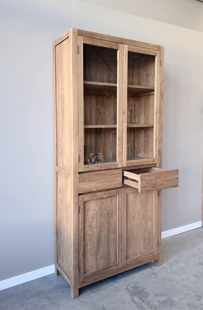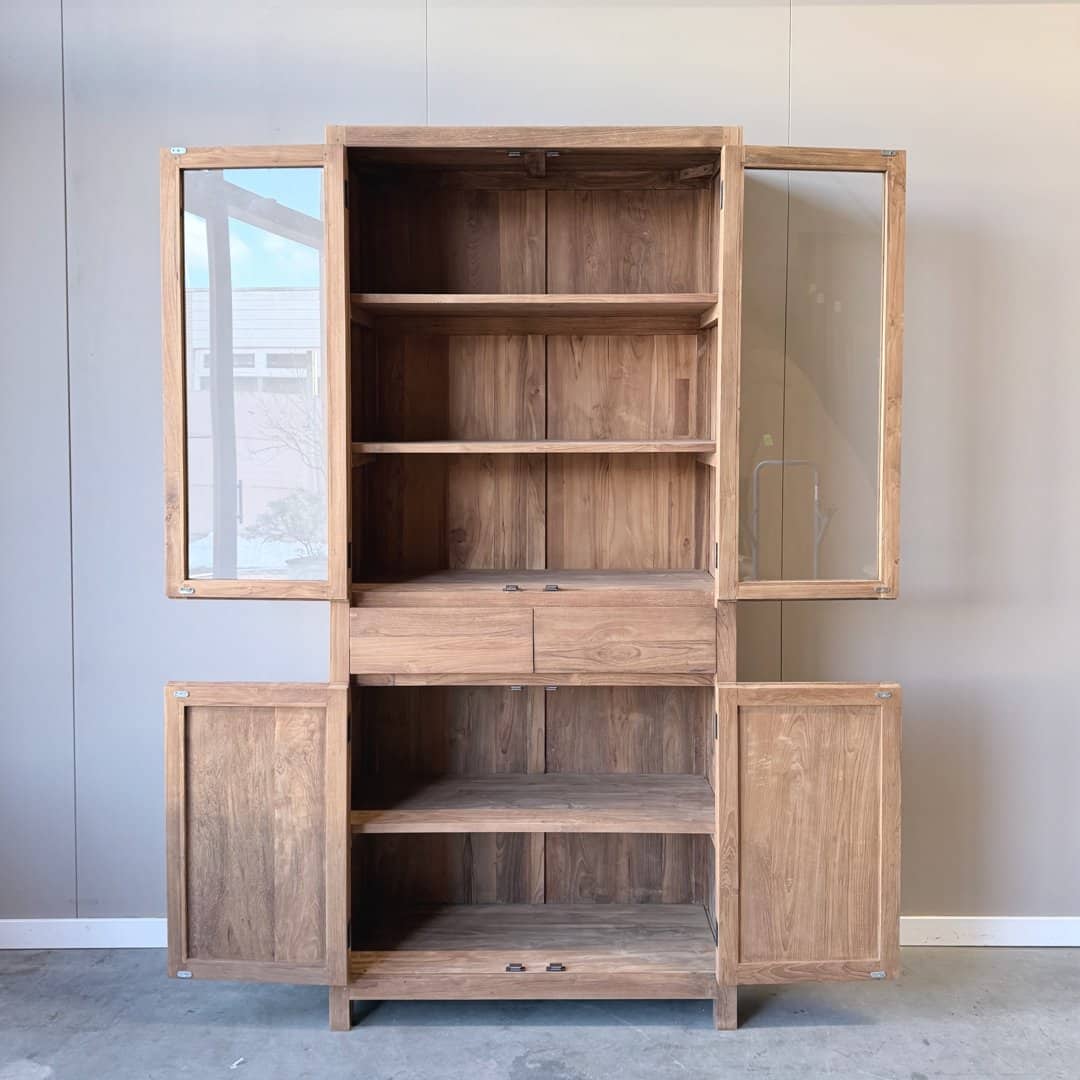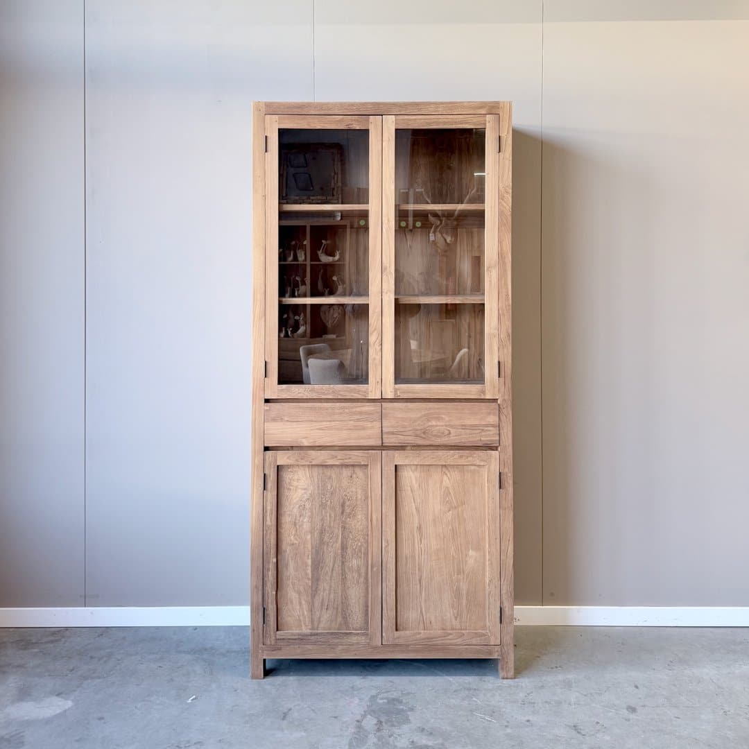 Deze buffetkast van gerecycled teakhout combineert warmte en karakter met praktische opbergruimte. Het moderne ontwerp met glasdeuren boven en gesloten kastruimte onder past perfect in een modern interieur.