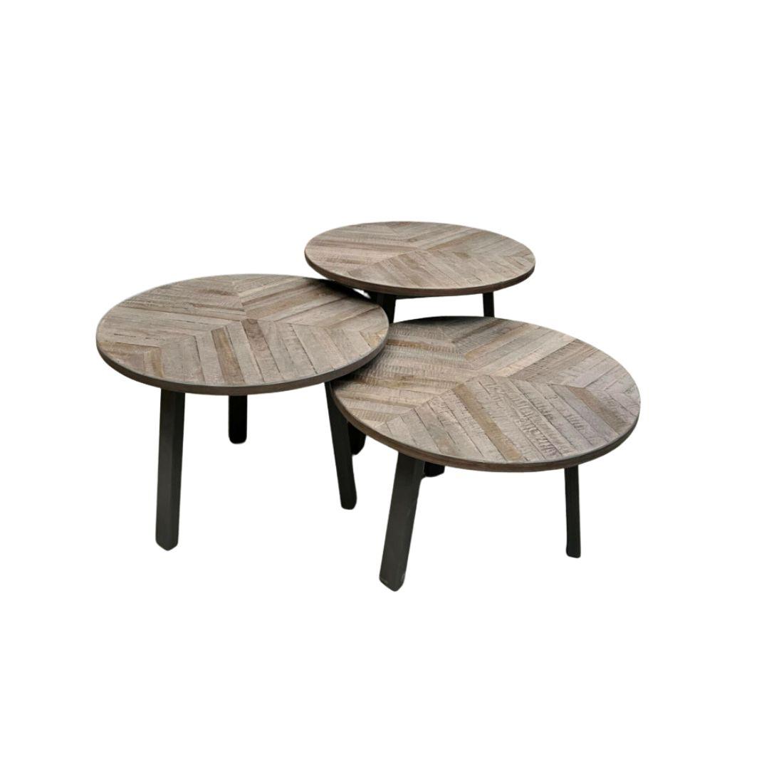 Set van 3 salontafels. De combinatie van staal en teakhout geeft een industriële uitstraling aan uw interieur.