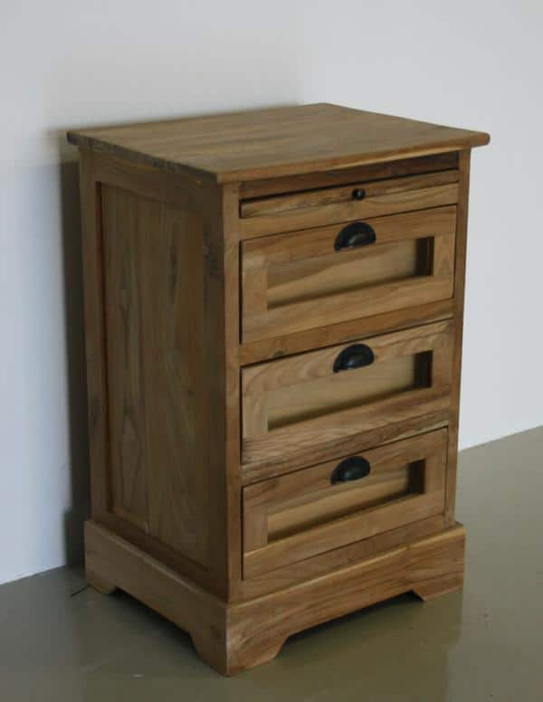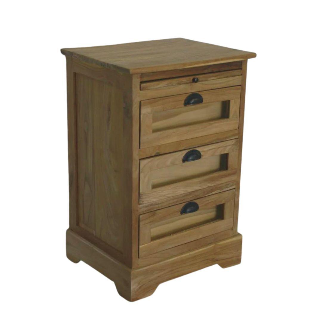 Nachtkastje met drie laden waar glas in is verwerkt. Achter het glas zit een houten schotje zodat de inhoud van de lade niet zichtbaar is. Het kastje heeft boven de laden ook nog een uitschuifbaar plankje.