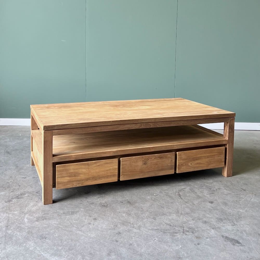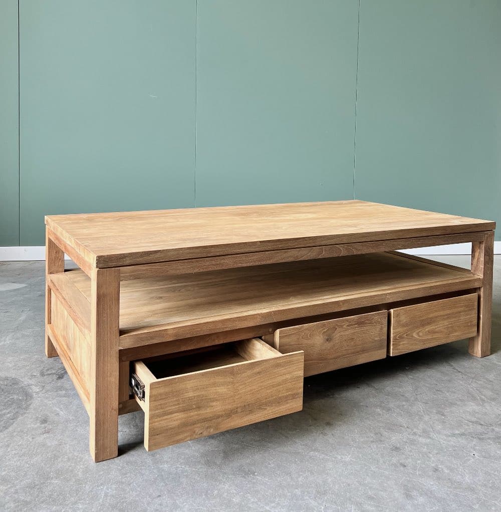 Deze moderne salontafel met greeploze laden is gemaakt van gerecycled teakhout en zijn 45cm hoog.