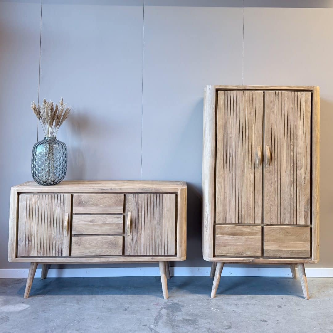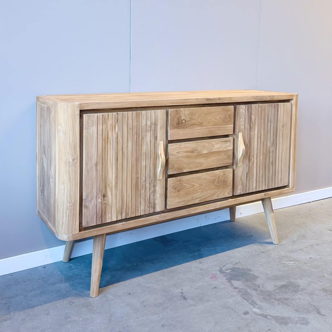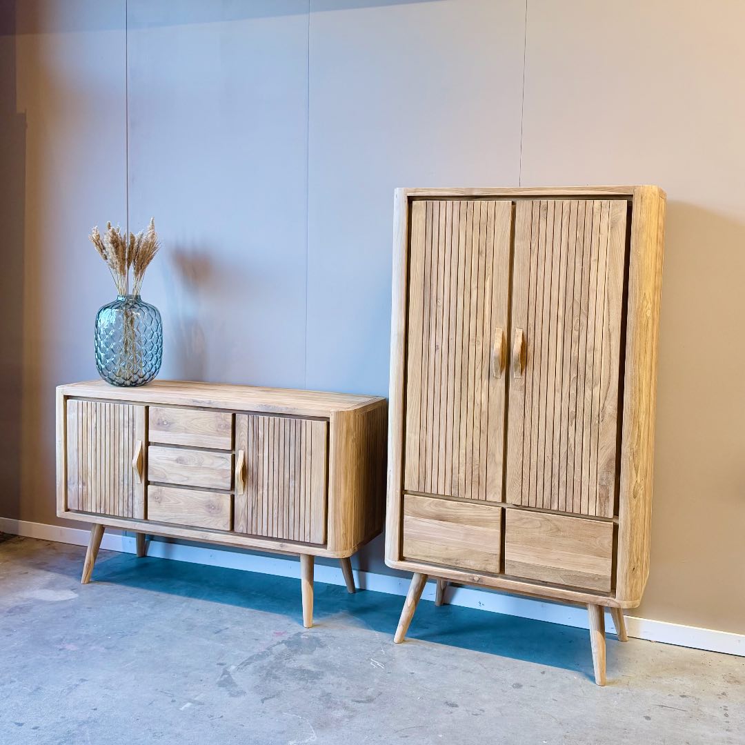 Gemaakt van duurzaam FSC-gecertificeerd teakhout is dit dressoir niet alleen een sfeervolle toevoeging aan je interieur, maar ook een bewuste keuze. Leverbaar in 150 cm en 200 cm breed, waardoor je altijd de variant vindt die perfect aansluit bij jouw woonruimte. Een unieke mix van nostalgie en eigentijds design – met volop opbergruimte voor al je spullen.