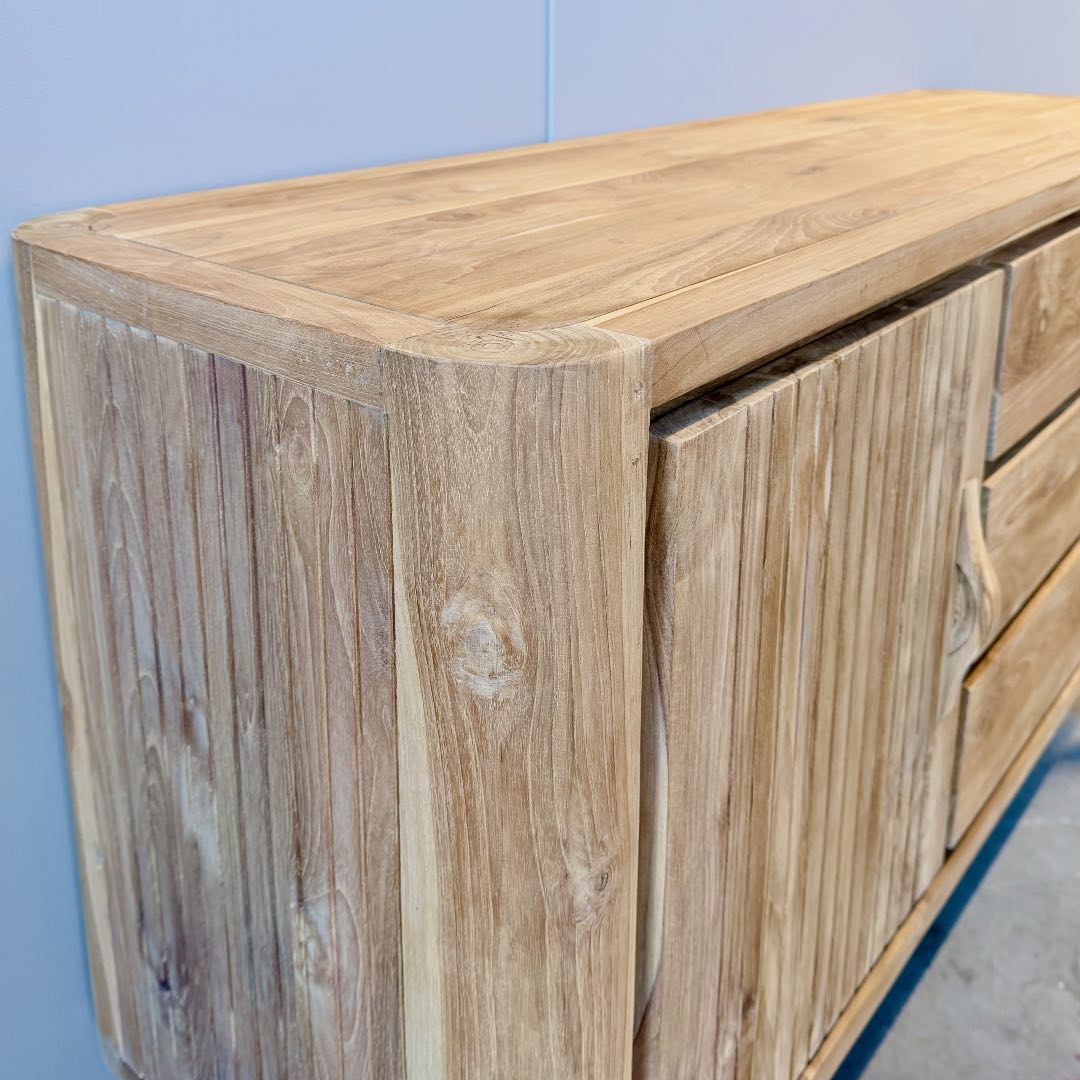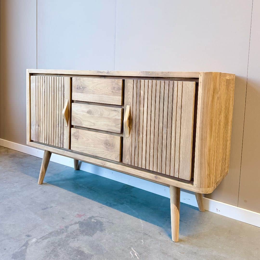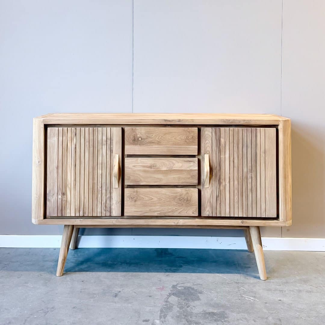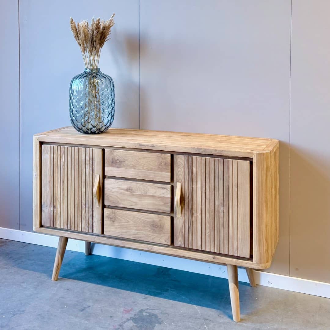 Gemaakt van duurzaam FSC-gecertificeerd teakhout is dit dressoir niet alleen een sfeervolle toevoeging aan je interieur, maar ook een bewuste keuze. Leverbaar in 150 cm en 200 cm breed, waardoor je altijd de variant vindt die perfect aansluit bij jouw woonruimte. Een unieke mix van nostalgie en eigentijds design – met volop opbergruimte voor al je spullen.
