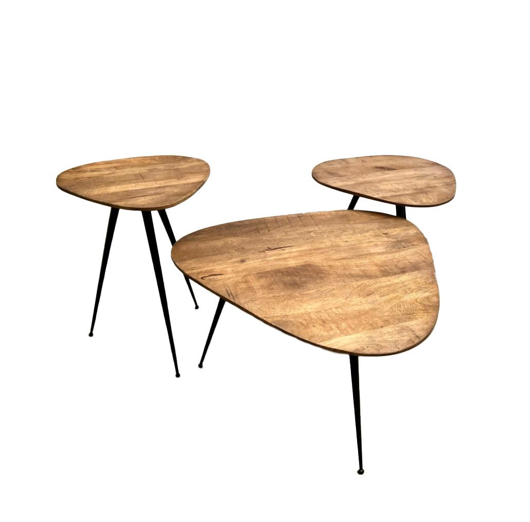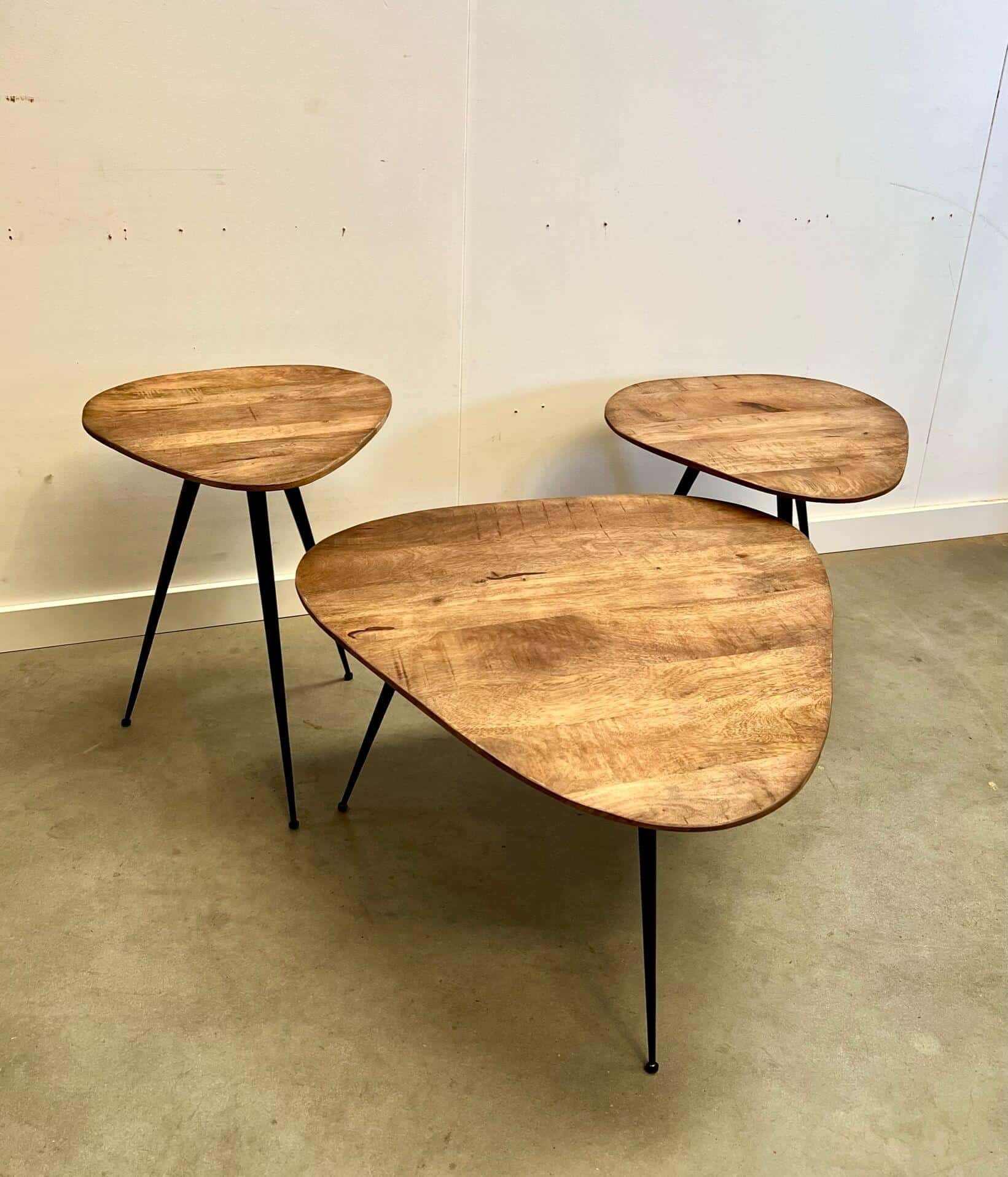 Speelse set van 3 salontafels gemaakt van mangohout.
