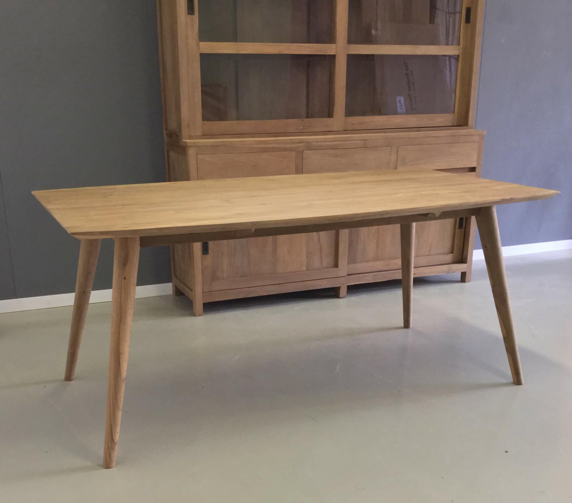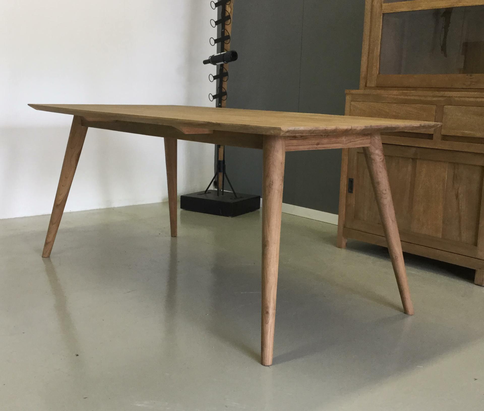 Bijzonder fraaie teak tafel met ronde poten en een verjongde rand. Een plaatje om te zien. Bij deze tafel zijn bijpassende stoelen te koop.