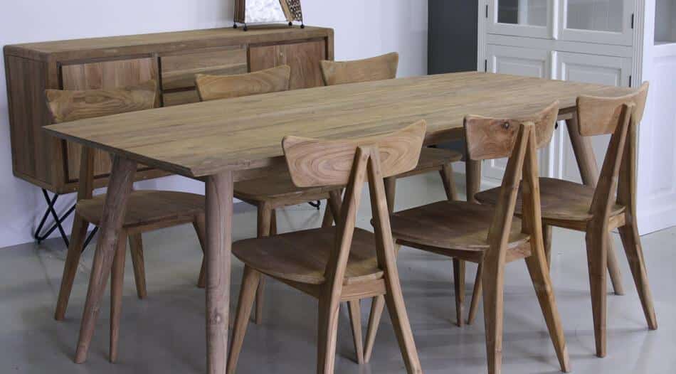 Gerecycled teakhout is afkomstig uit oude slooppanden. De panden worden gesloopt en het hout wordt verzameld en klaargemaakt voor hergebruik. Dit betekend dat spijkers verwijderd worden en oude verfresten worden eraf geschuurd. De gaatjes worden opgevuld en het hout is nu klaar voor verder gebruik. Soms kan het voorkomen dat er aan de binnenkant of achterkant van het meubel nog verfresten zitten. Dit zorgt er dus voor dat elk meubelstuk uniek is, ondanks dat het model wel het zelfde is. Verder is gerecycled teakhout beter voor het milieu. Er worden namelijk geen bomen gekapt. Daarnaast zal het hout minimaal gaan werken. Houd er rekening mee dat het een natuurlijk product is en er dus altijd kans is dat het wel zal gaan werken.