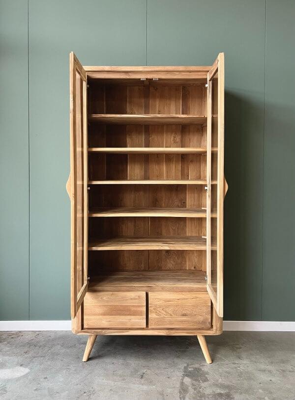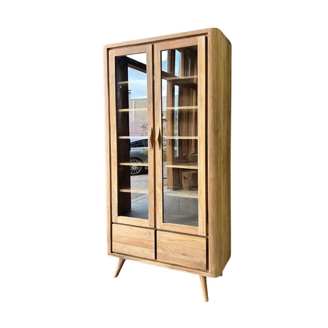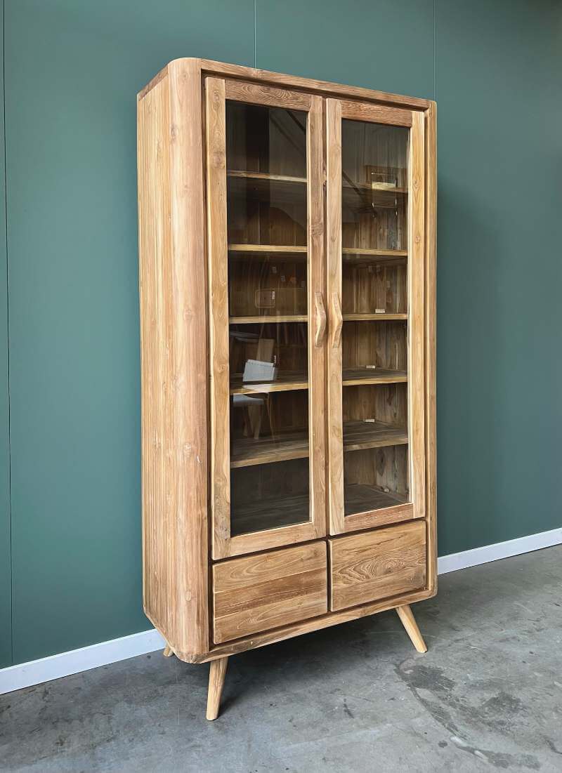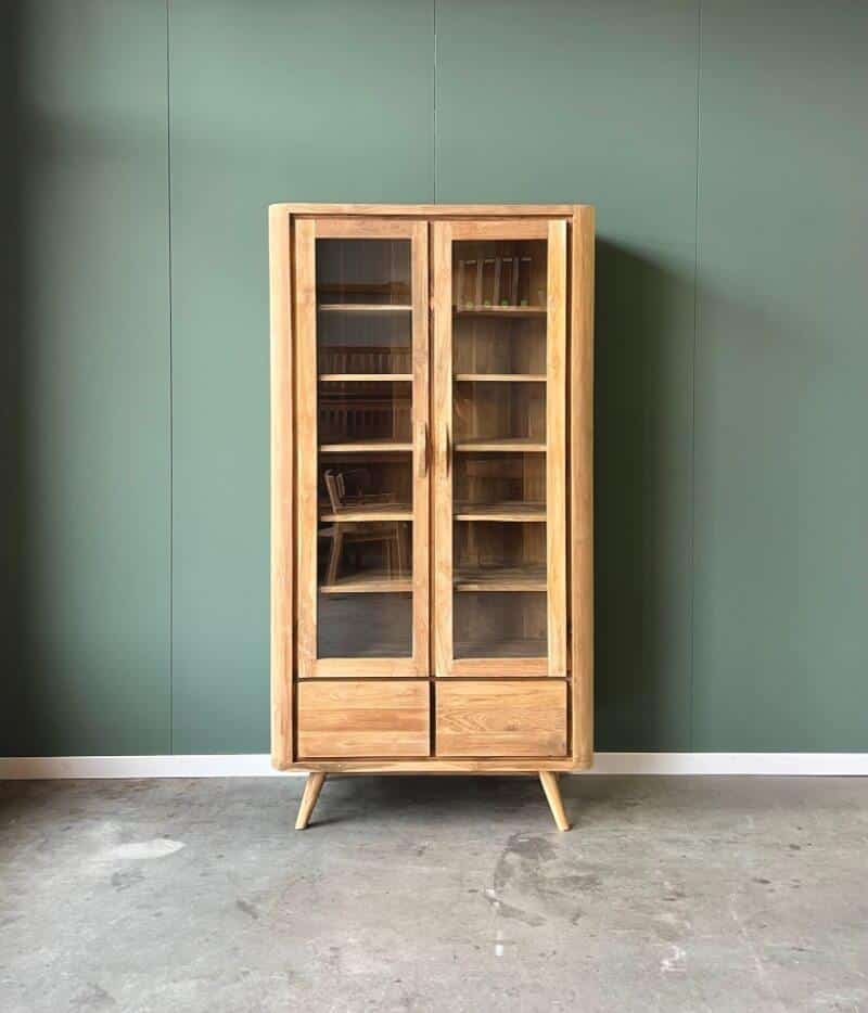 De Retro Vitrinekast Jaren 50 is een stijlvolle kast van FSC-gecertificeerd gerecycled teakhout die warmte en karakter toevoegt aan elke ruimte. De kast heeft retro poten, die zorgen voor een speels en authentiek jaren 50-effect, en geeft zo een uniek accent aan je interieur.